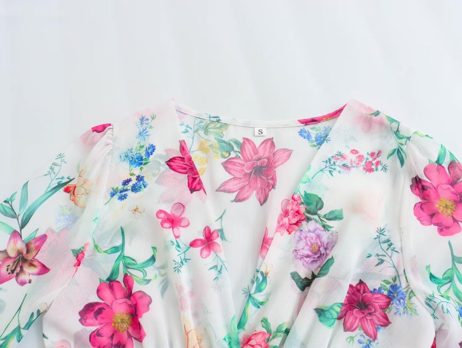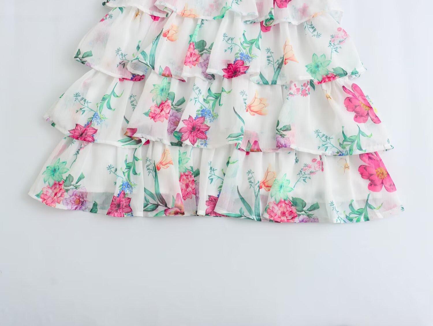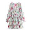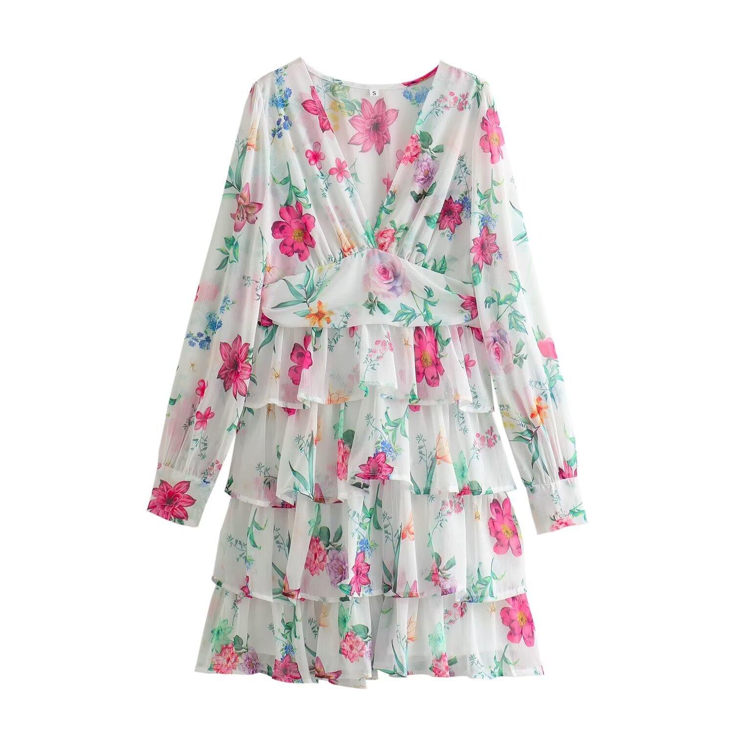 Venta al por mayor 2024 primavera nuevo estilo europeo y americano vestido de pastel escalonado de chifón con estampado de flores de manga larga para mujer