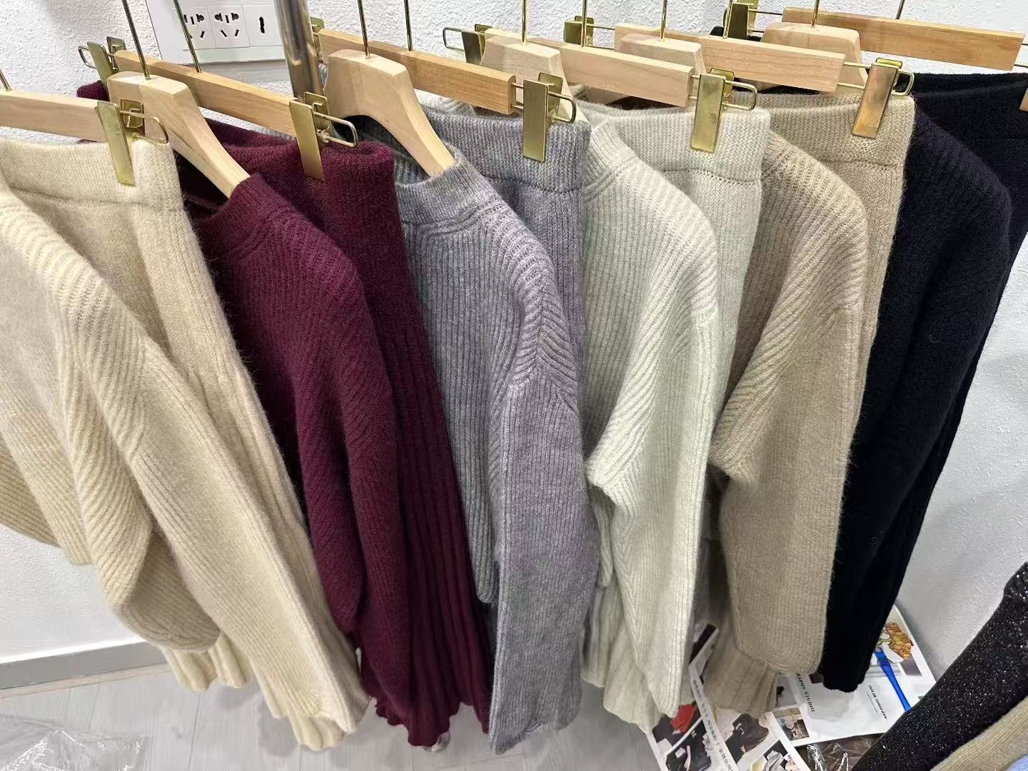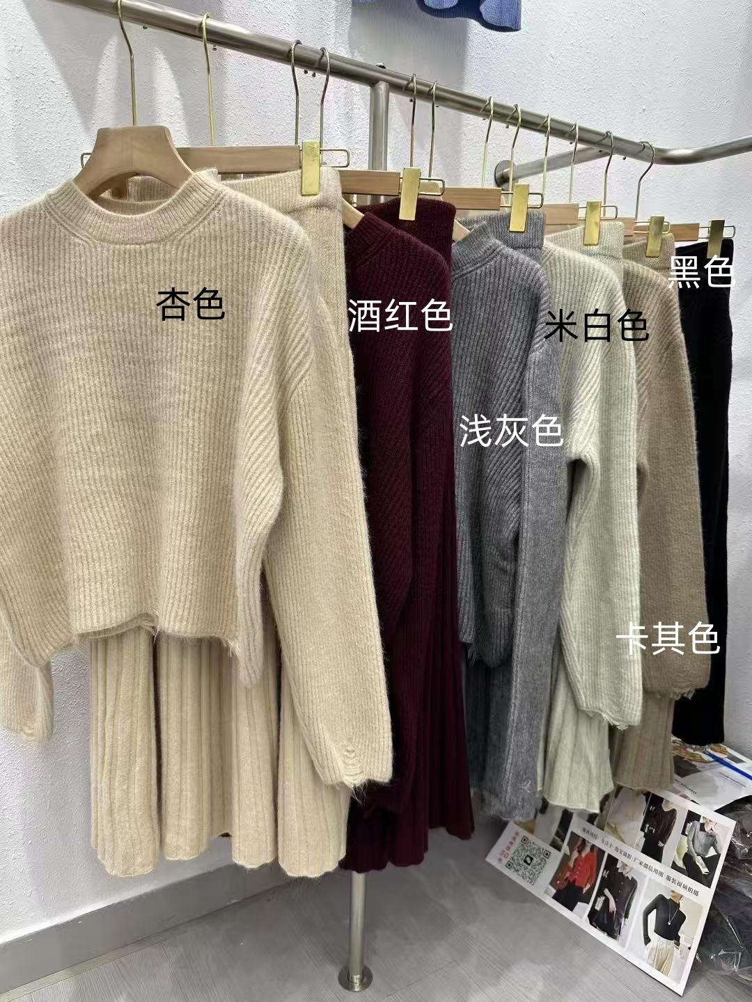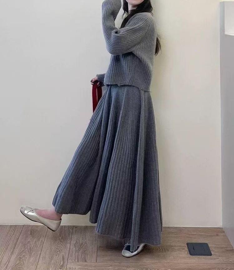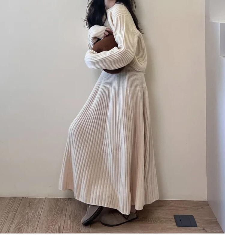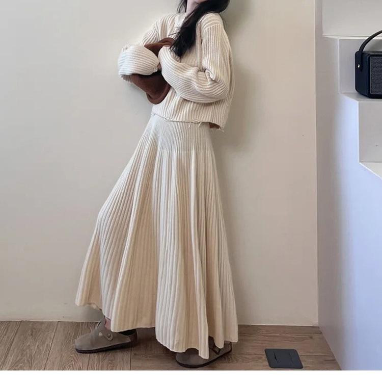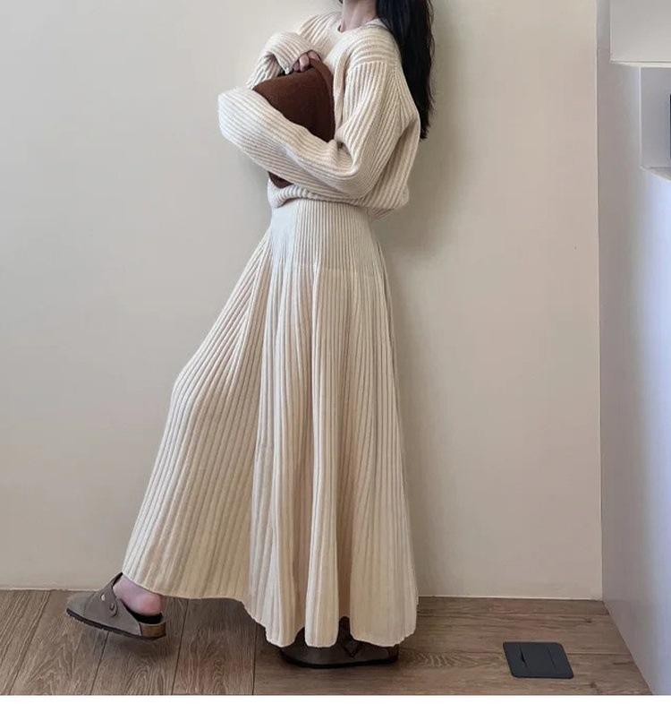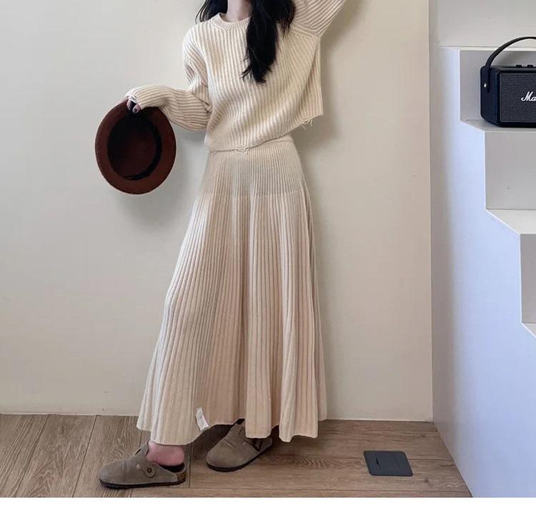 Conjunto de suéter de punto de alta gama estilo coreano para mujer nuevo otoño temprano 2025 top de estilo simple y holgado falda midi conjunto de dos piezas