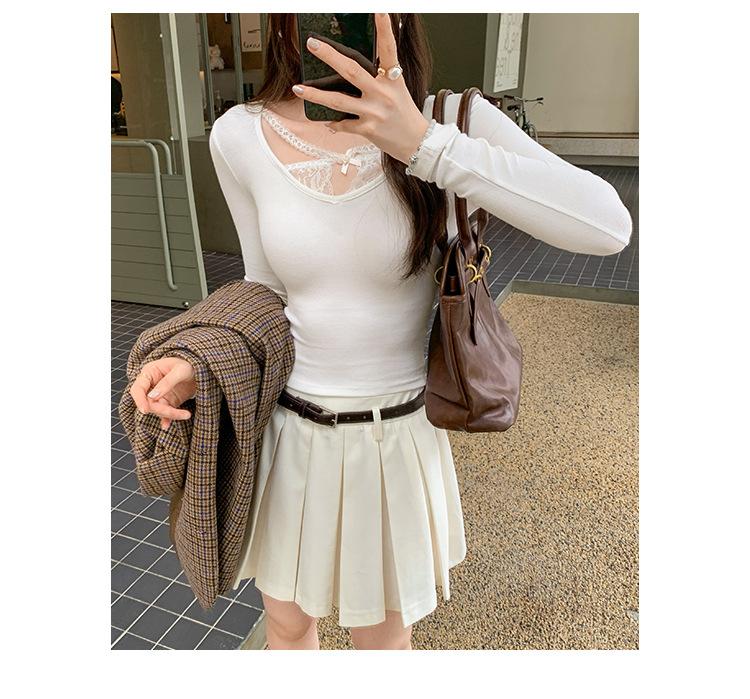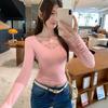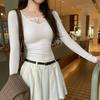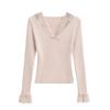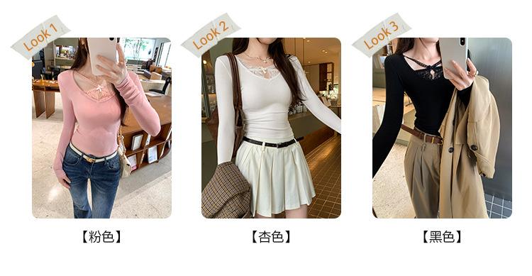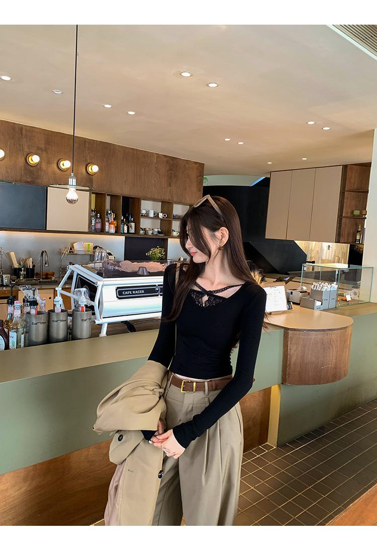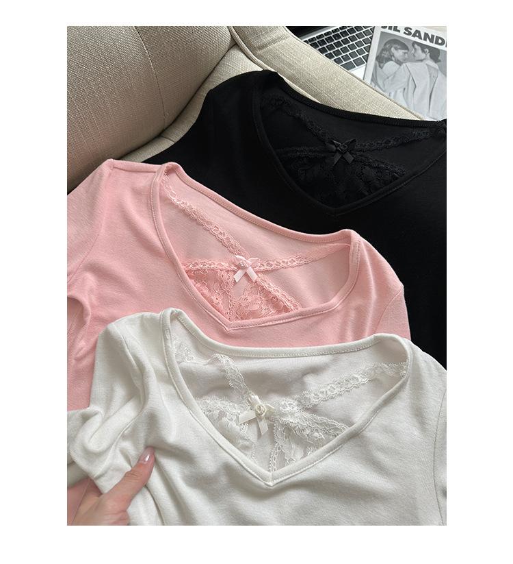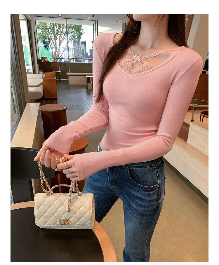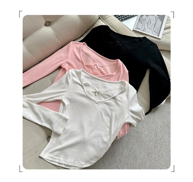 Sexy rosa puro deseo encaje patchwork ajuste ceñido camiseta manga larga mujer 2025 otoño nuevo diseño cintura pellizcada top