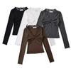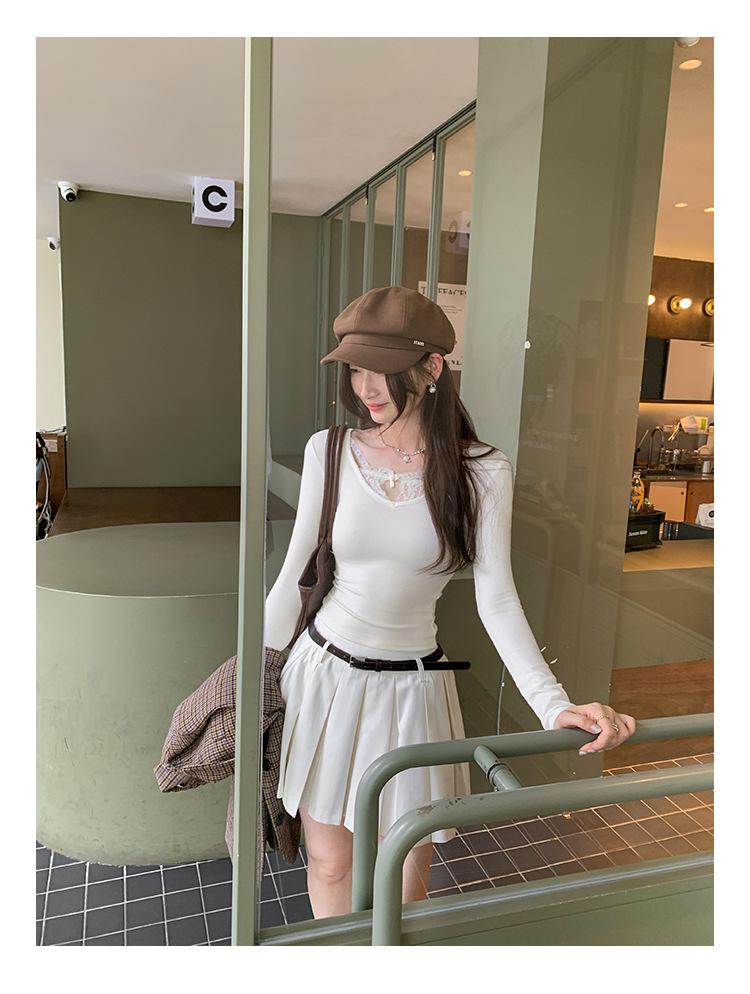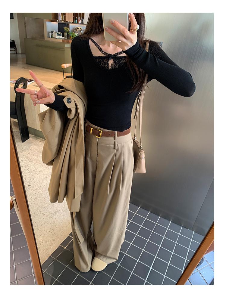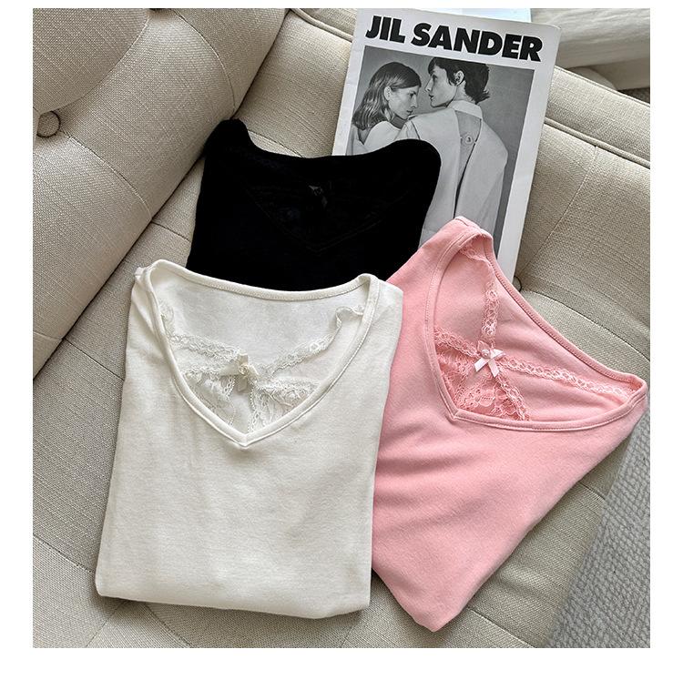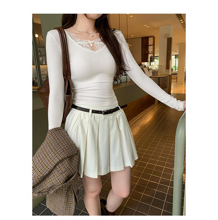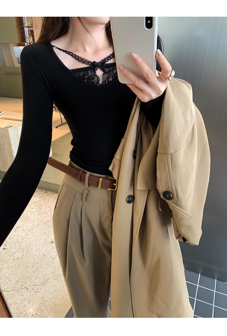 Sexy rosa puro deseo encaje patchwork ajuste ceñido camiseta manga larga mujer 2025 otoño nuevo diseño cintura pellizcada top