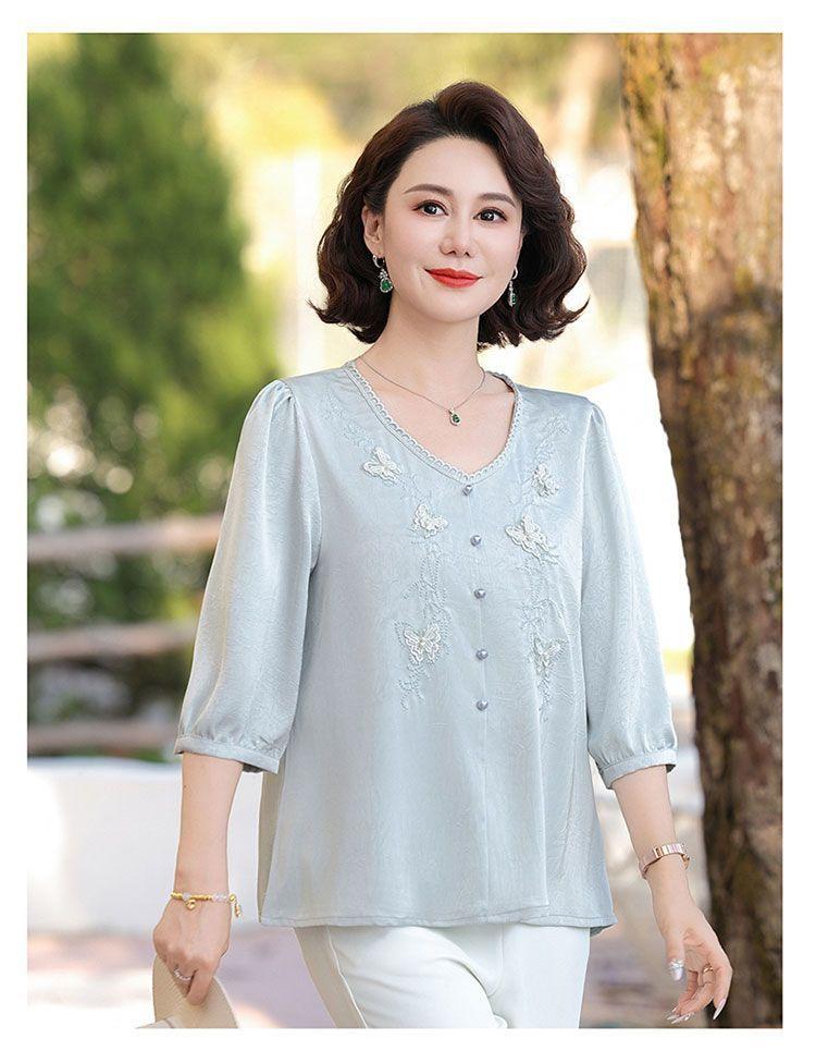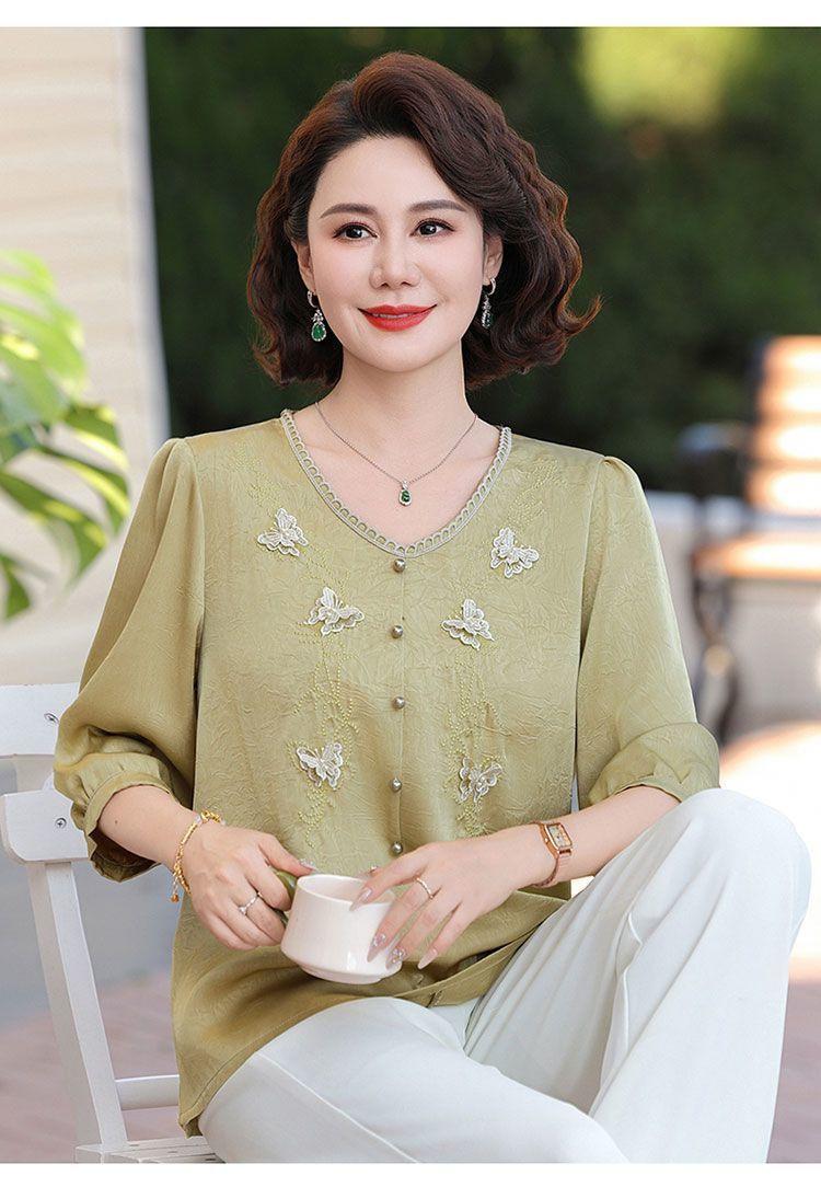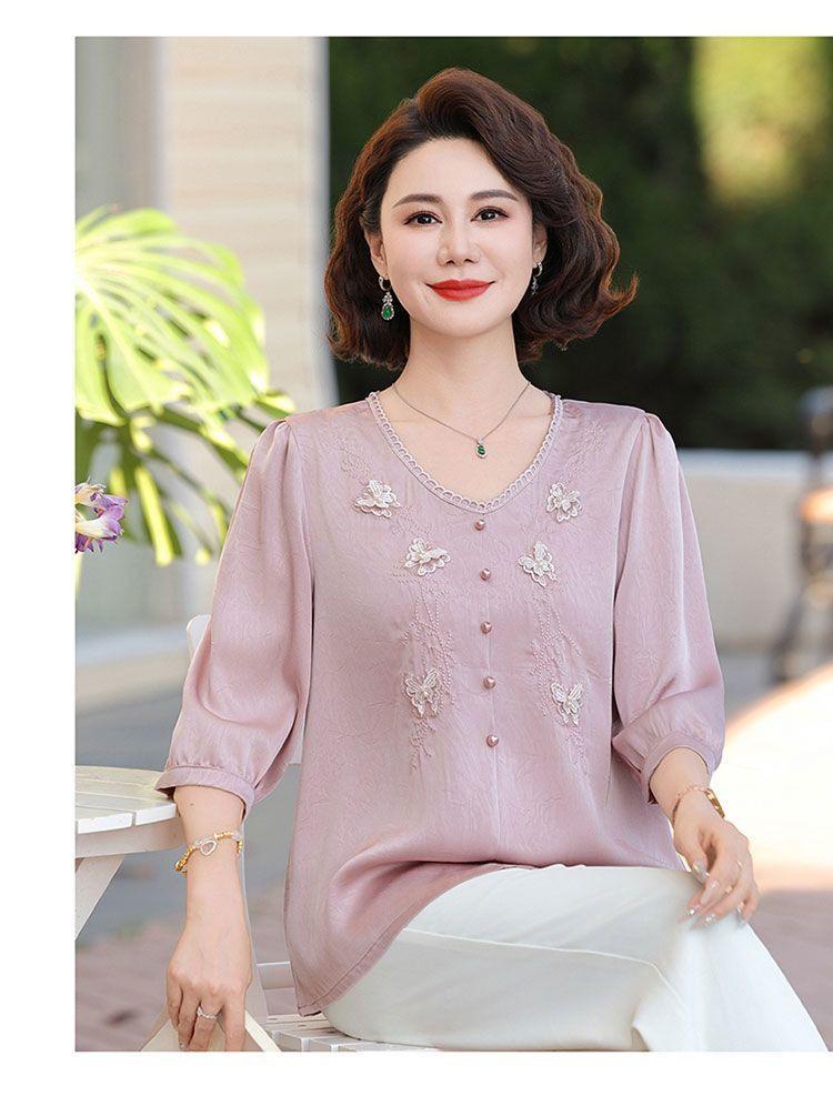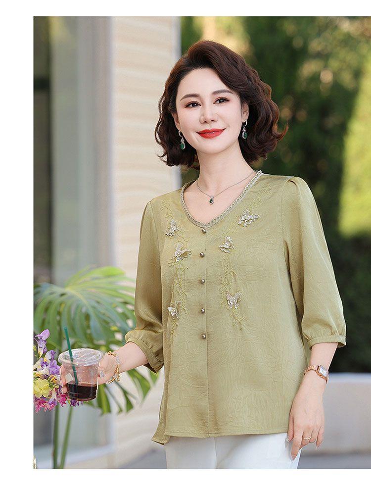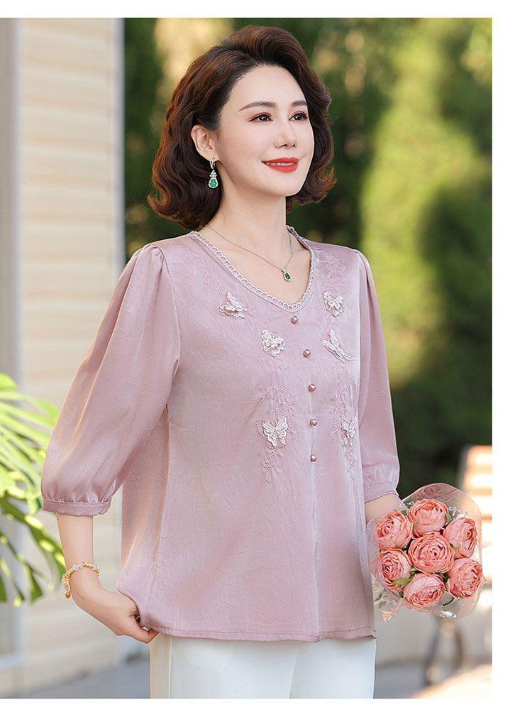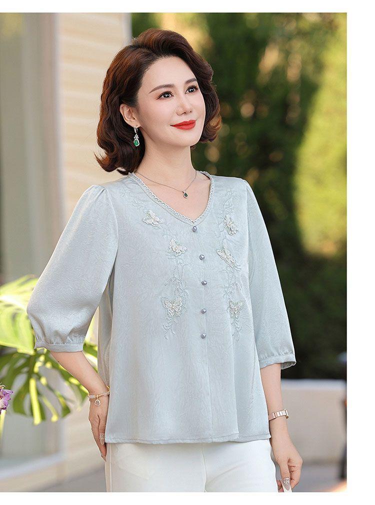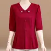 Blusa de gasa de moda para mujer de mediana edad con cuello en V y manga tres cuartos para mujeres de mediana edad y mayores, top de moda elegante y que reduce la edad