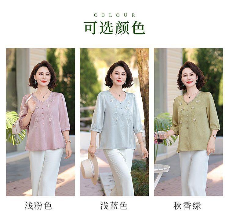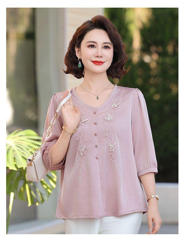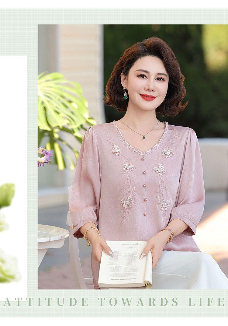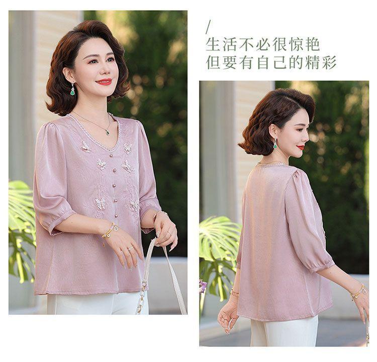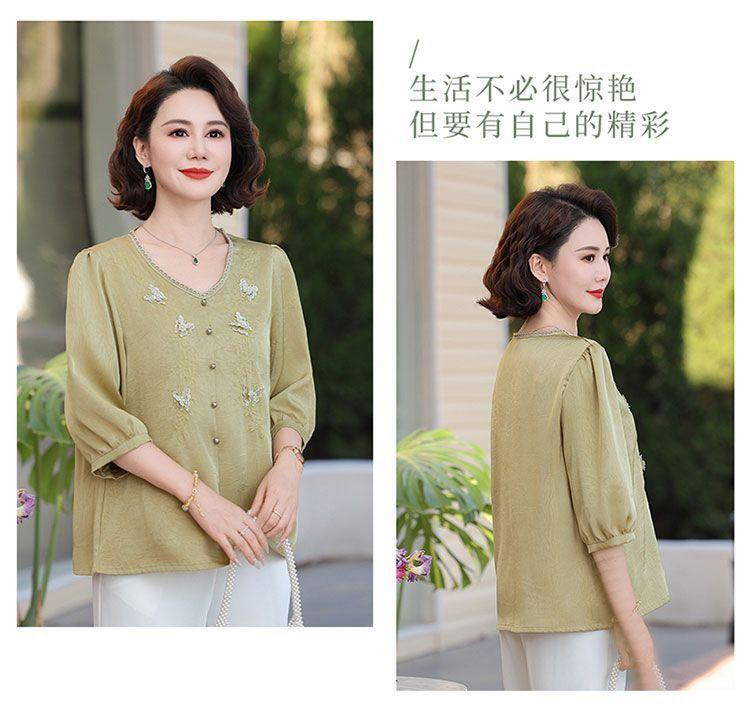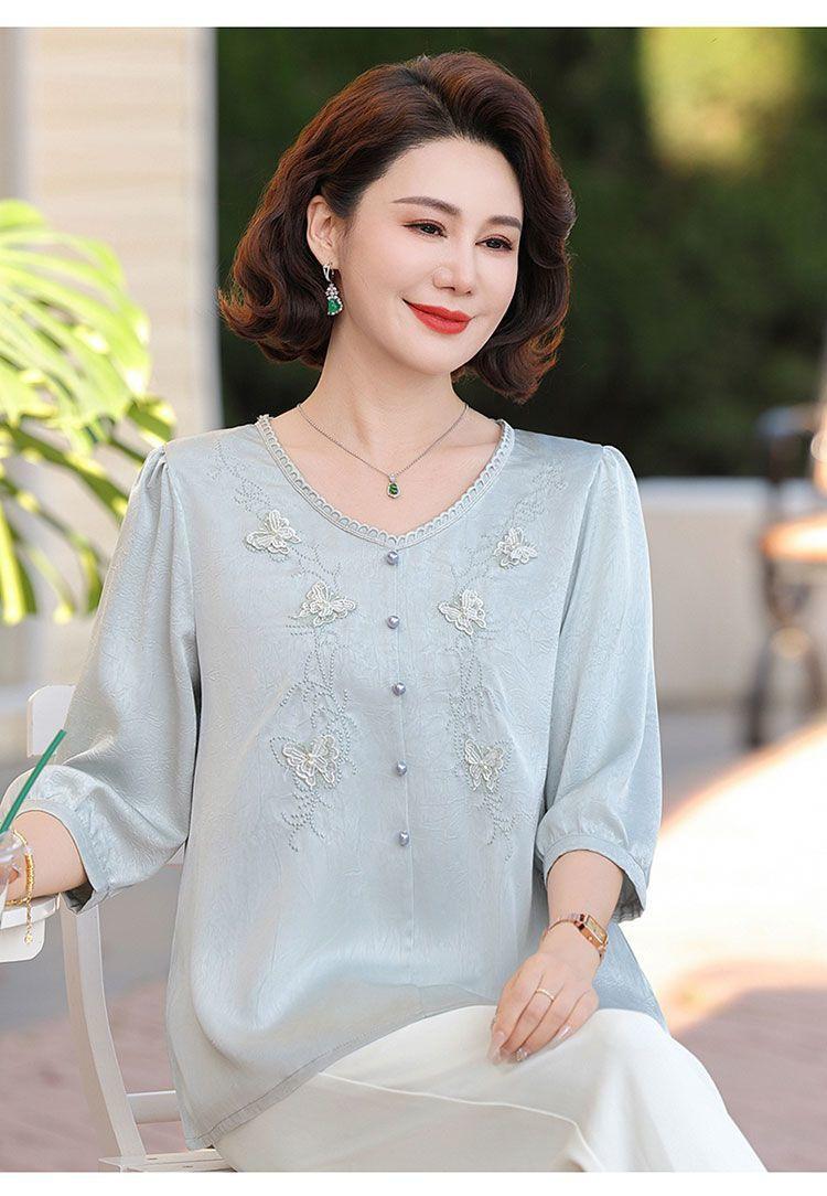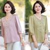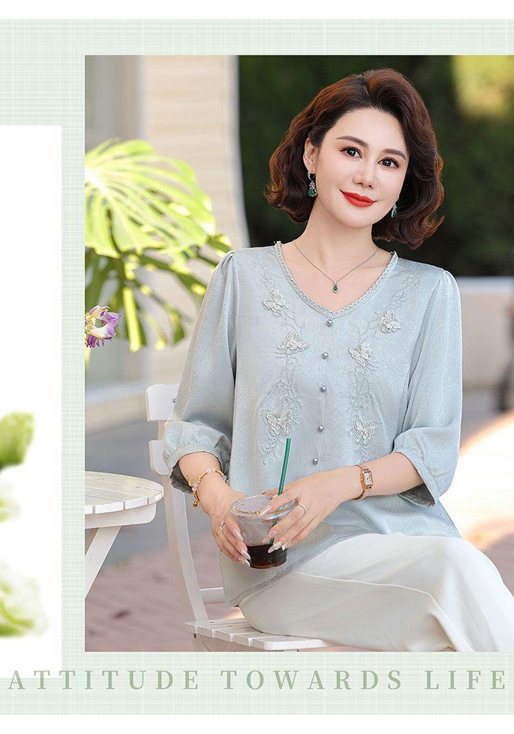 Blusa de gasa de moda para mujer de mediana edad con cuello en V y manga tres cuartos para mujeres de mediana edad y mayores, top de moda elegante y que reduce la edad