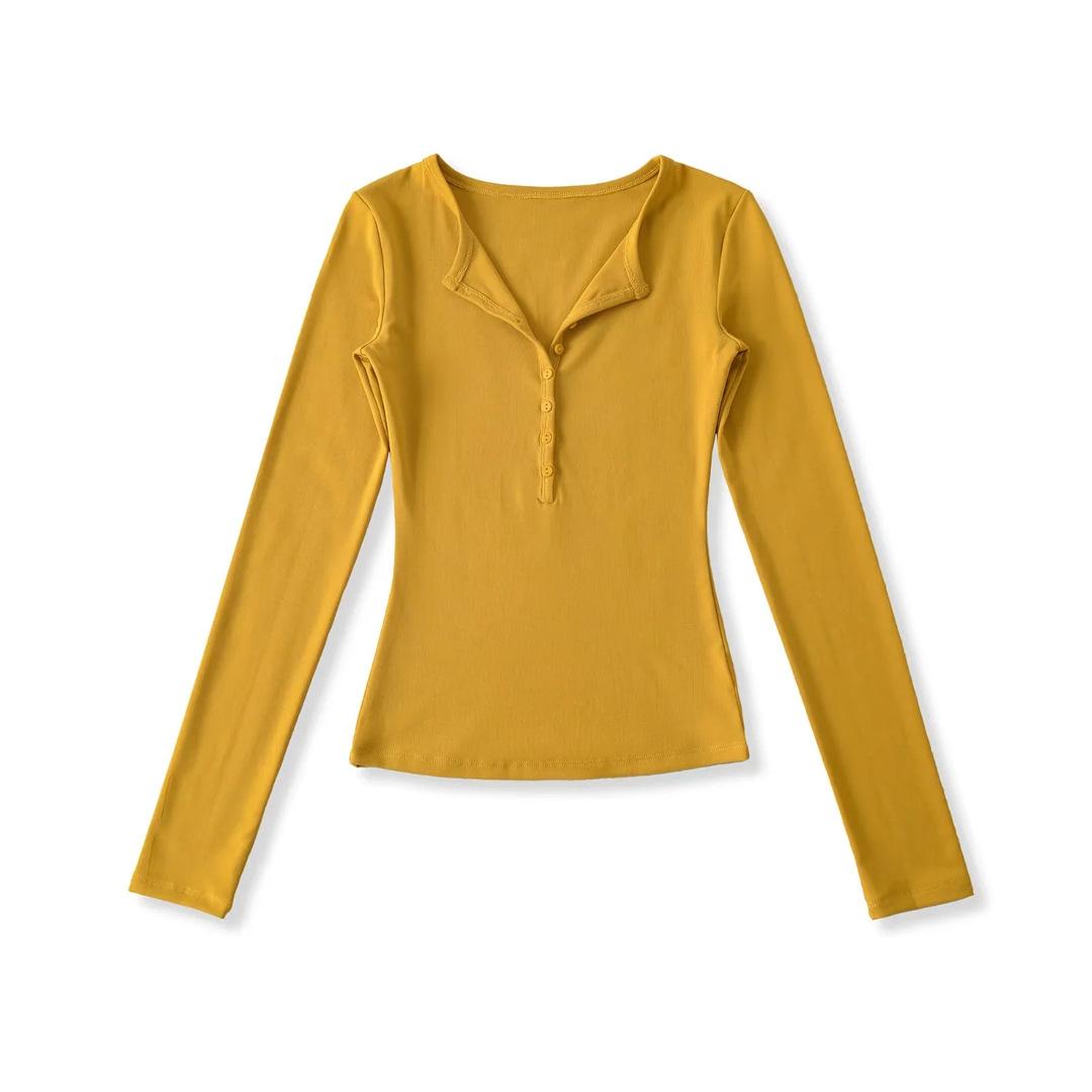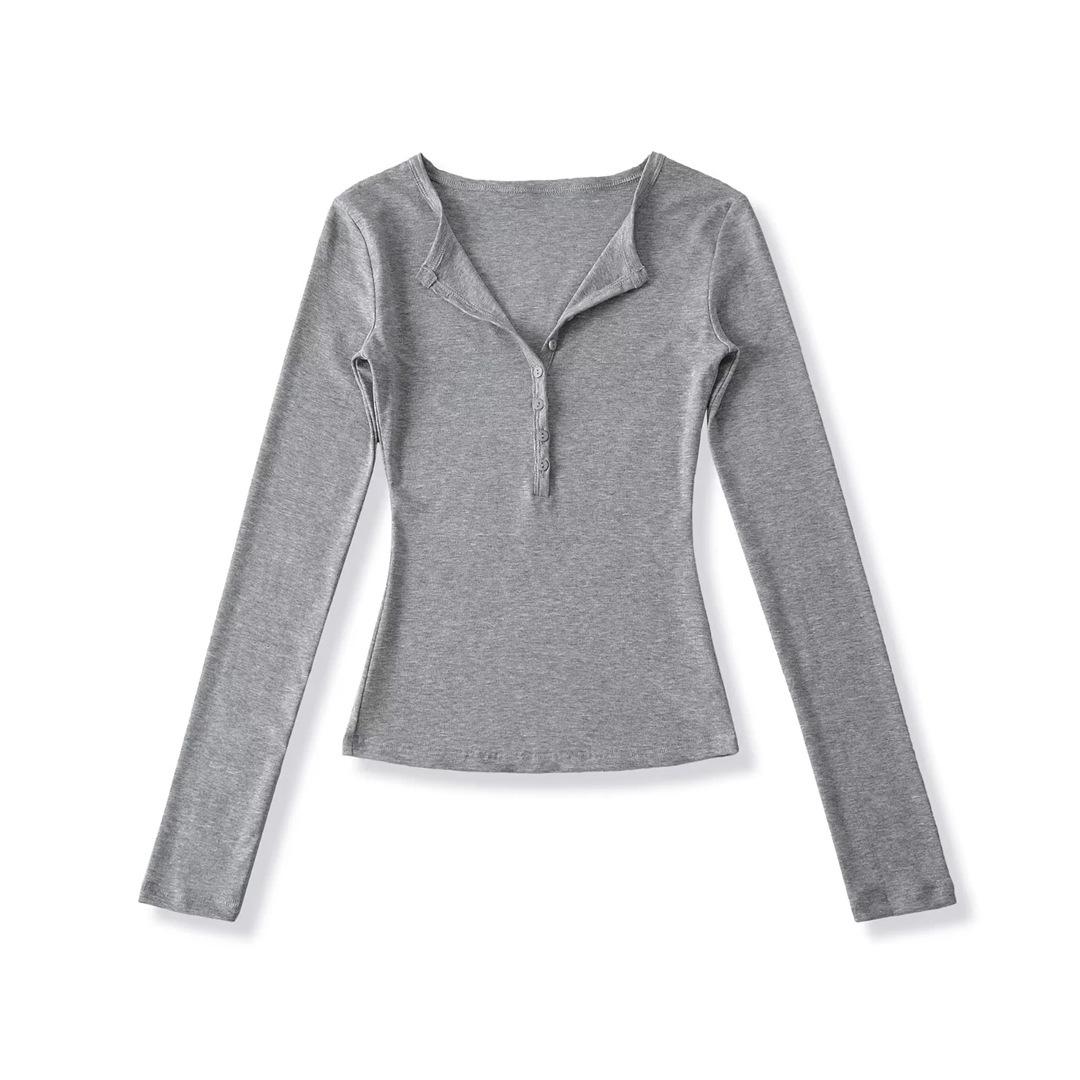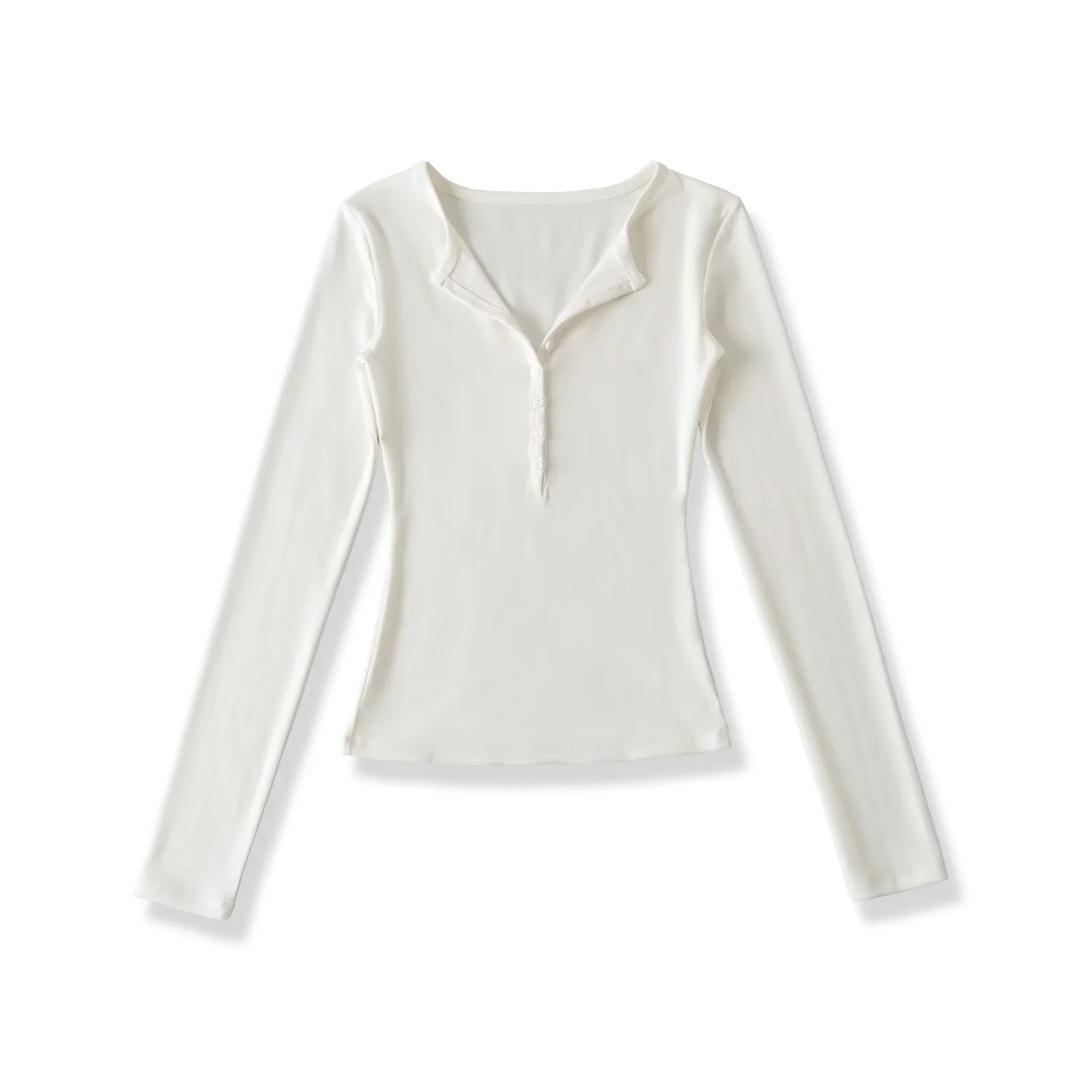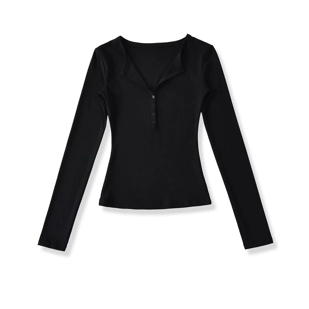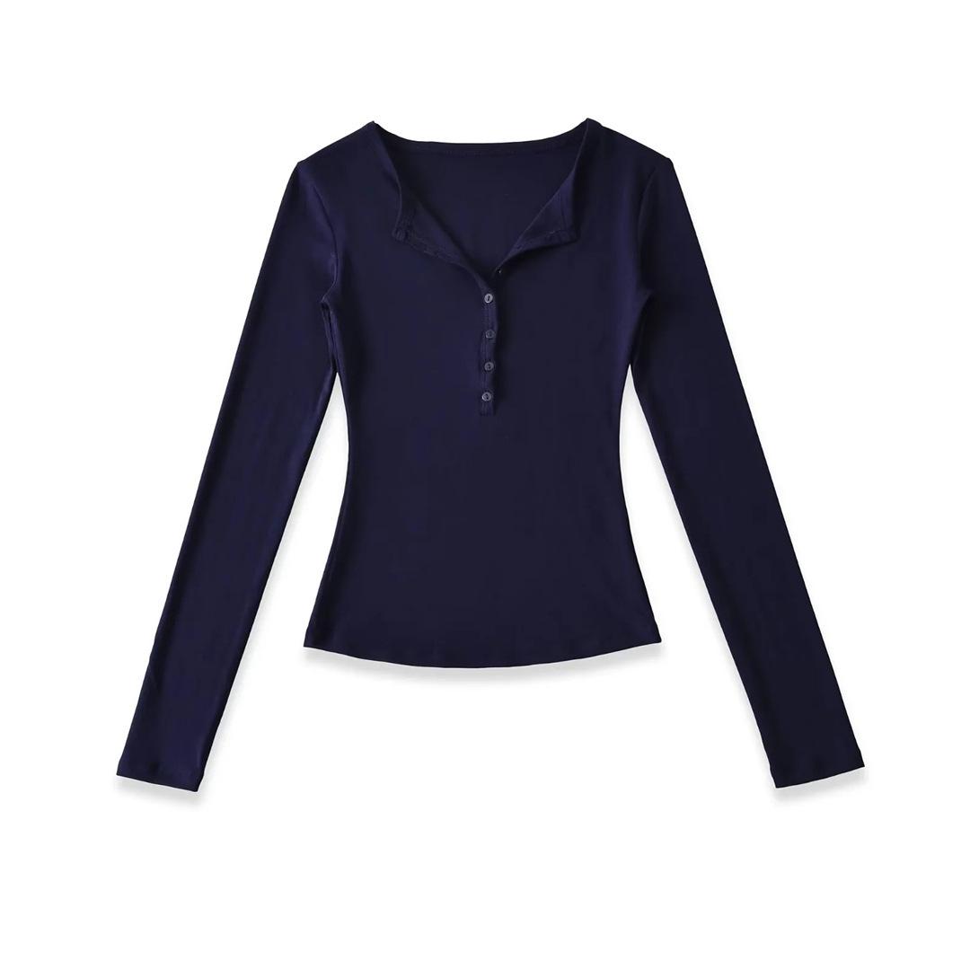 Compra 2025 Nuevo Americano Sexy Deseo Puro playera con Cuello en V abotonada de manga larga para mujer Estilo básico Simple Elástica Ajustada al por mayor en Joom.pro