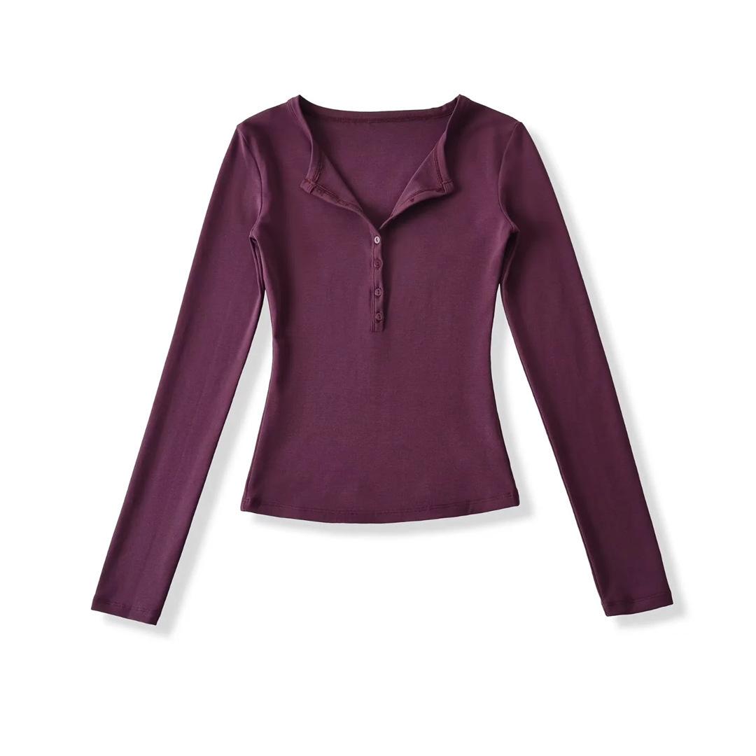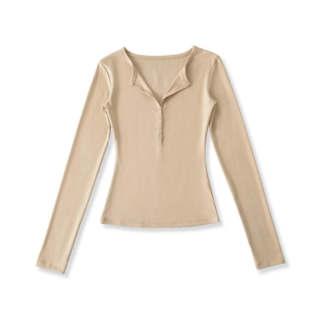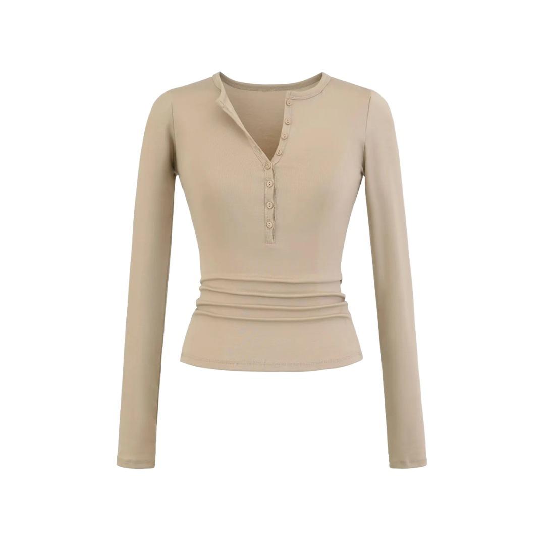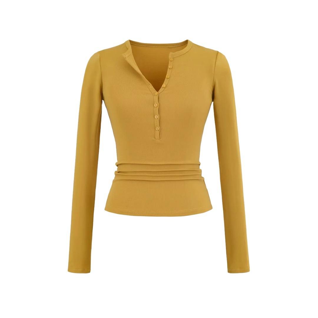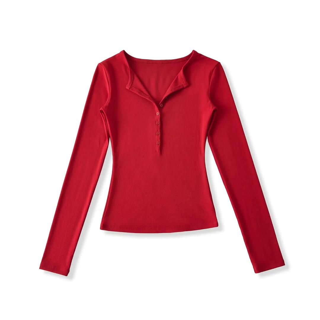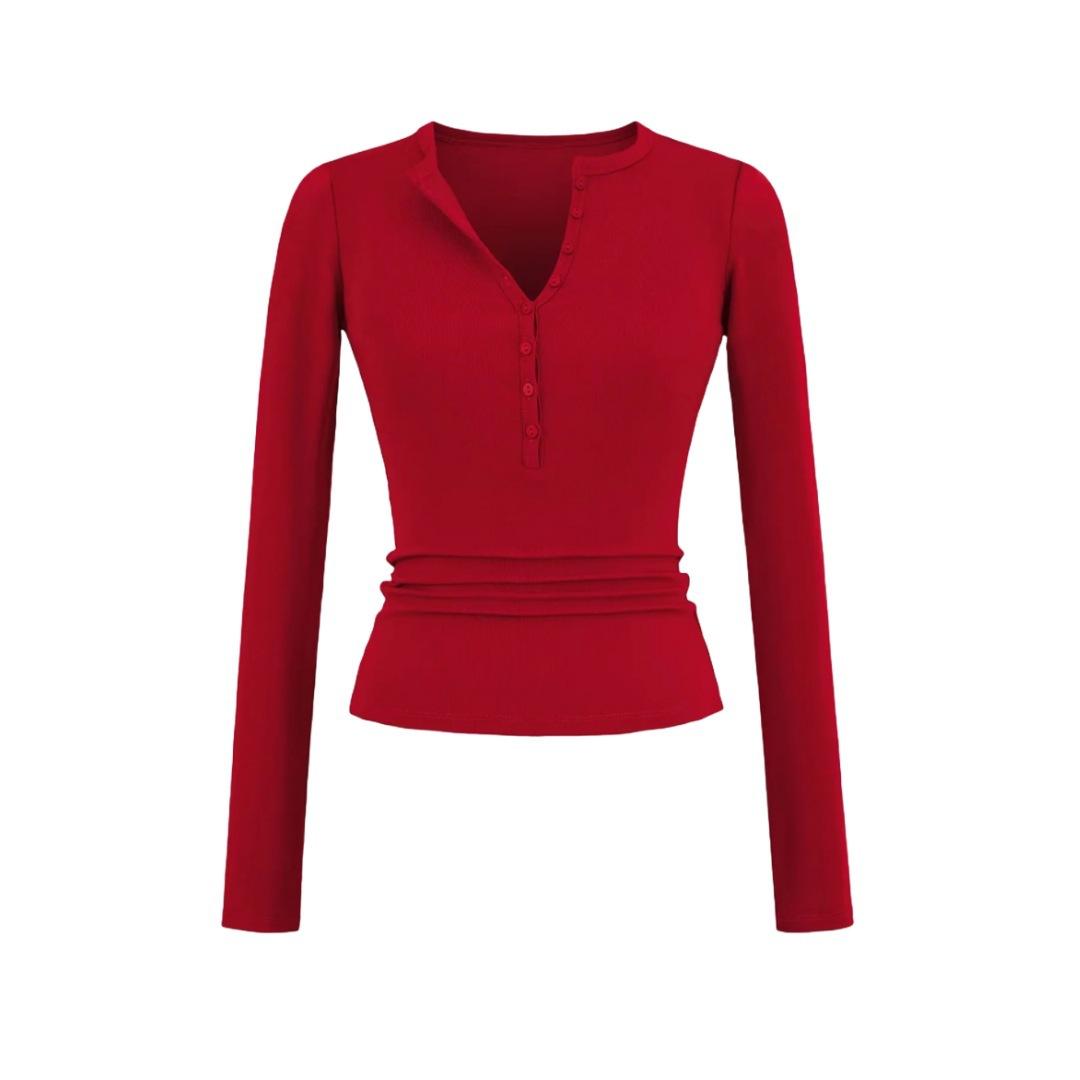 Compra 2025 Nuevo Americano Sexy Deseo Puro playera con Cuello en V abotonada de manga larga para mujer Estilo básico Simple Elástica Ajustada al por mayor en Joom.pro