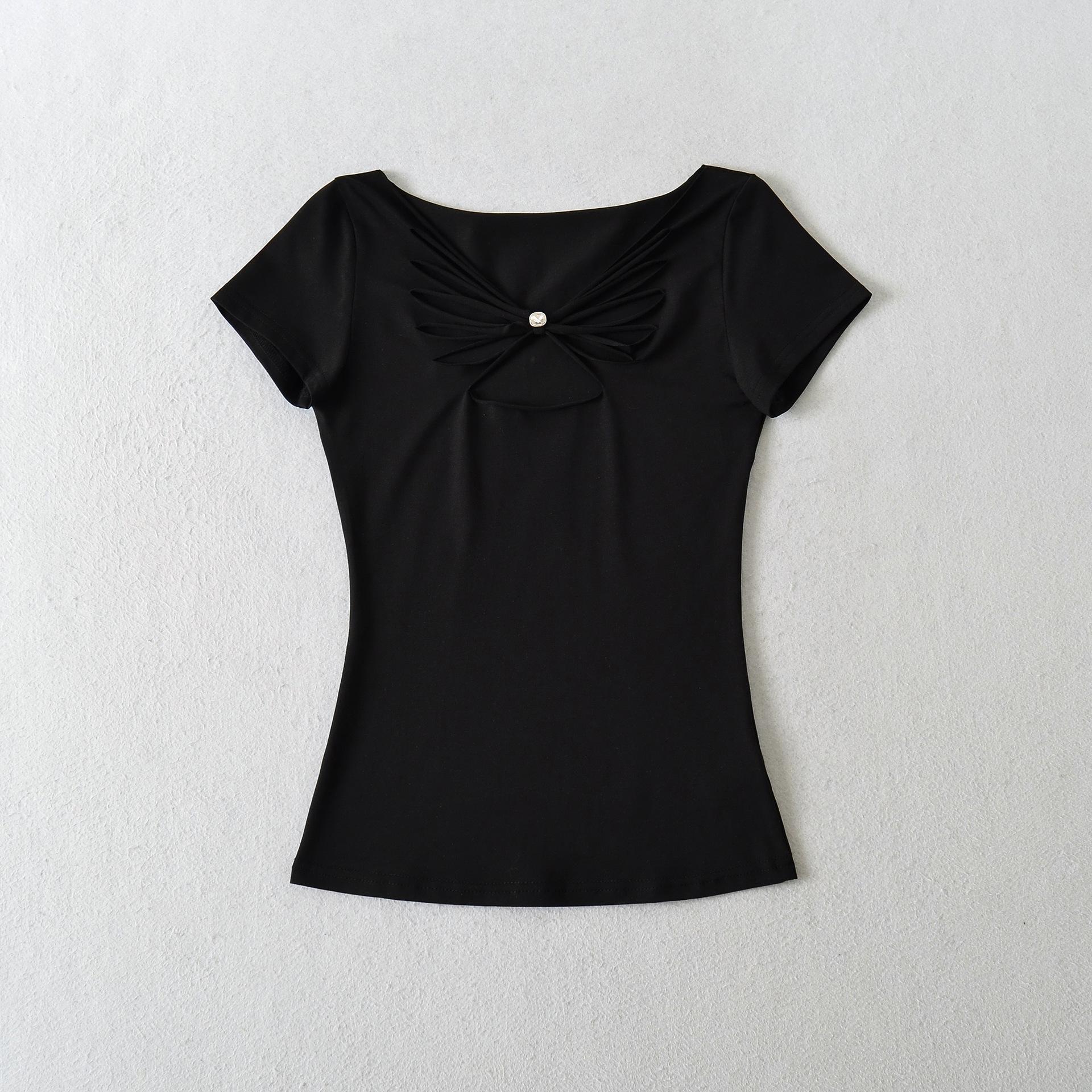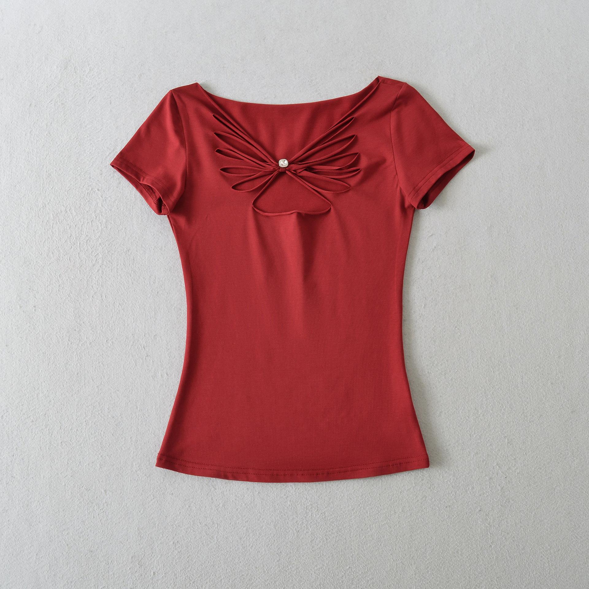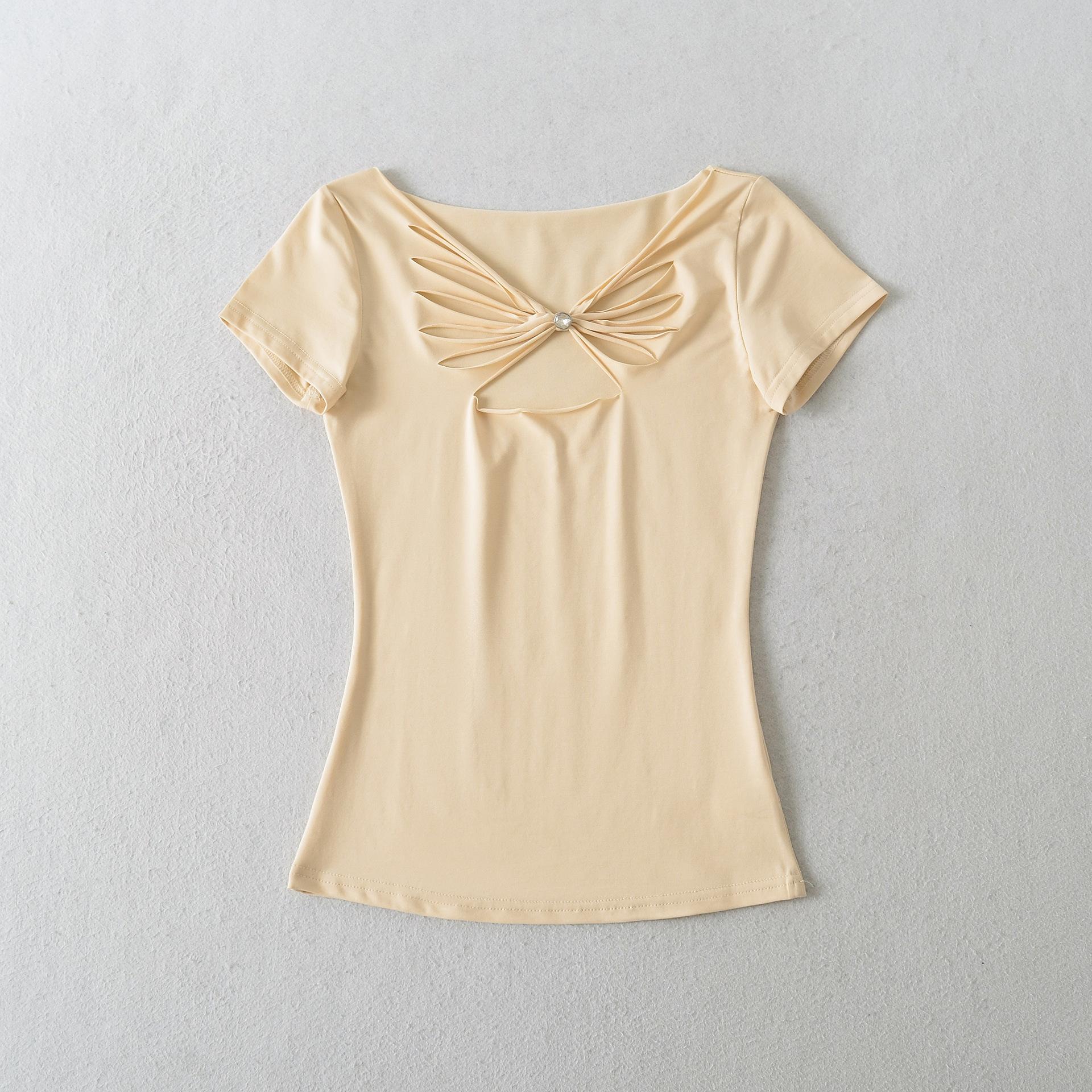 2025 Verano Nuevo Estilo Deseo Puro Chica Caliente Pequeño Secreto Corte Mariposa Camiseta Manga Corta Mujer Cuello en V Ajustada Elástica Top