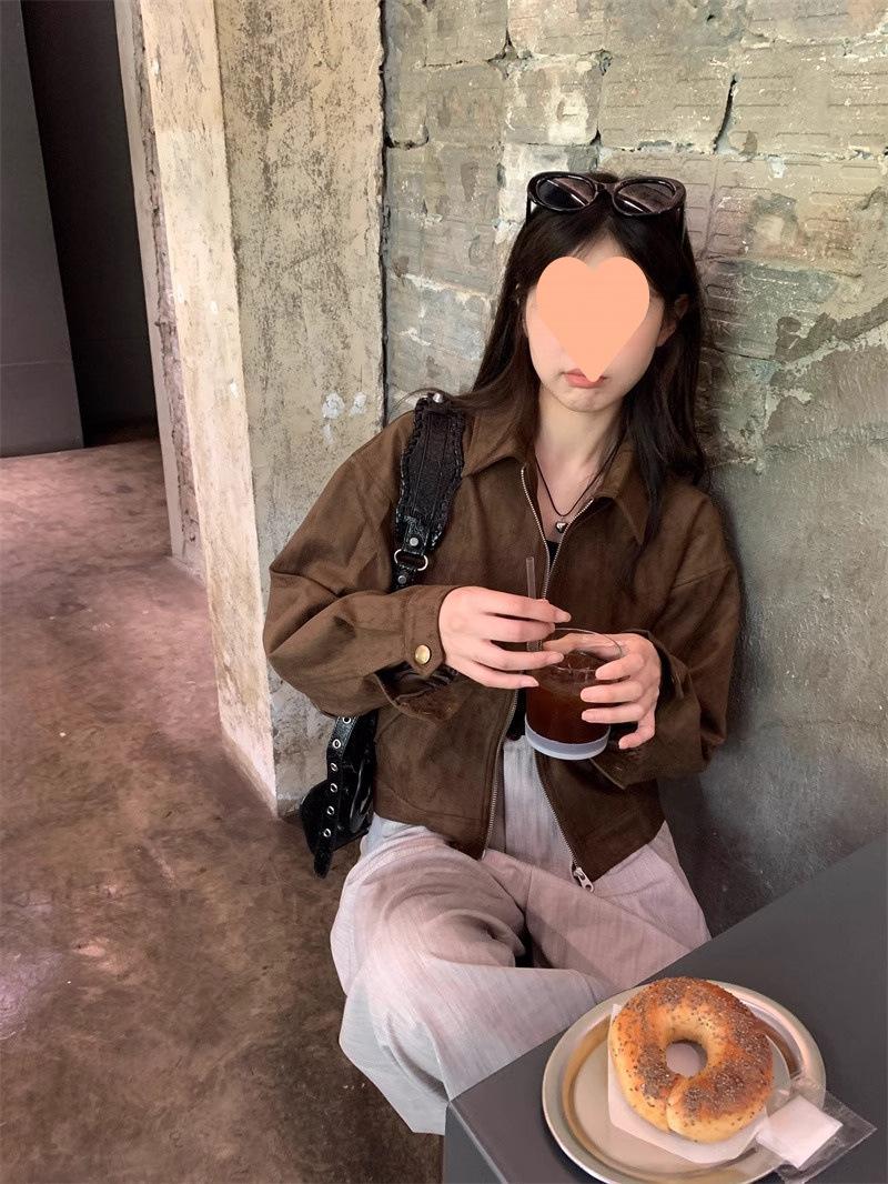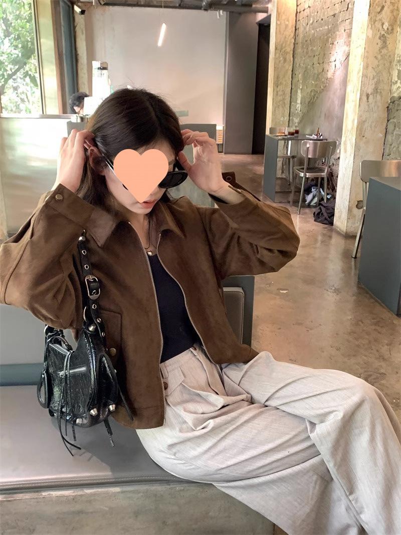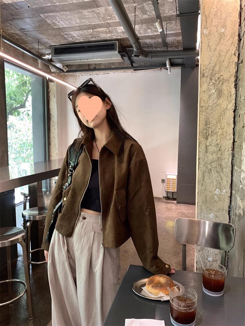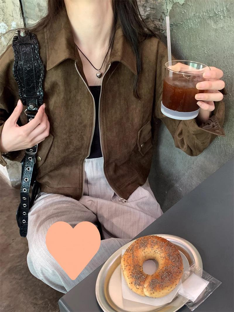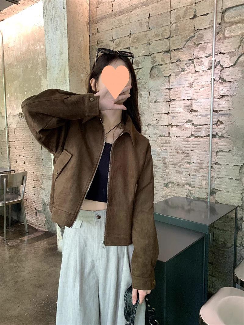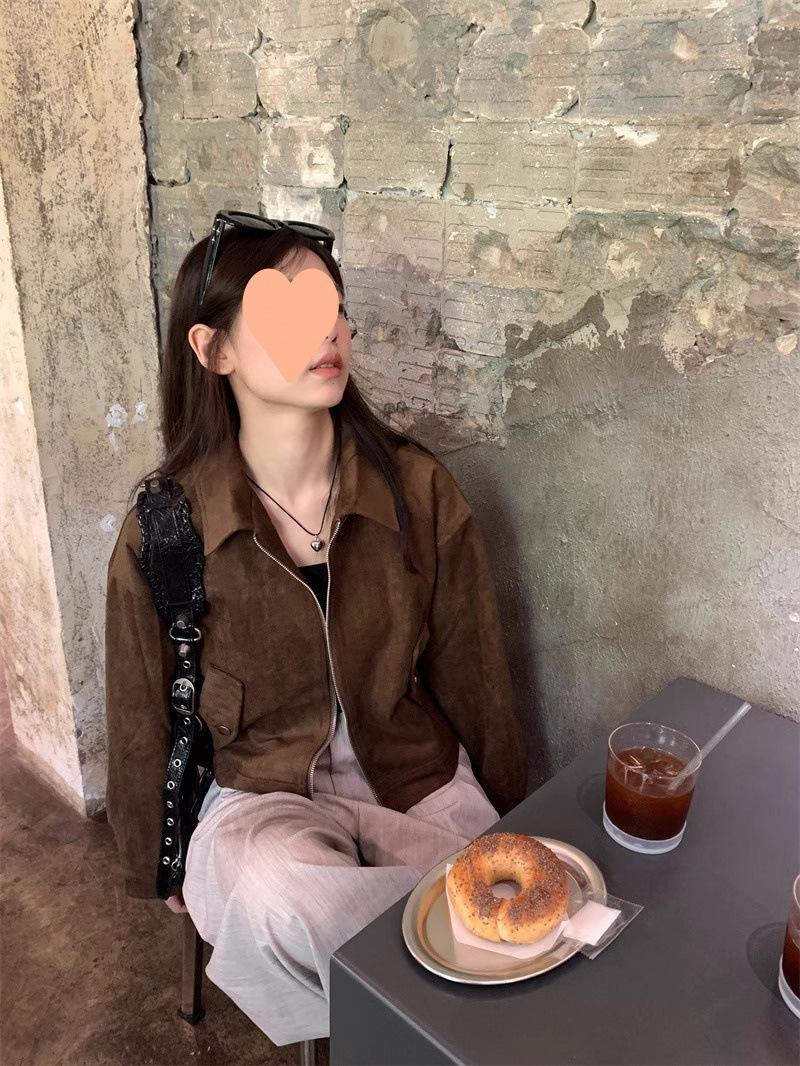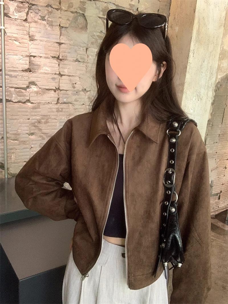 Chaqueta de Gamuza Color Café Dulce y Cool para Mujer Primavera y Otoño Nueva Retro Nicho Corta Top Chaqueta Petite