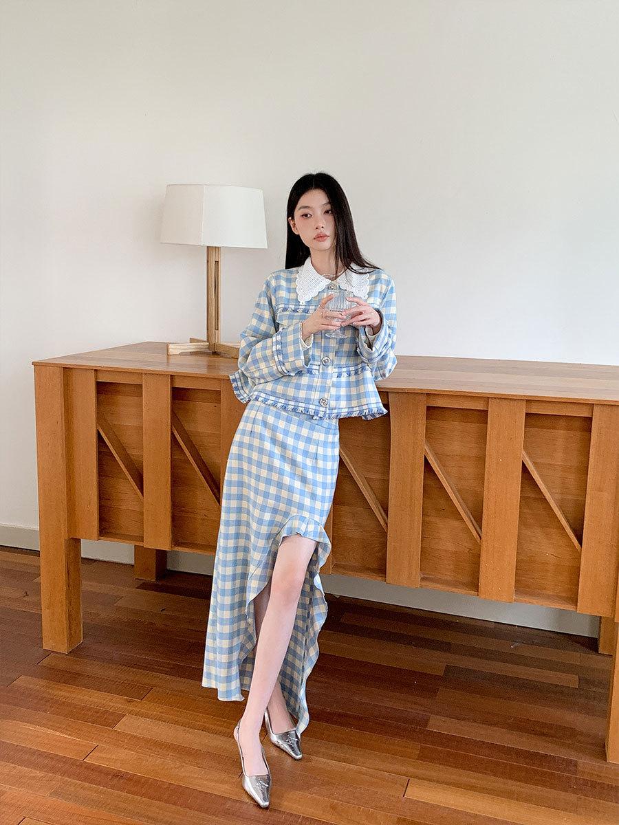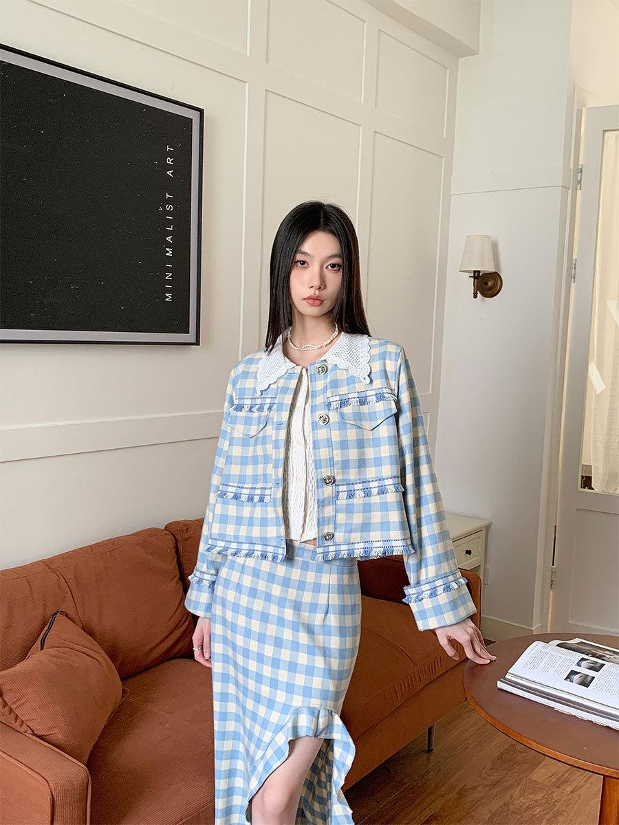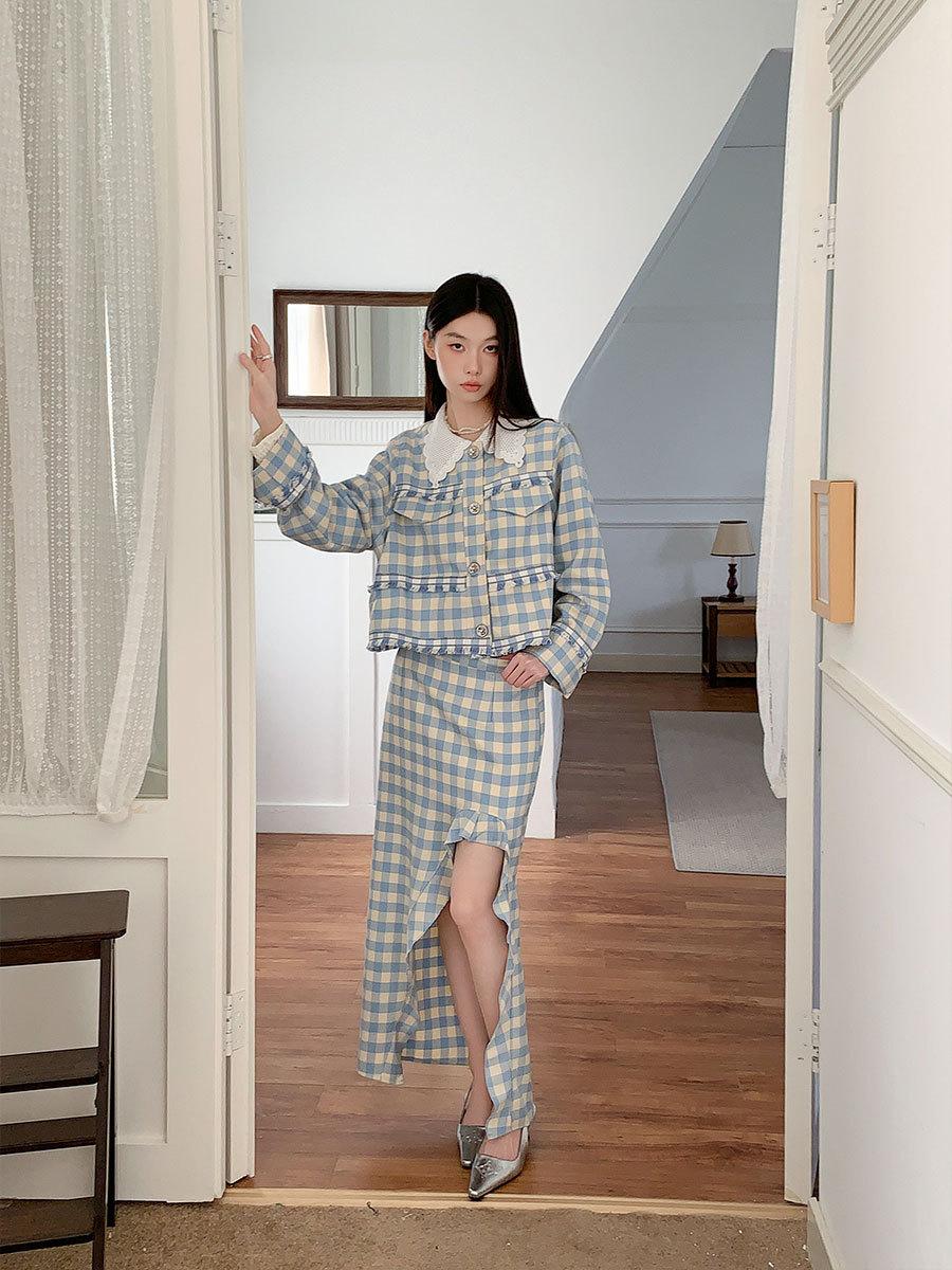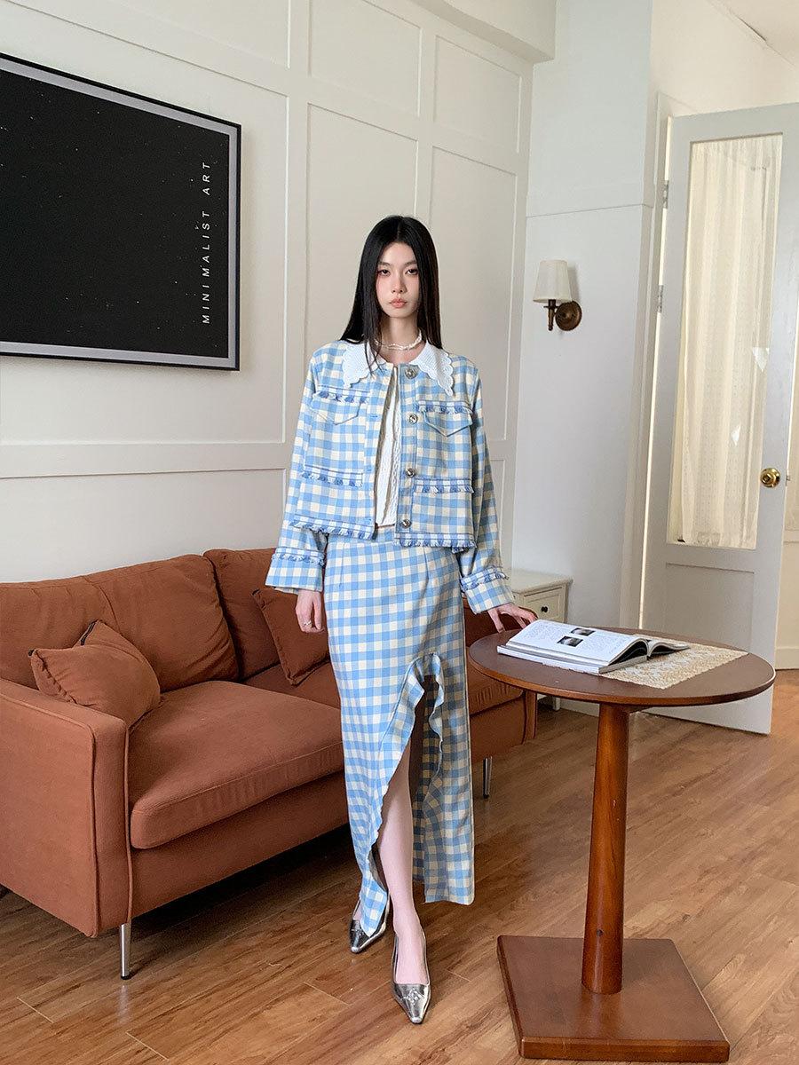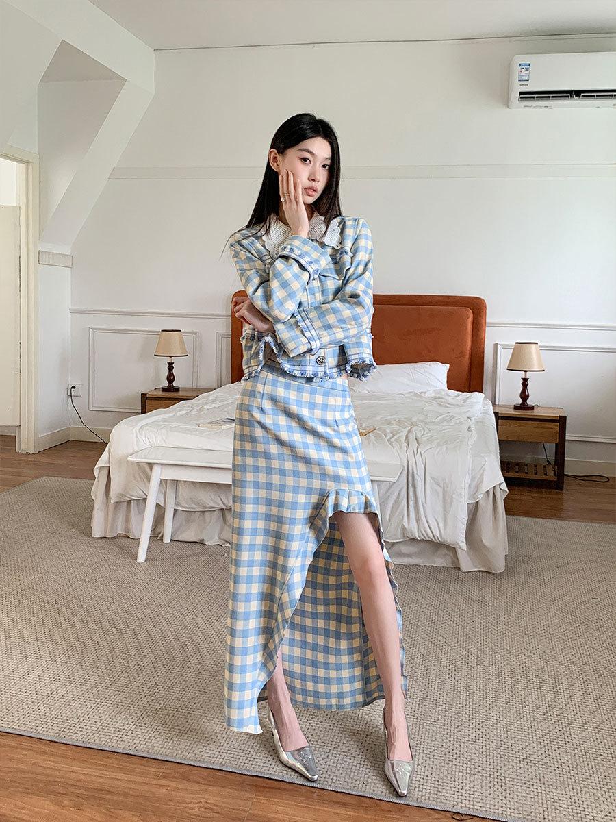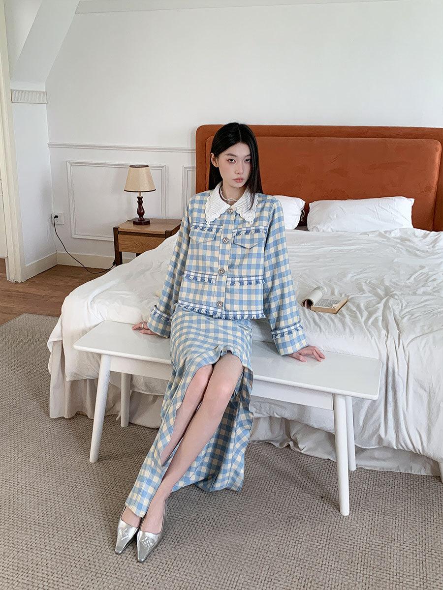 Traje de cuadros estilo Chanel real en stock Otoño e Invierno Nuevo abrigo corto francés Falda con abertura