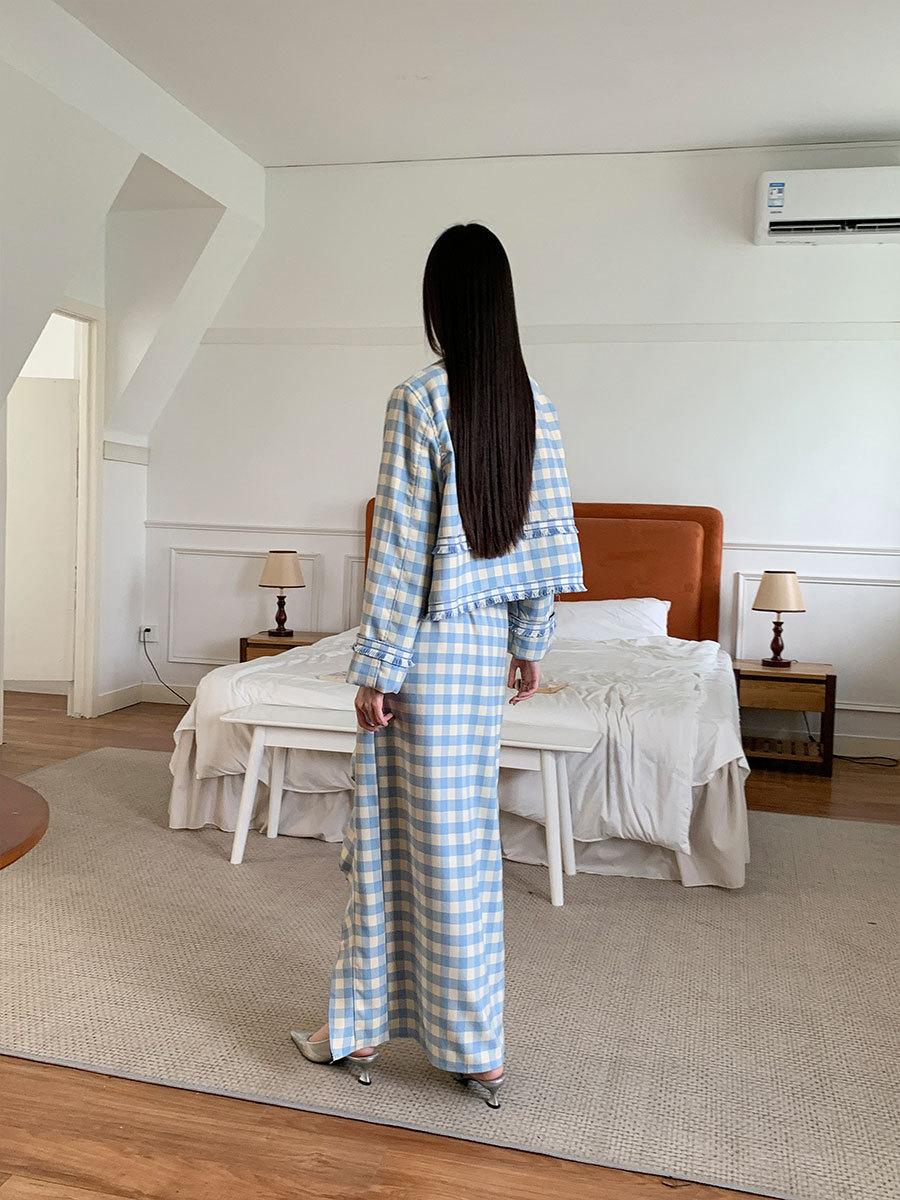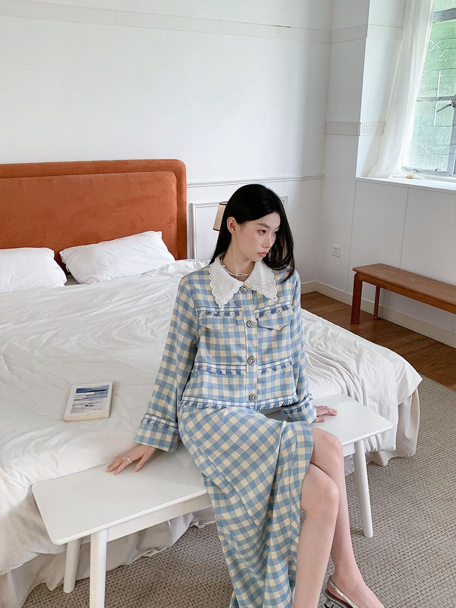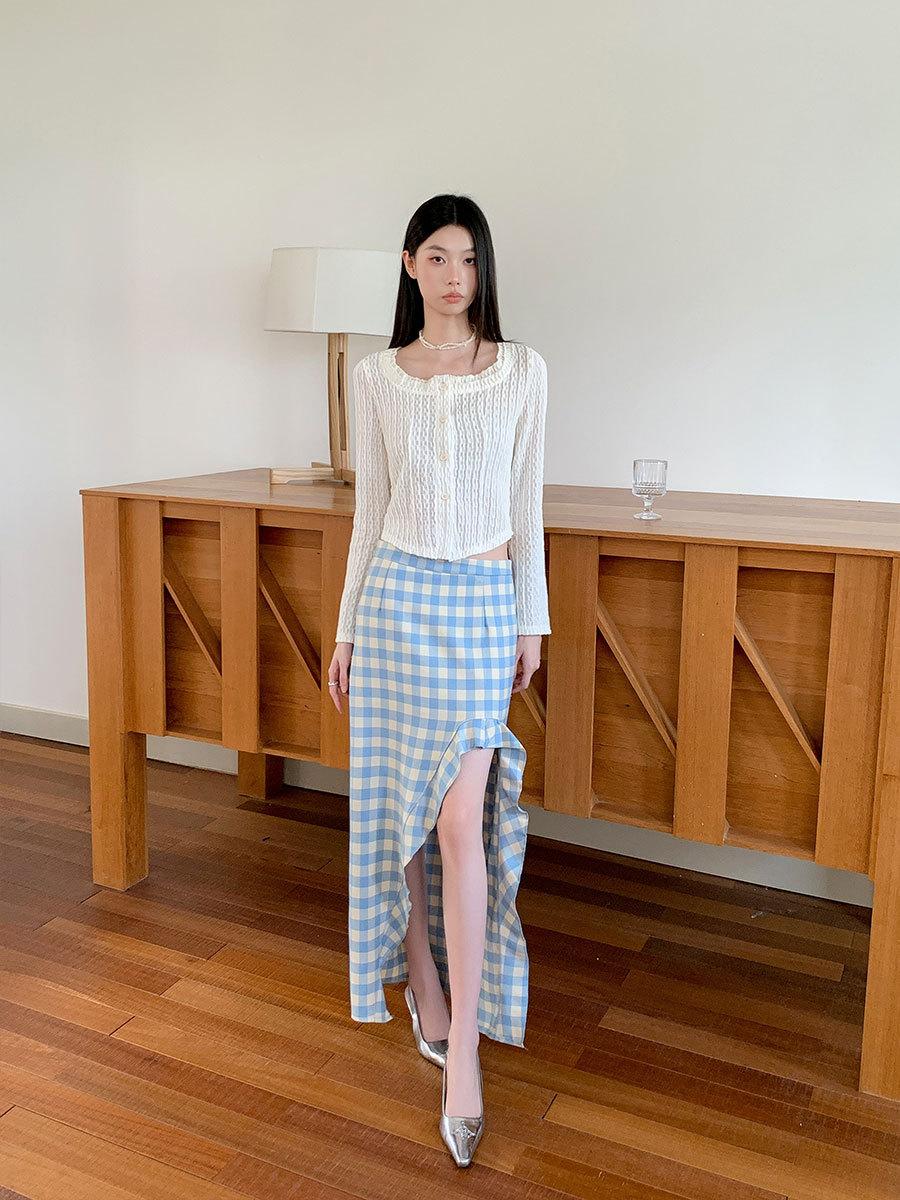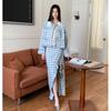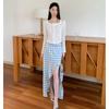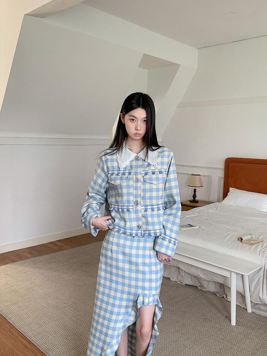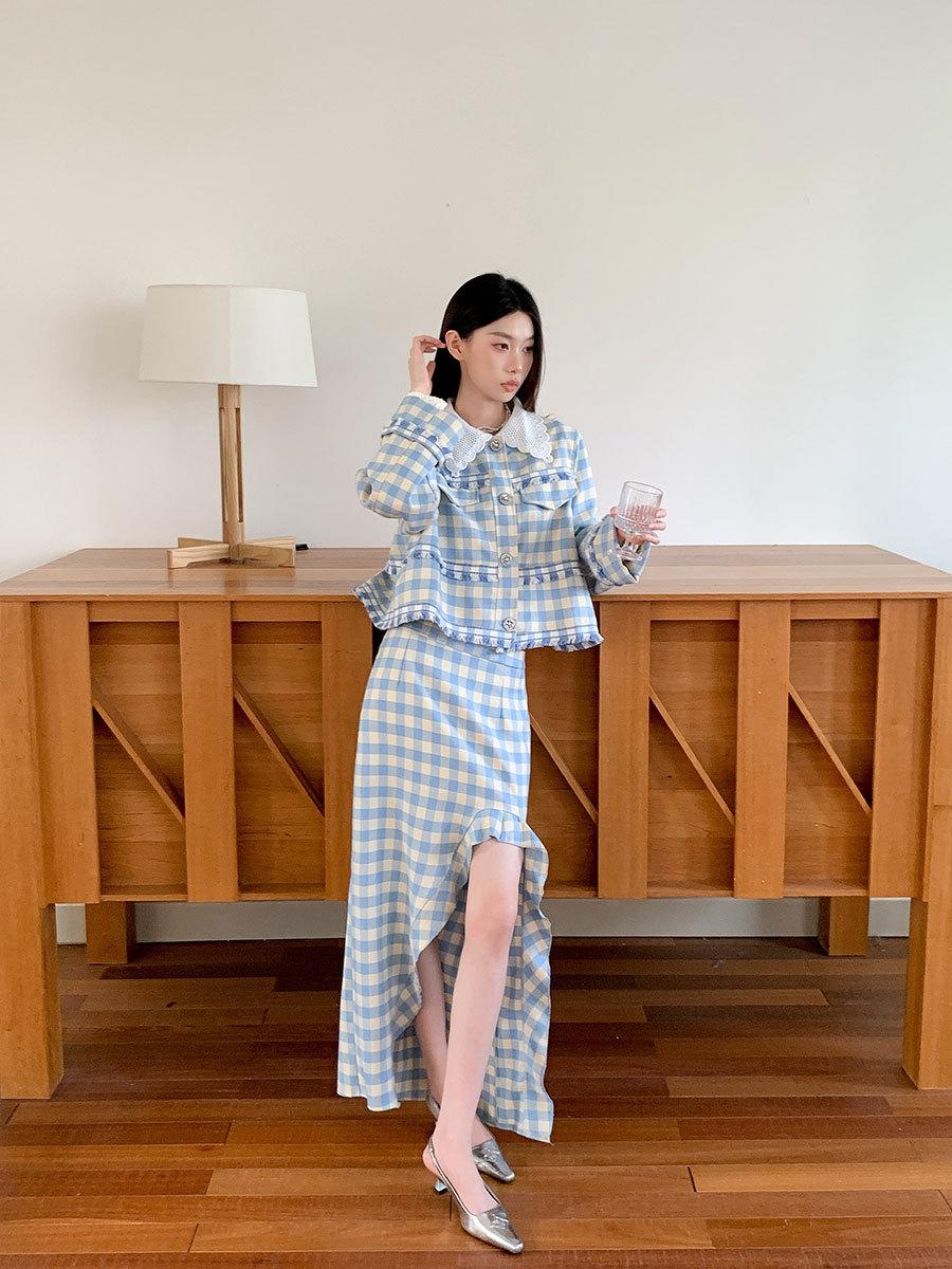 Traje de cuadros estilo Chanel real en stock Otoño e Invierno Nuevo abrigo corto francés Falda con abertura