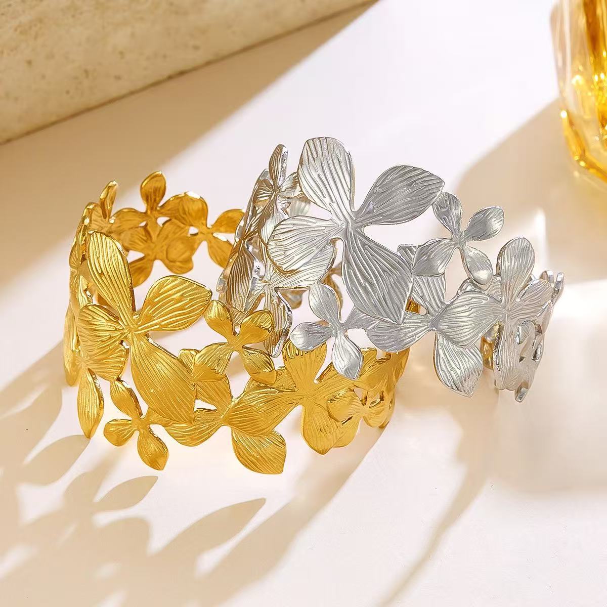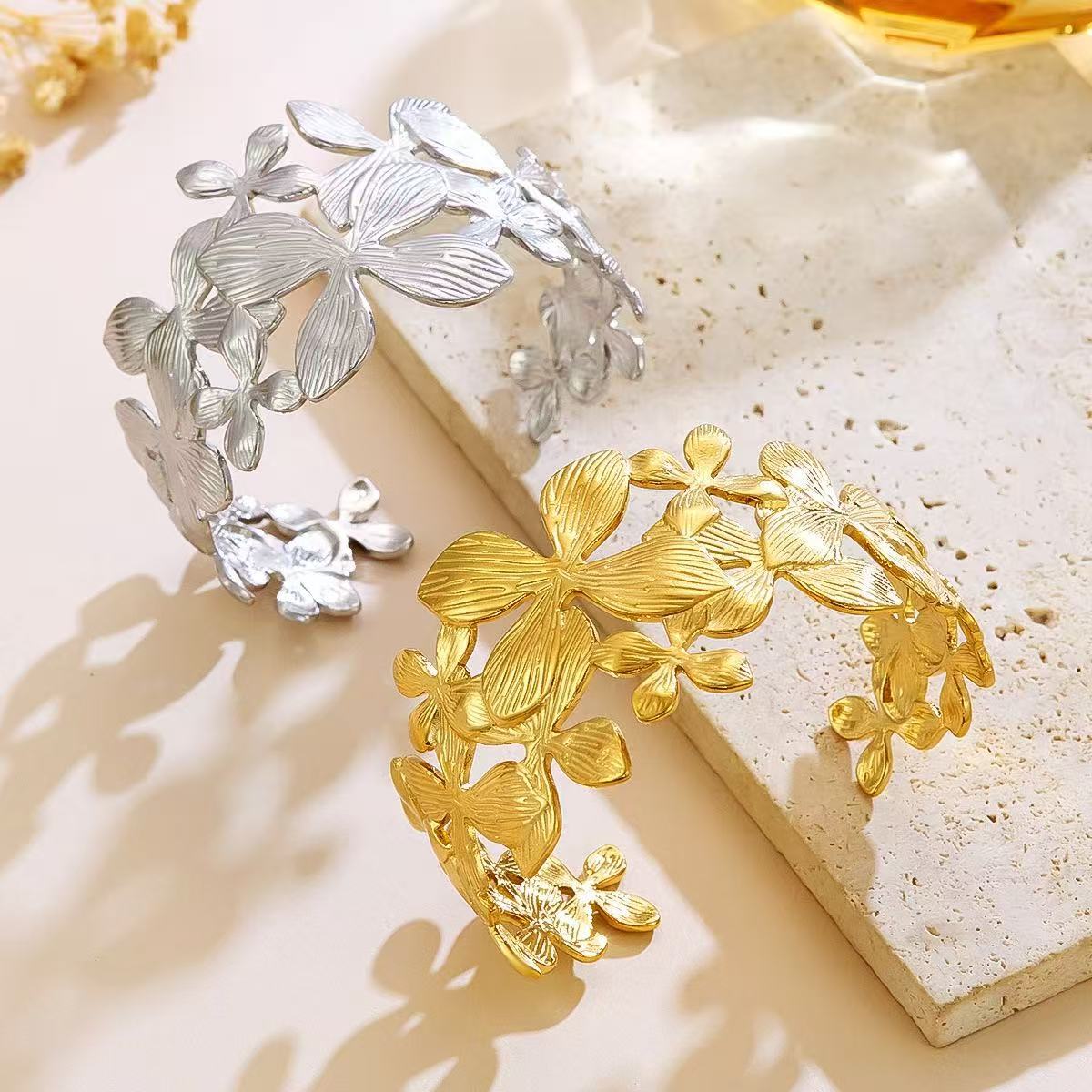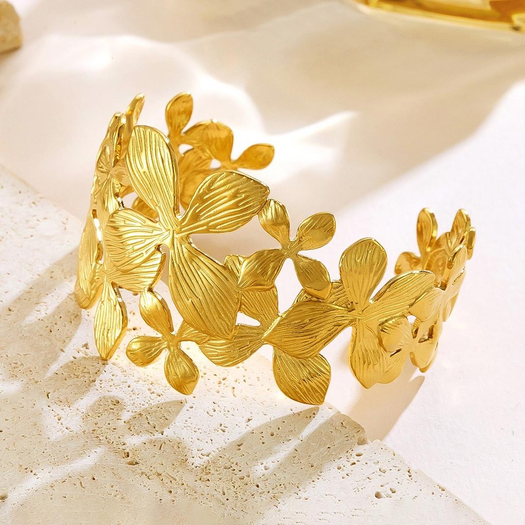 Esta pulsera está dirigida al mercado transfronterizo europeo y americano, presentando un diseño minimalista de hojas y flores, que es fresco y refinado. La base de acero titanio con baño de oro de 18 quilates es resistente al desgaste y no se decolora fácilmente, y también tiene un tacto de lujo ligero y alta gama.