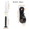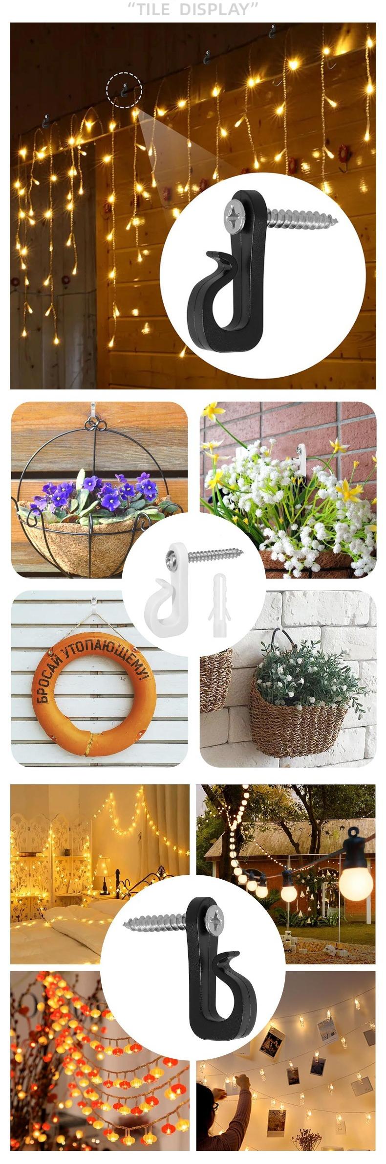 paquete de 50 ganchos, ideal para uso tanto en interiores como en exteriores. Instalarlos es muy fácil: cada gancho viene con un tornillo y un taco de pared.. Solo taladra un pequeño agujero, inserta el taco, luego atornilla el gancho, y estarás listo para colgar luces de pared o cables. Hechos de plástico duradero, estos ganchos pueden sujetar de forma segura tus artículos, ya sea para iluminar tu patio u organizar cables en tu hogar.. Su elegante diseño negro combina bien con cualquier decoración.