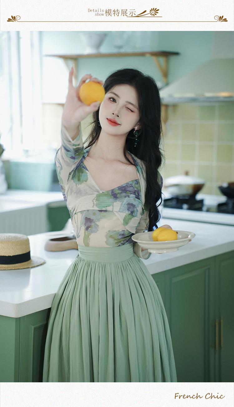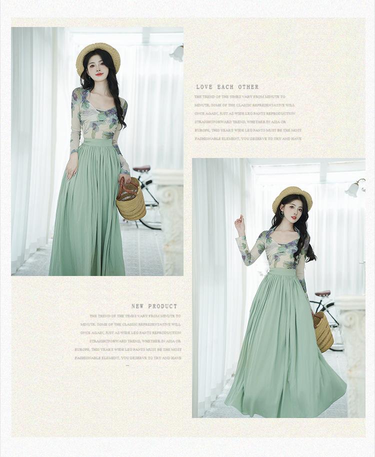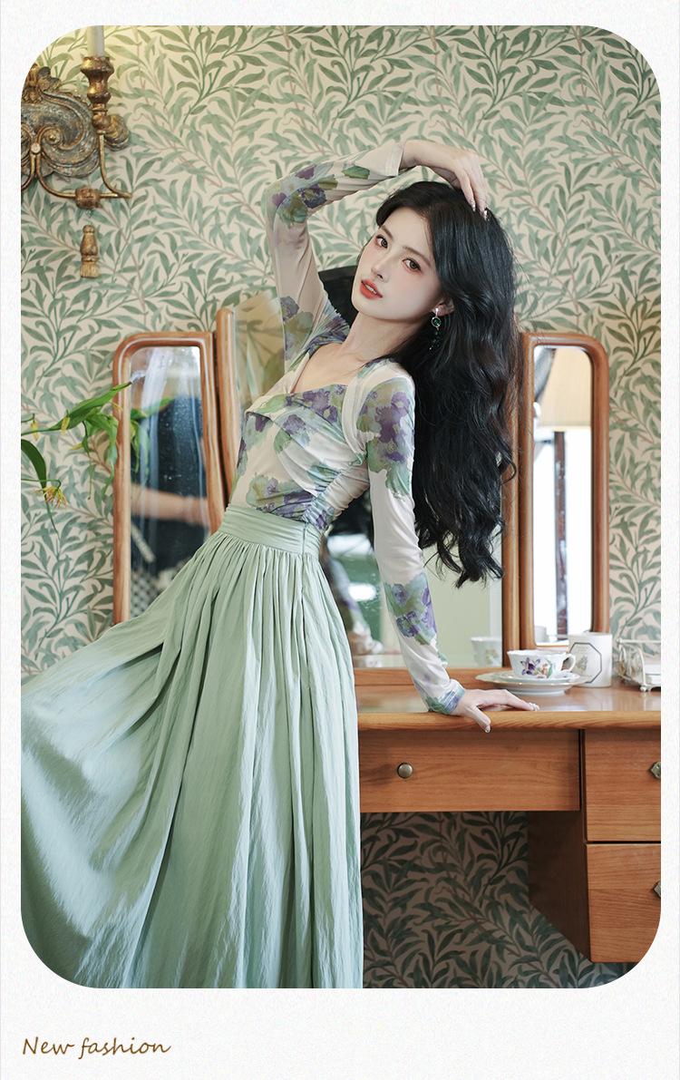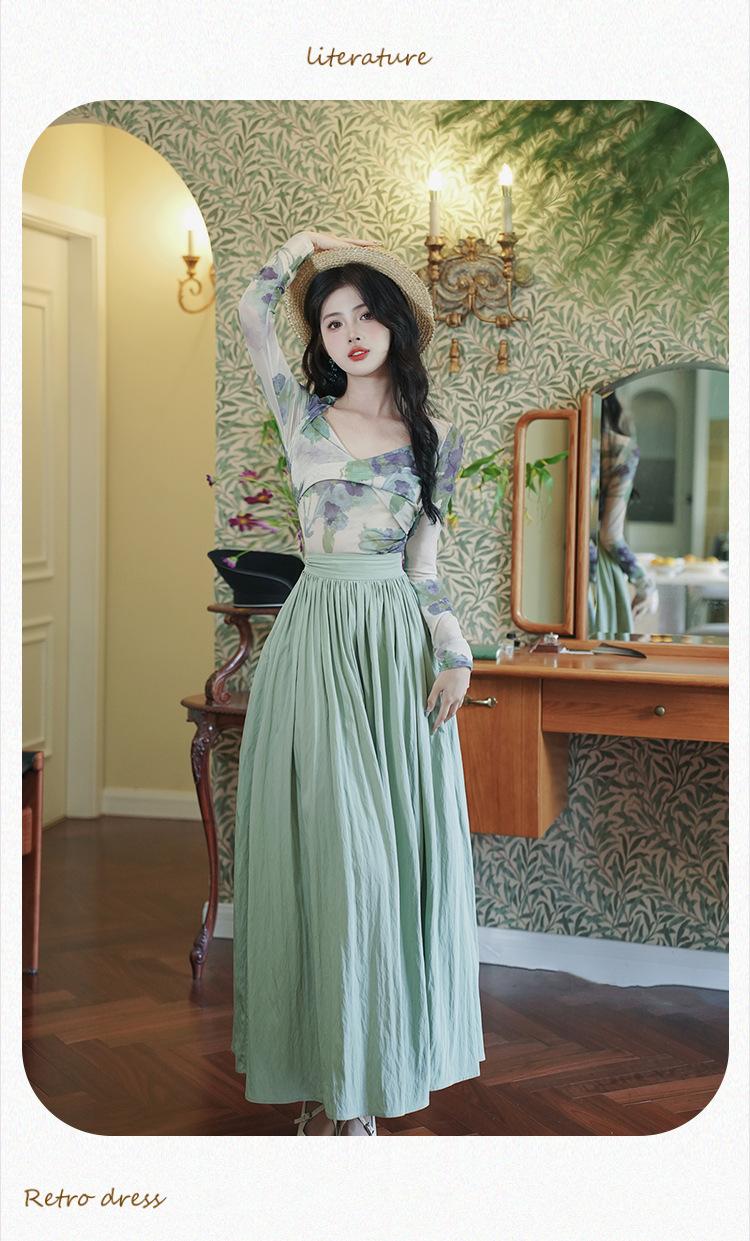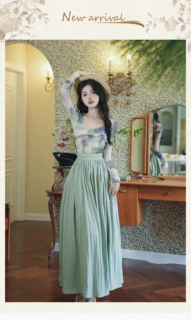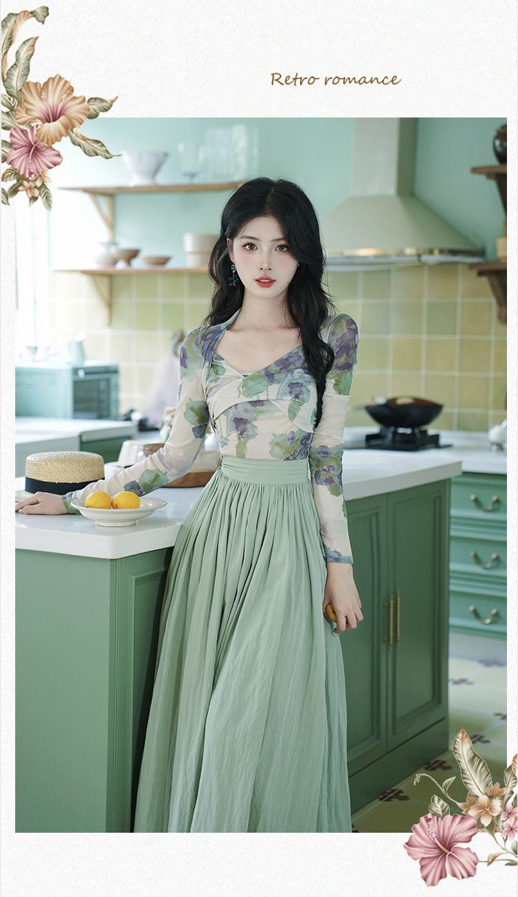 Top de malla francesa estampada en stock con falda retro de cintura alta y vuelo amplio