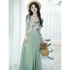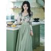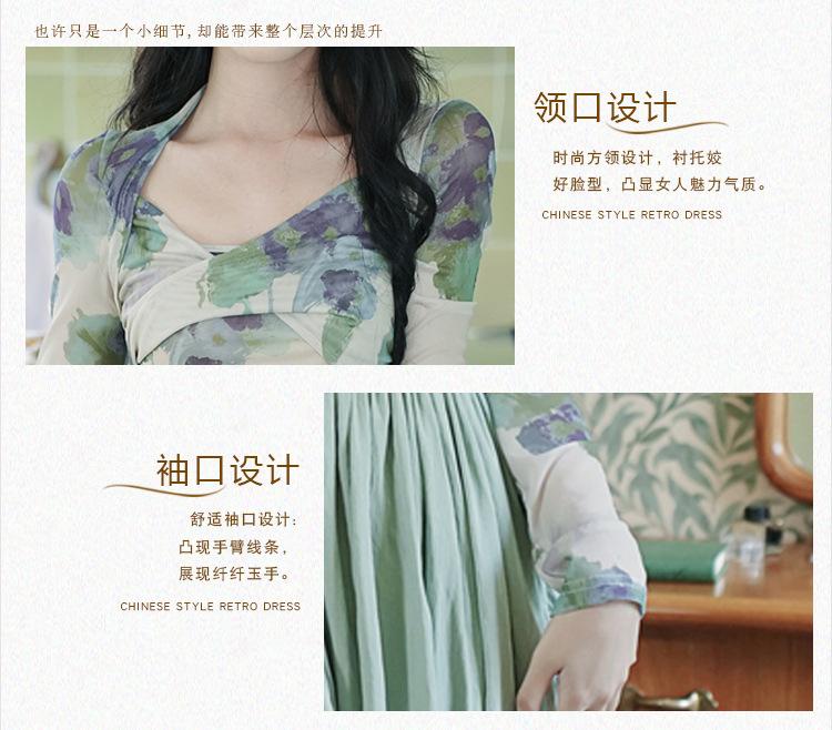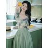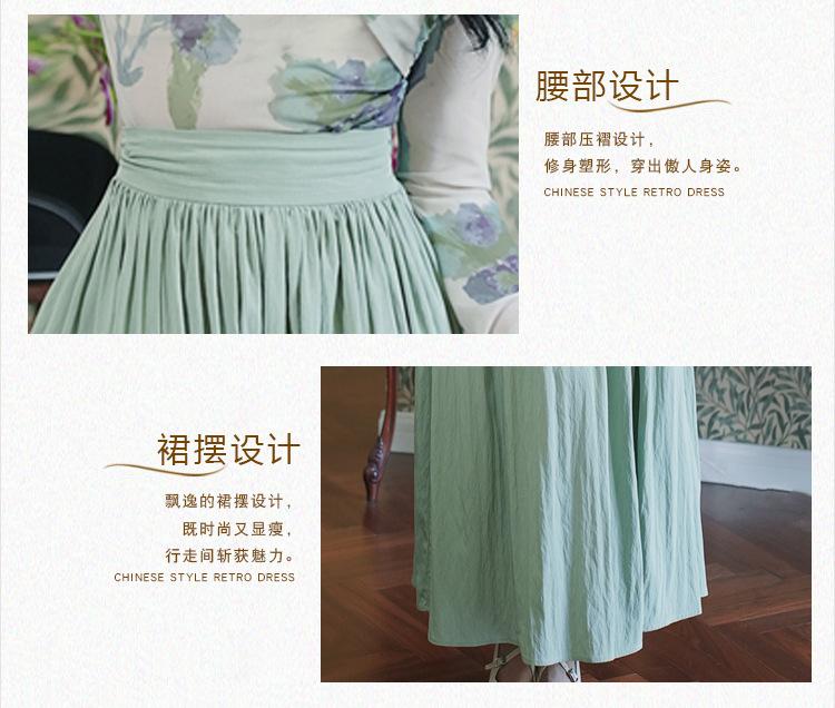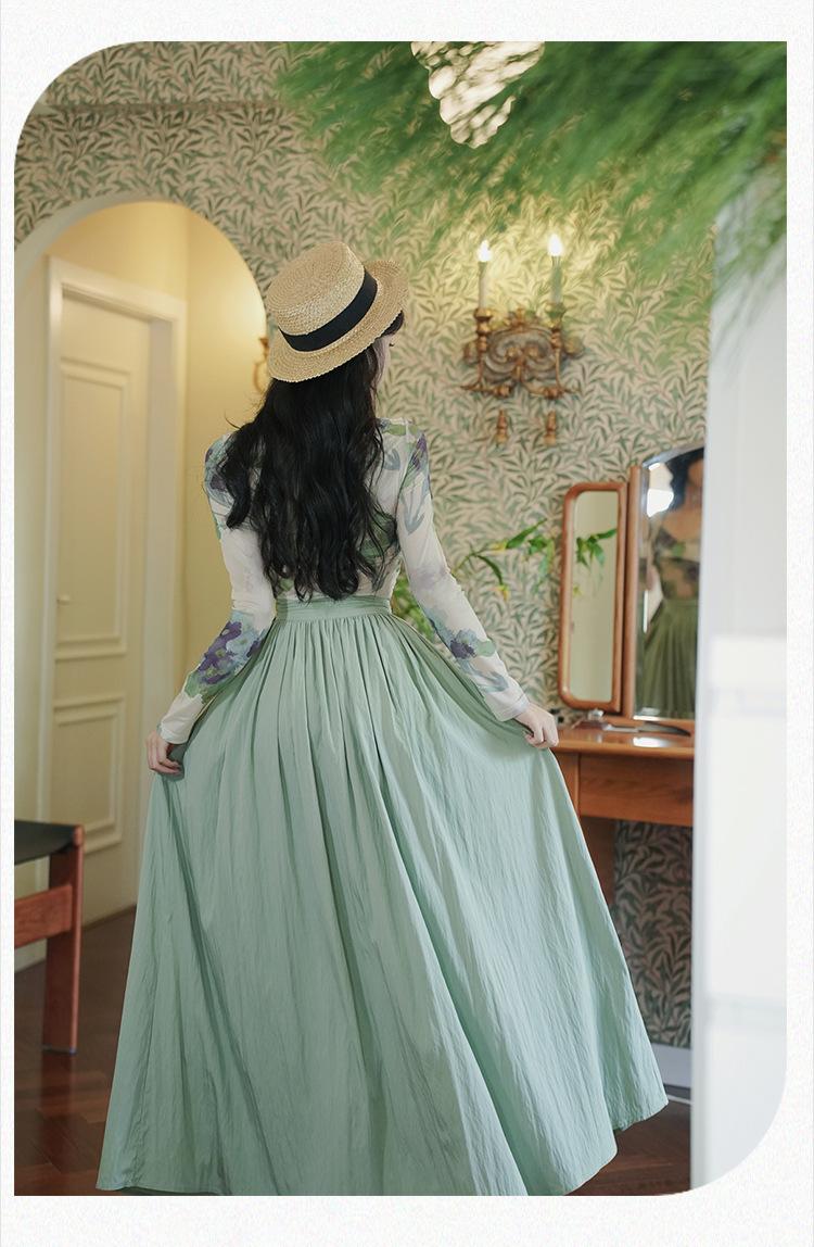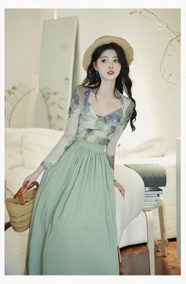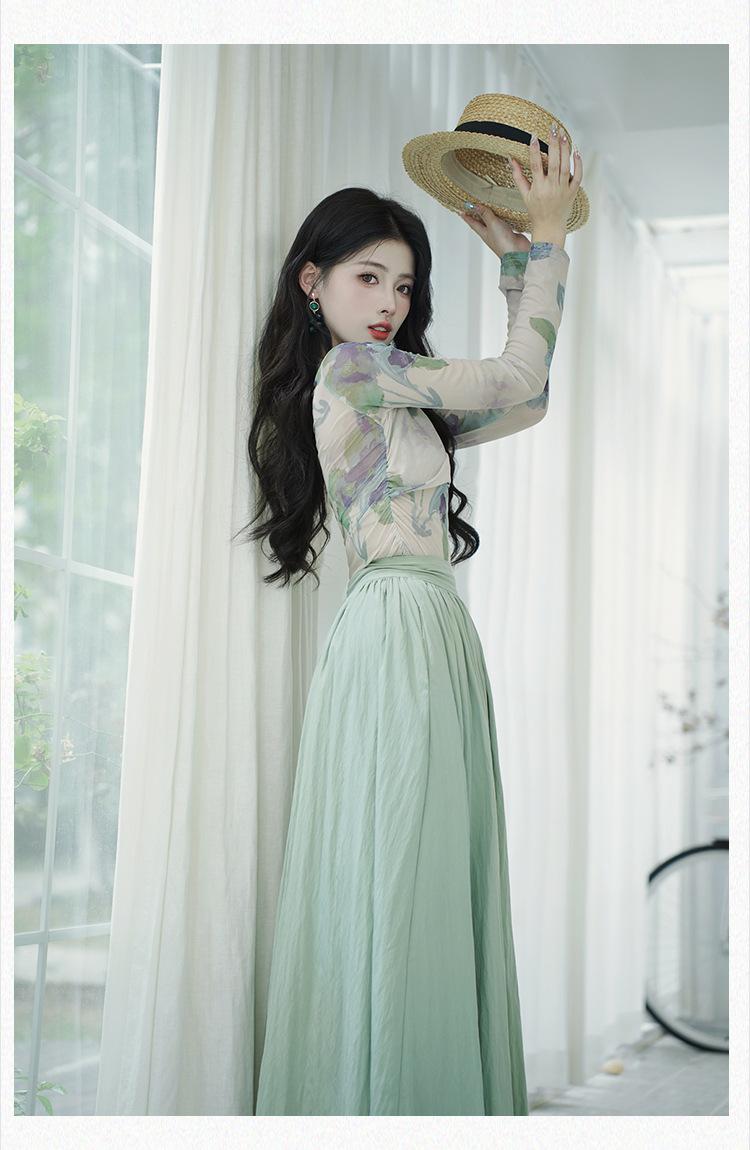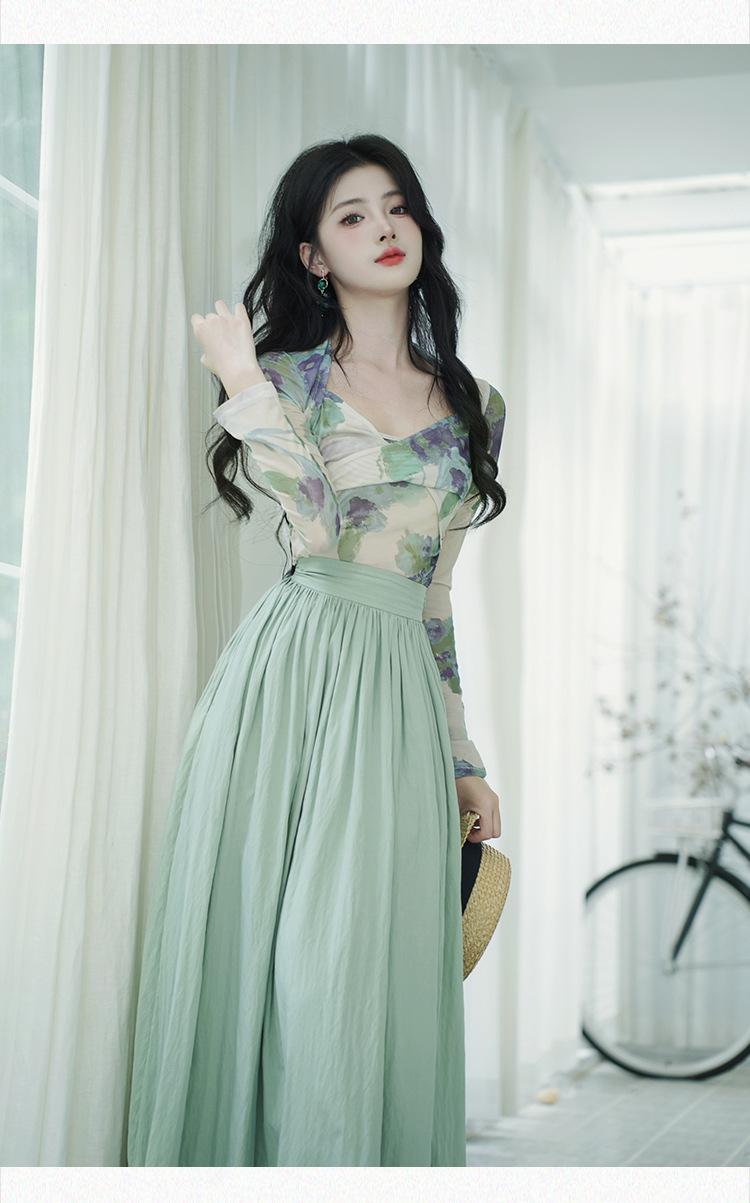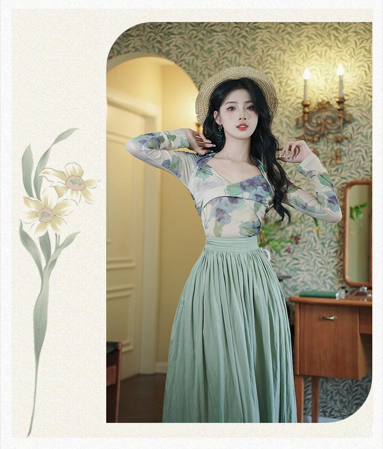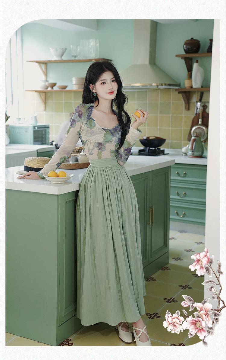 Top de malla francesa estampada en stock con falda retro de cintura alta y vuelo amplio
