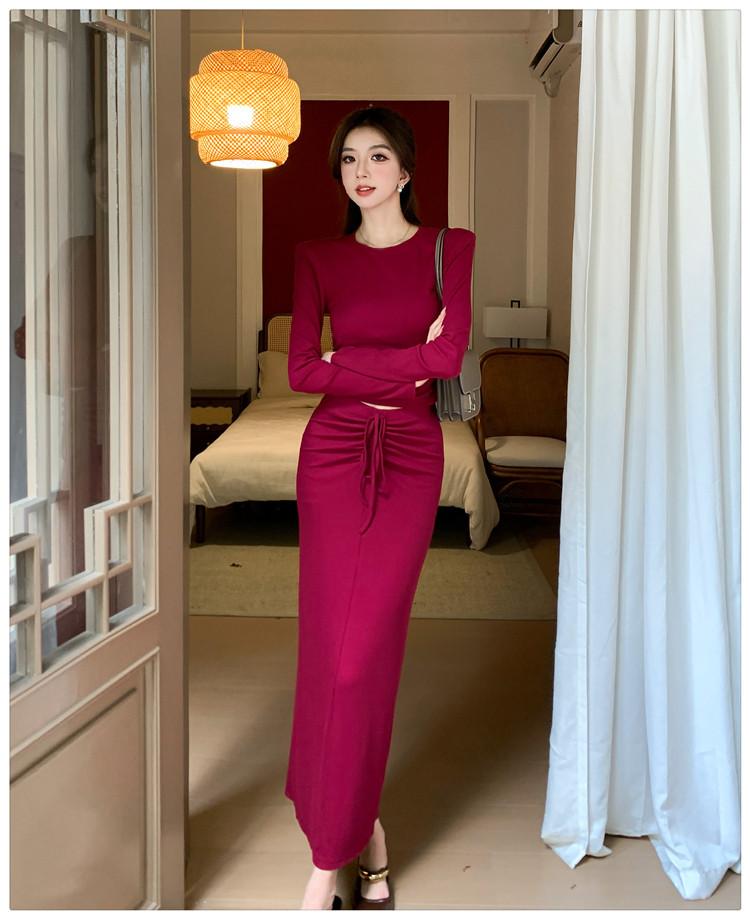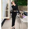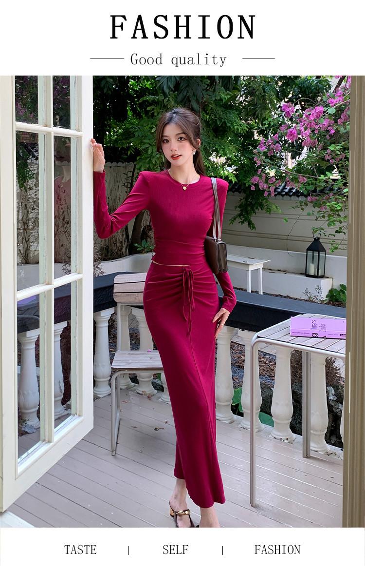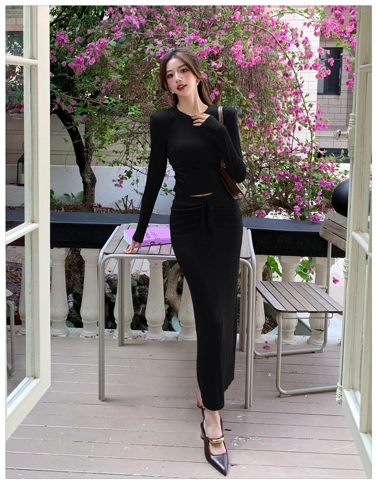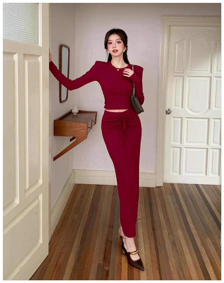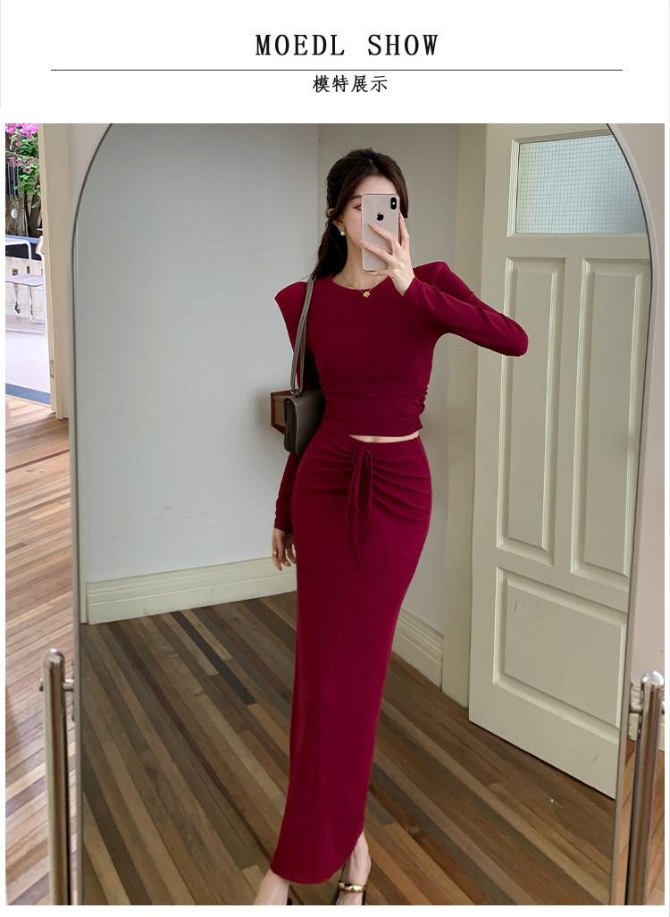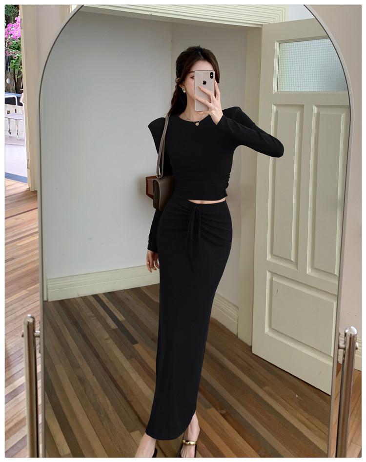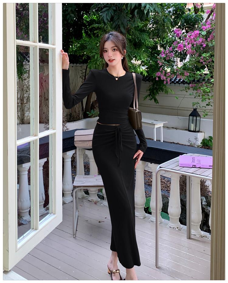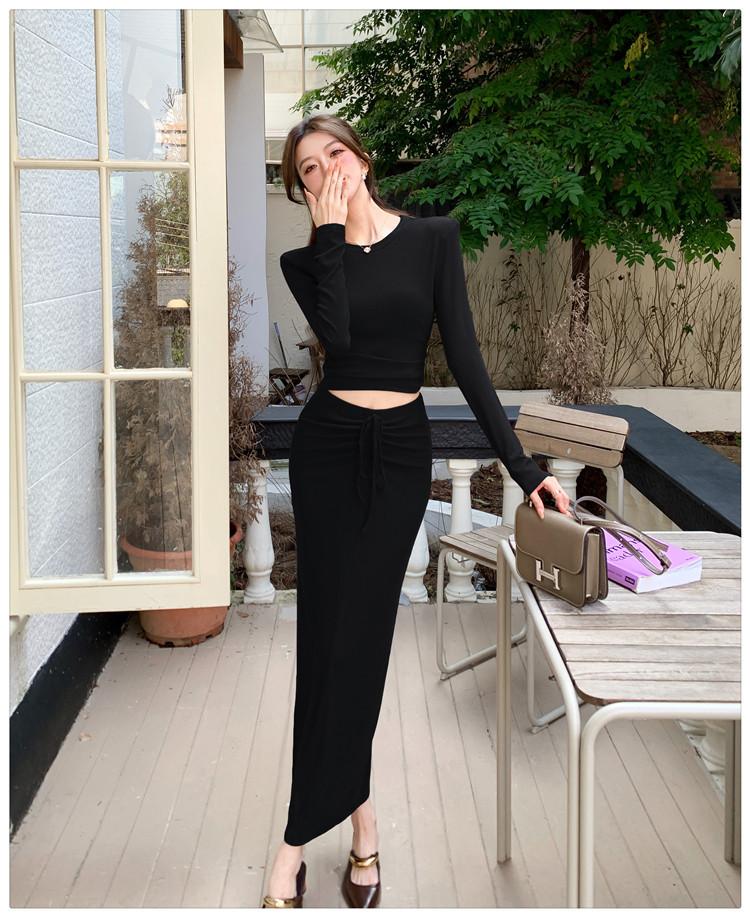 Conjunto de dos piezas de temperamento de chica sexy pura y transfronteriza 2025 para mujer, top de manga larga a la moda de otoño, conjunto de falda midi ajustada