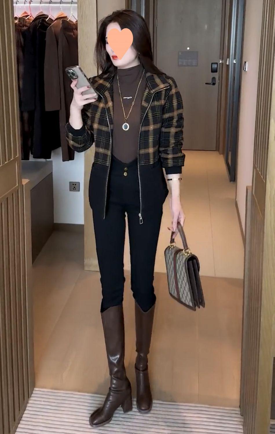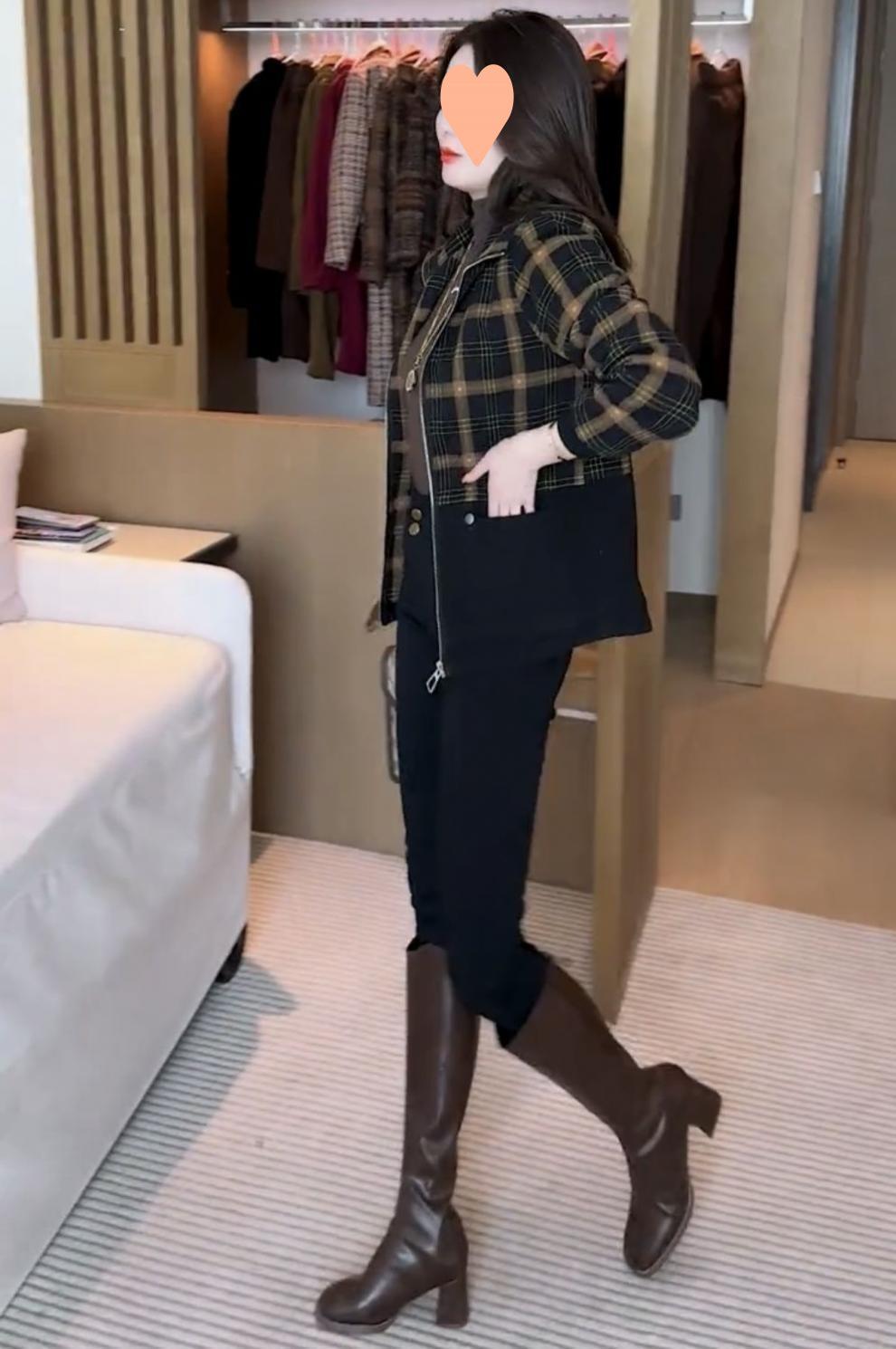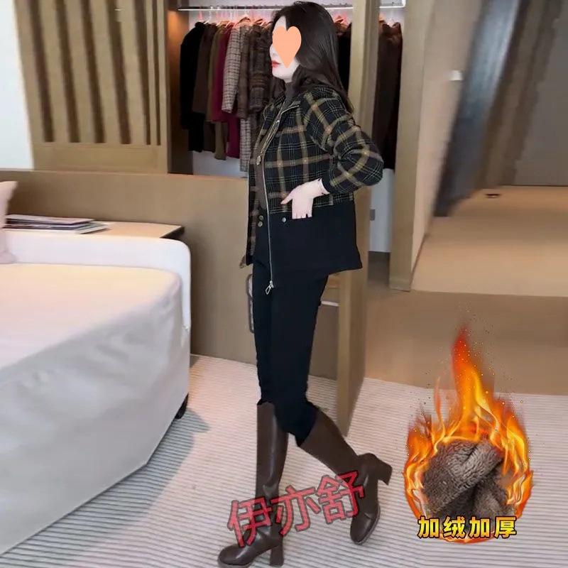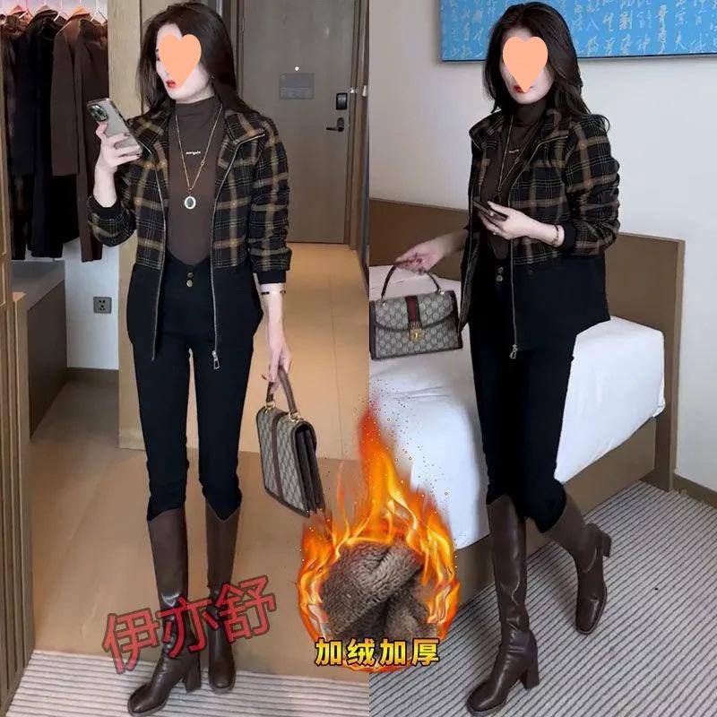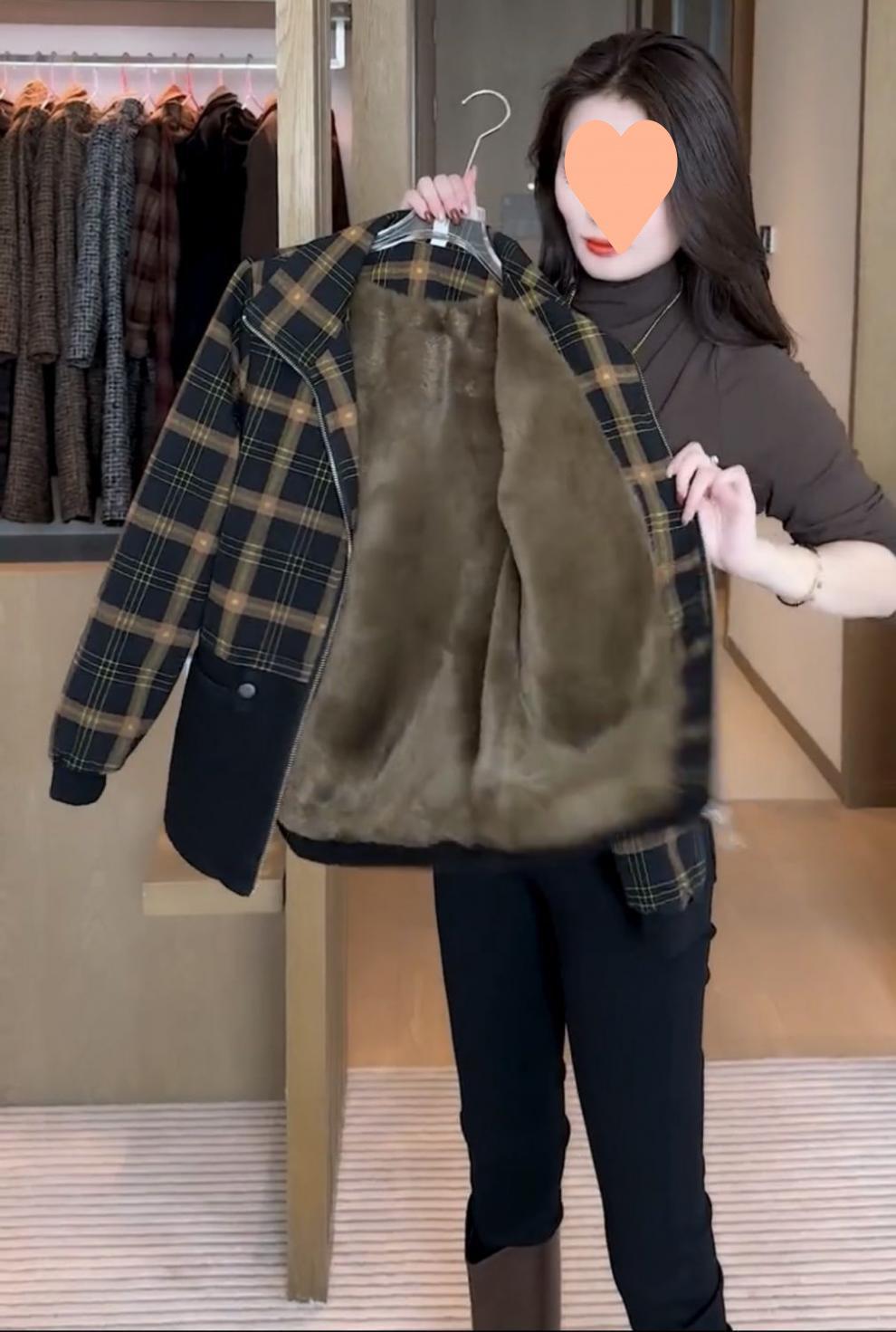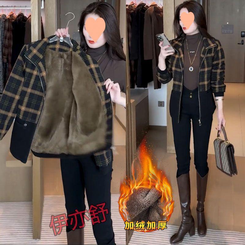 Chaqueta corta a cuadros gruesa con forro polar de moda para mujer 2025 Otoño/Invierno Nuevo estilo Adelgazante Petite Casual