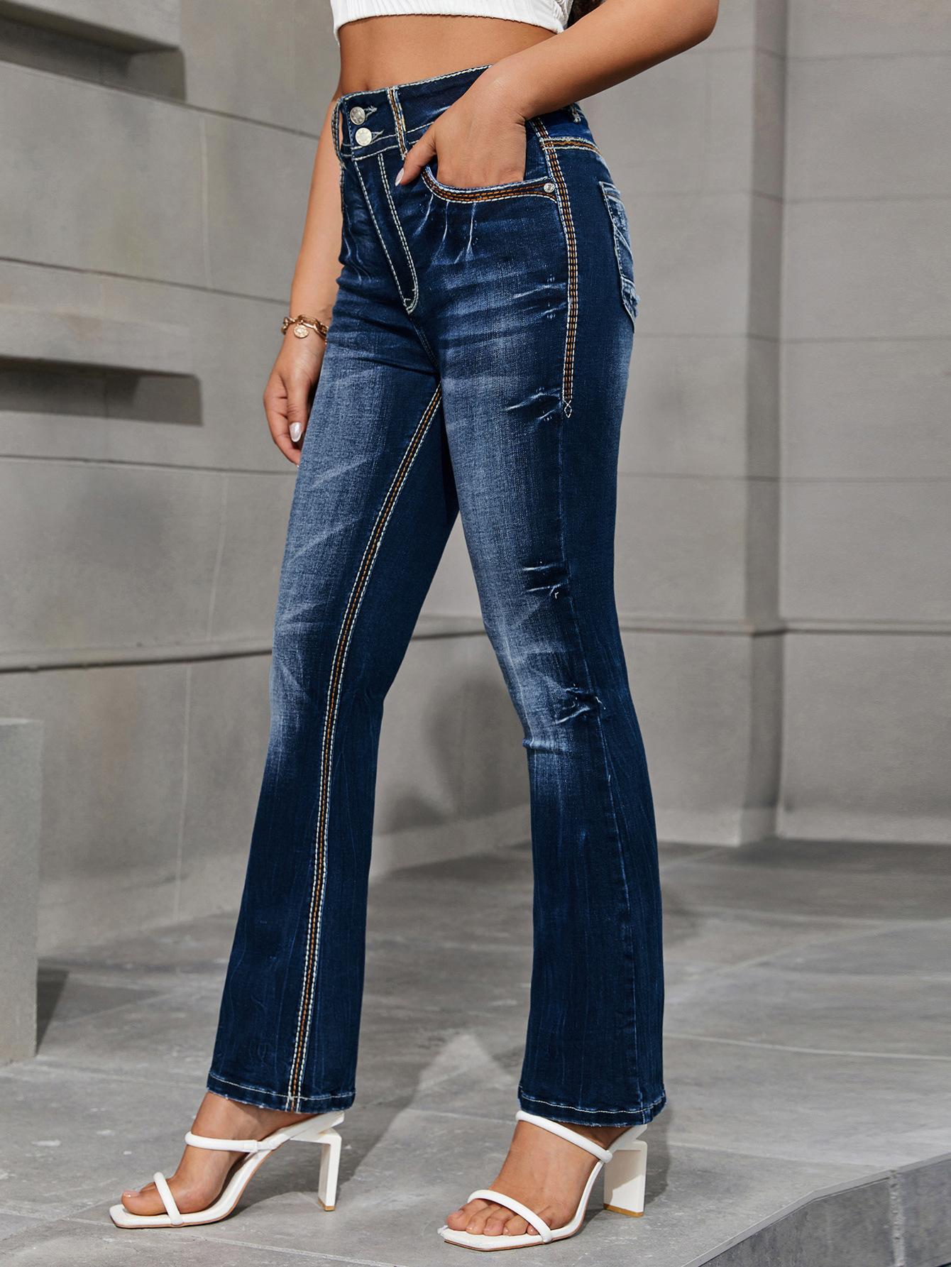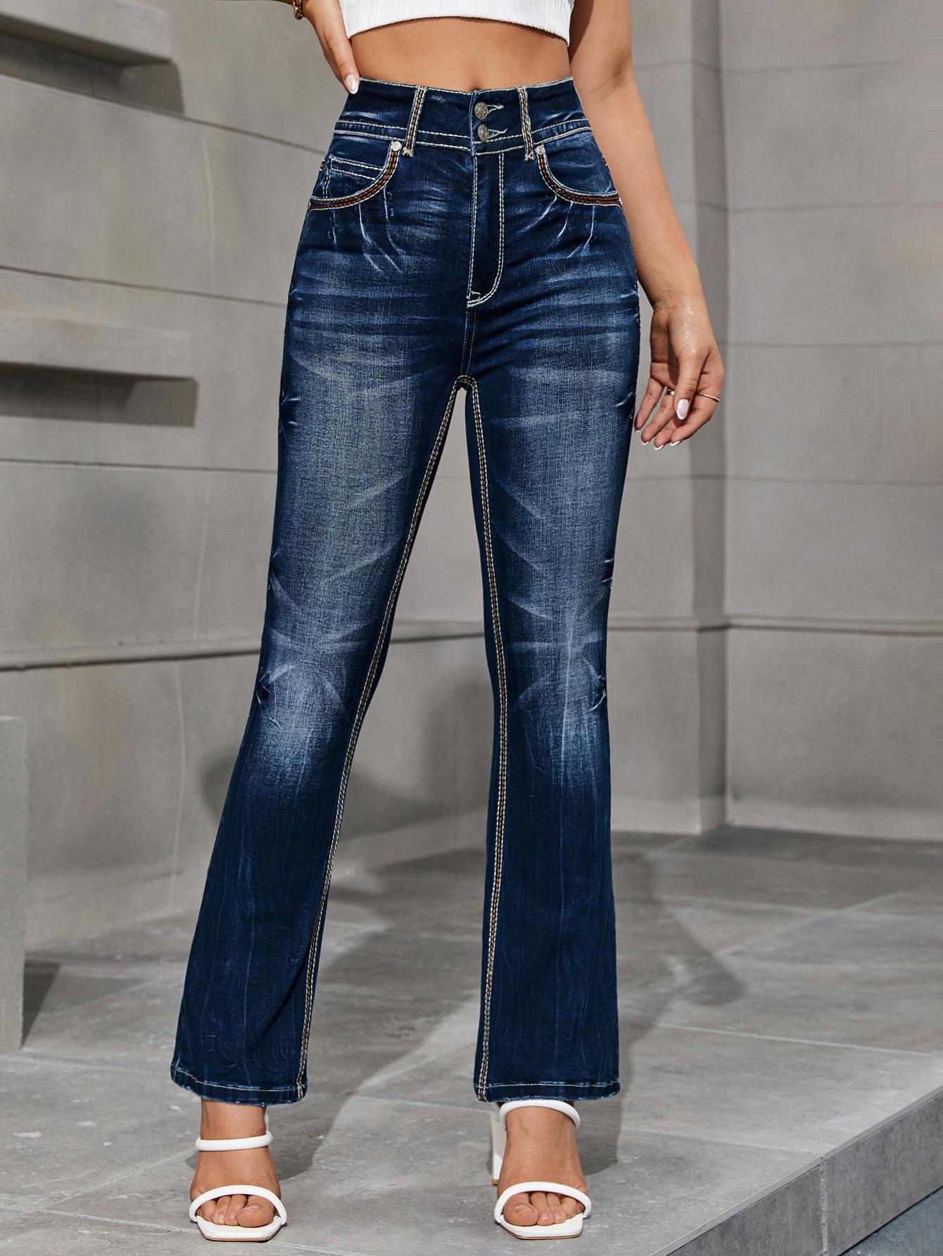 Jeans Transfronterizos Europeos y Americanos para Mujer Cintura Micro-alta Cómodos Corte Ajustado Adelgazantes Combinan con Todo Elásticos Mezclilla Rectos Pantalones Largos