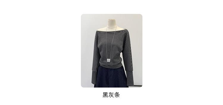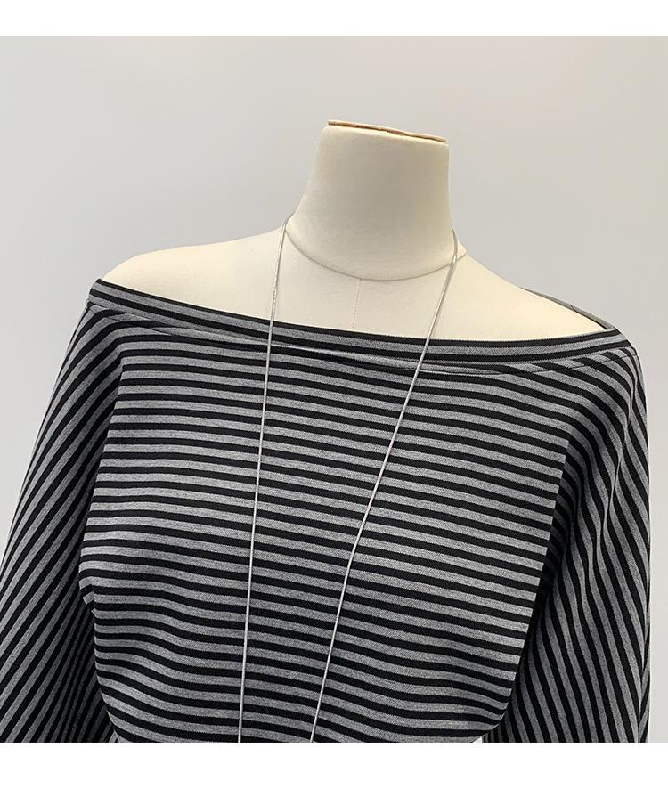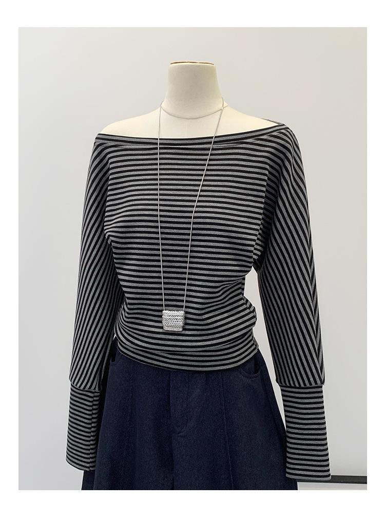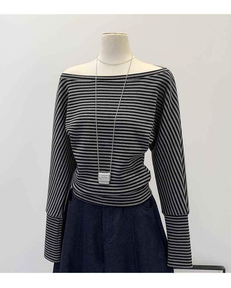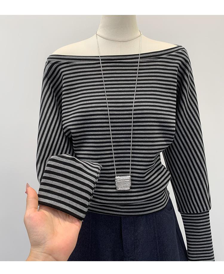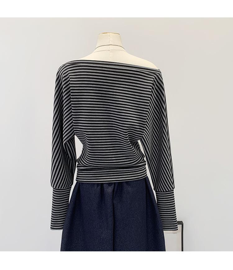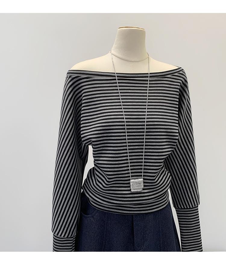 Camiseta de Manga Larga a Rayas con Hombro Descubierto de Diseño Nicho para Mujer Estilo Coreano Otoño 2025 Nueva Llegada Buen Artículo Top con Hombro Descubierto