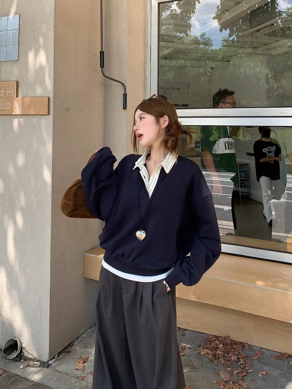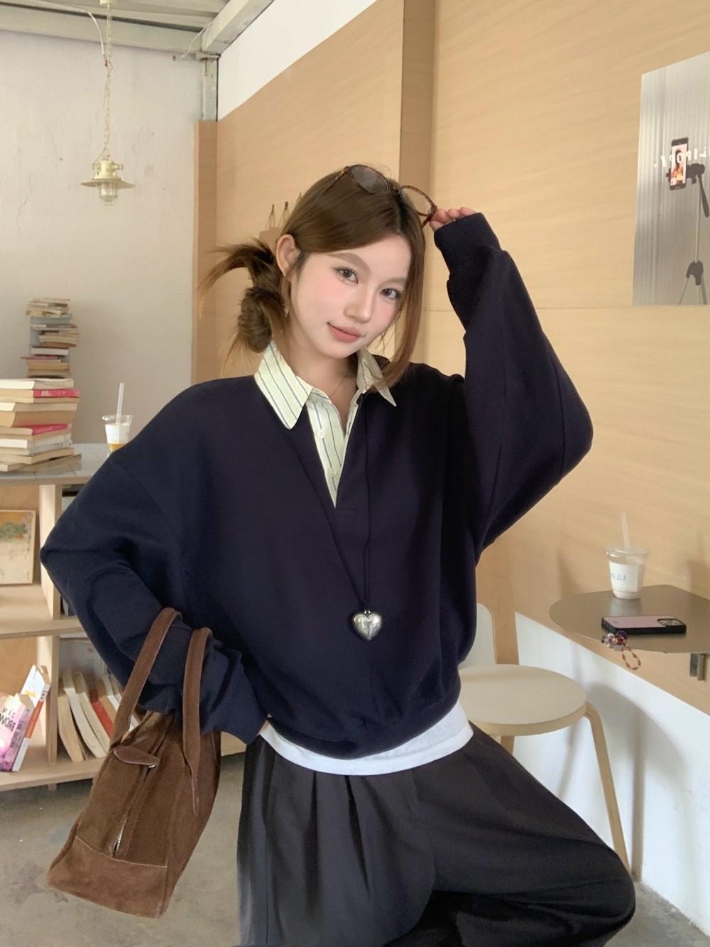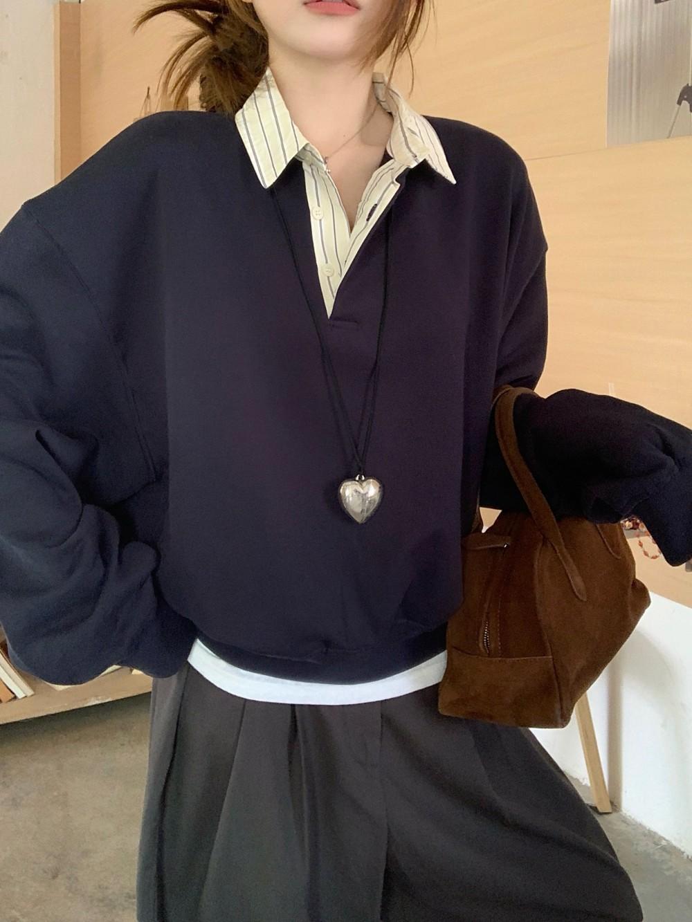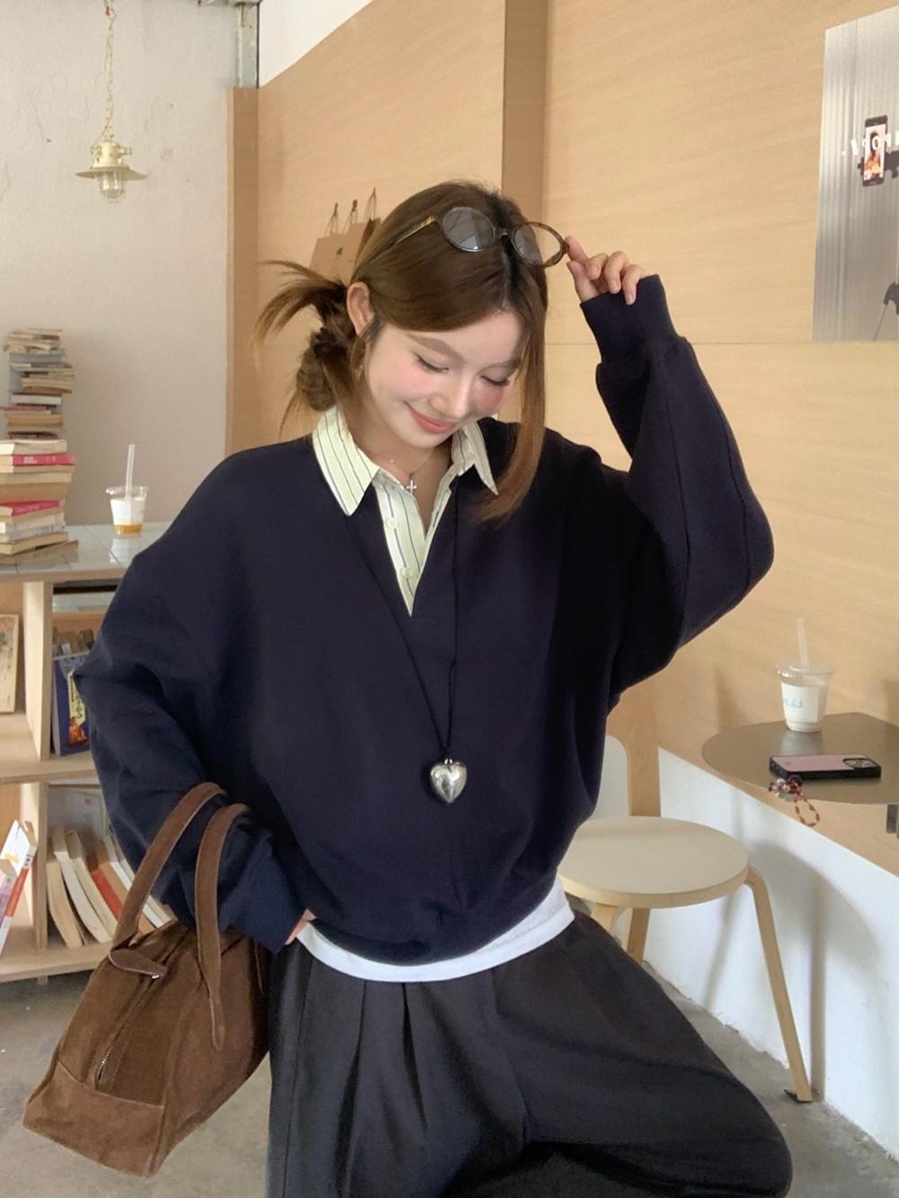 Foto Real Otoño 2025 Nuevo Dulce Estilo Preppy Falso Dos Piezas Cuello Camisero Suéter Holgado Mujer 89138