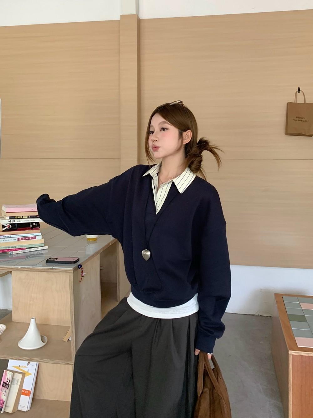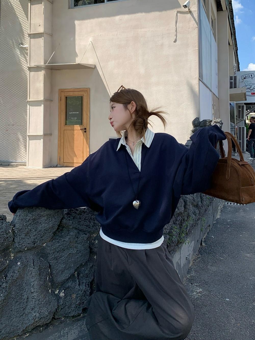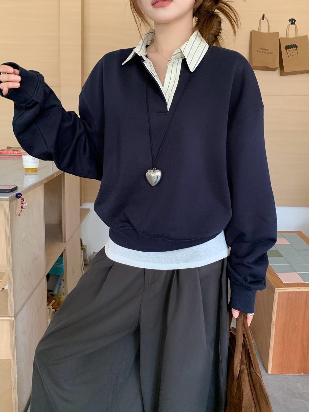 Foto Real Otoño 2025 Nuevo Dulce Estilo Preppy Falso Dos Piezas Cuello Camisero Suéter Holgado Mujer 89138
