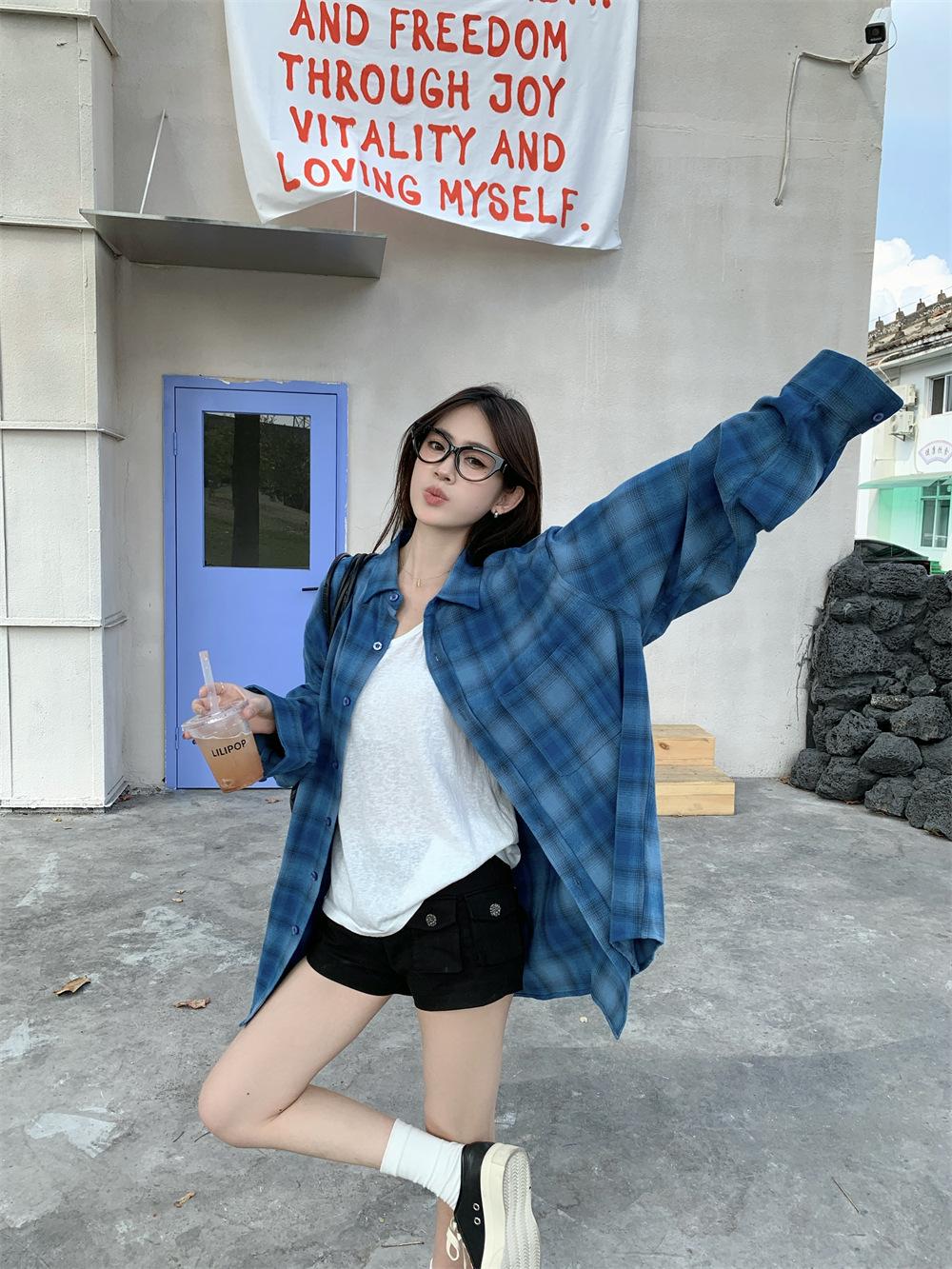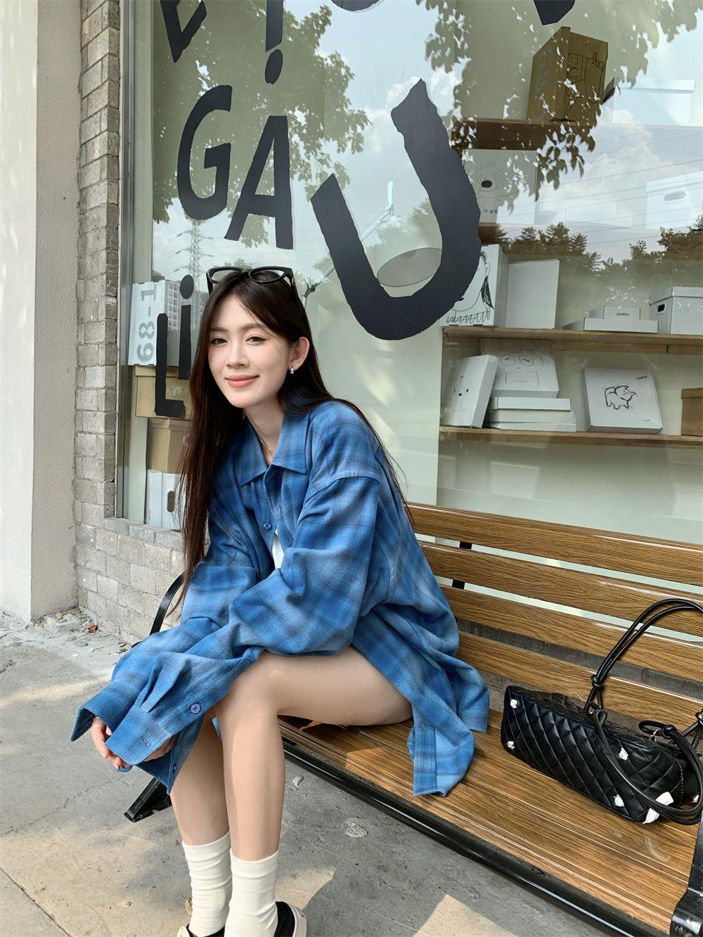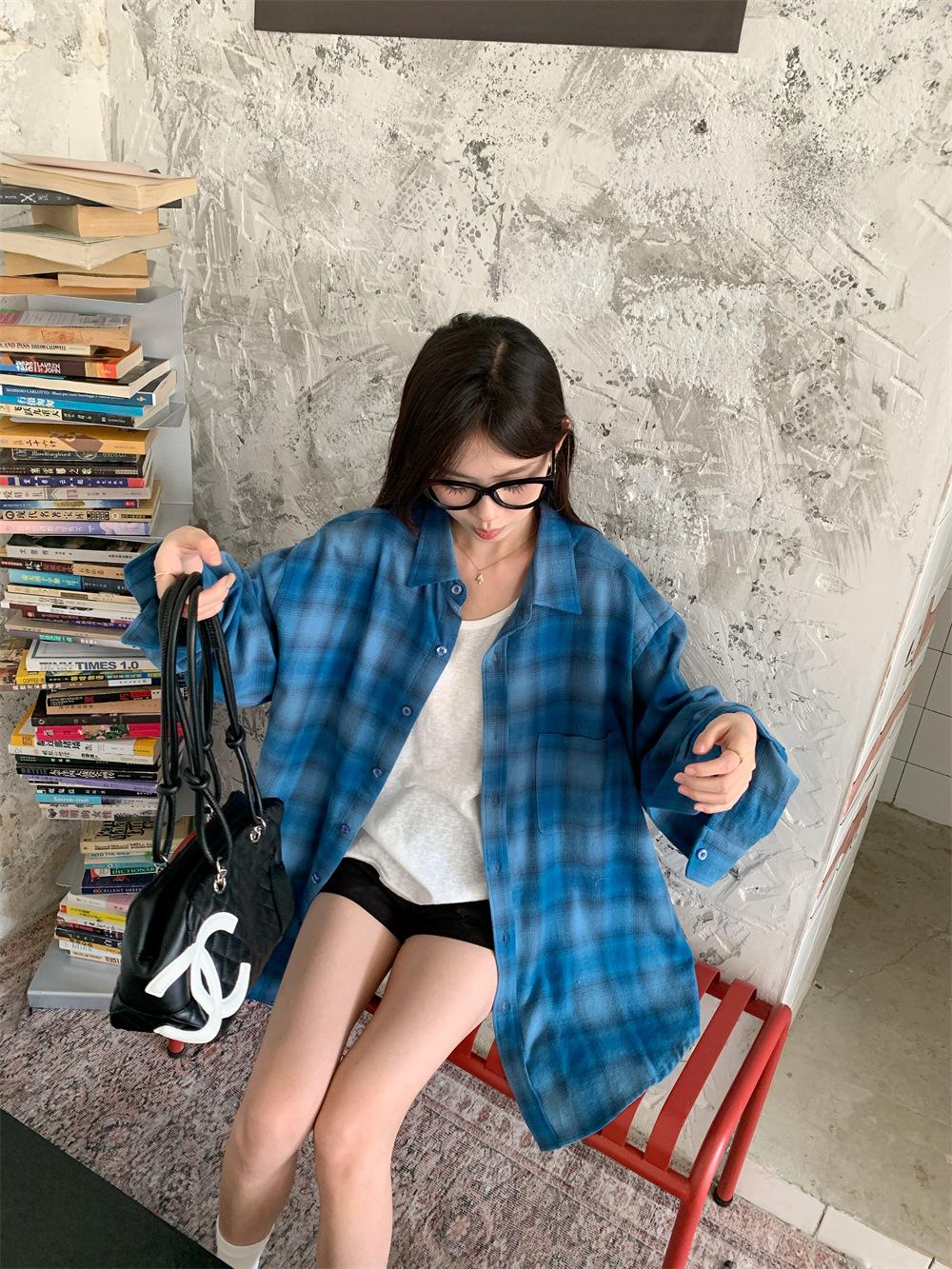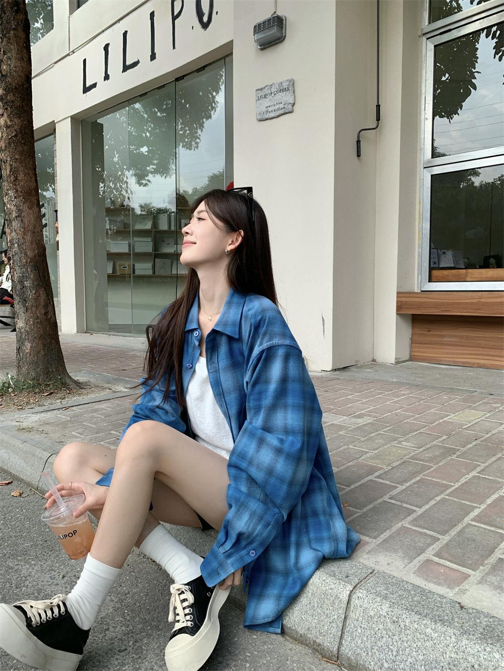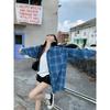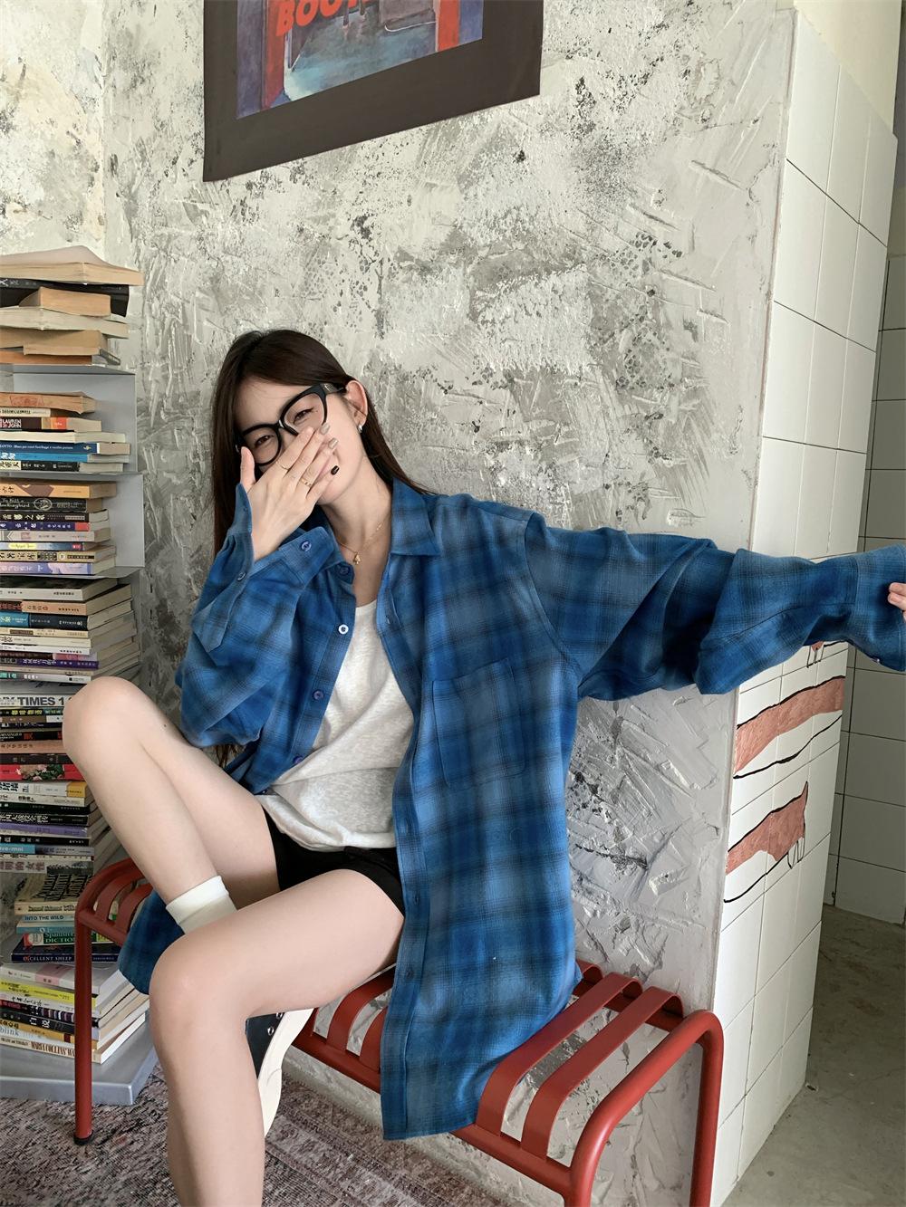Foto Real Chaqueta Camisa de Cuadros Azul Cepillado Mujer Otoño 2025 Diseño Sensación Camisa Holgada Top Marea 88986