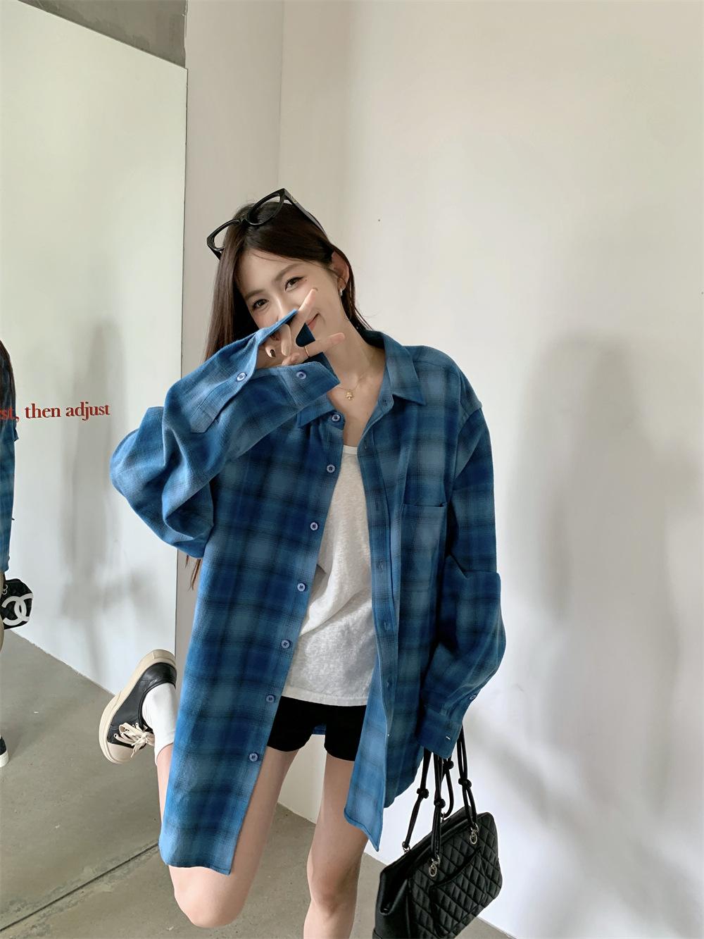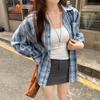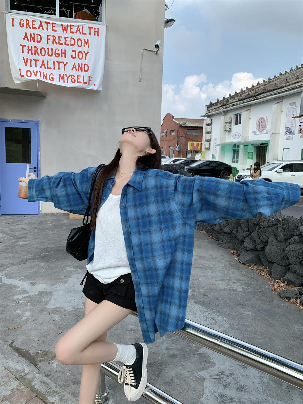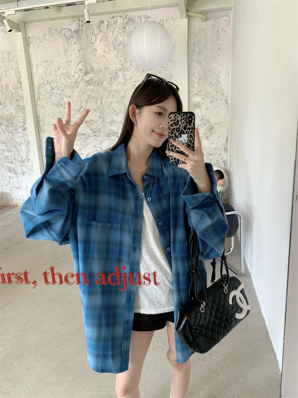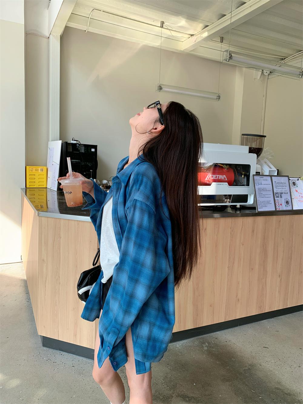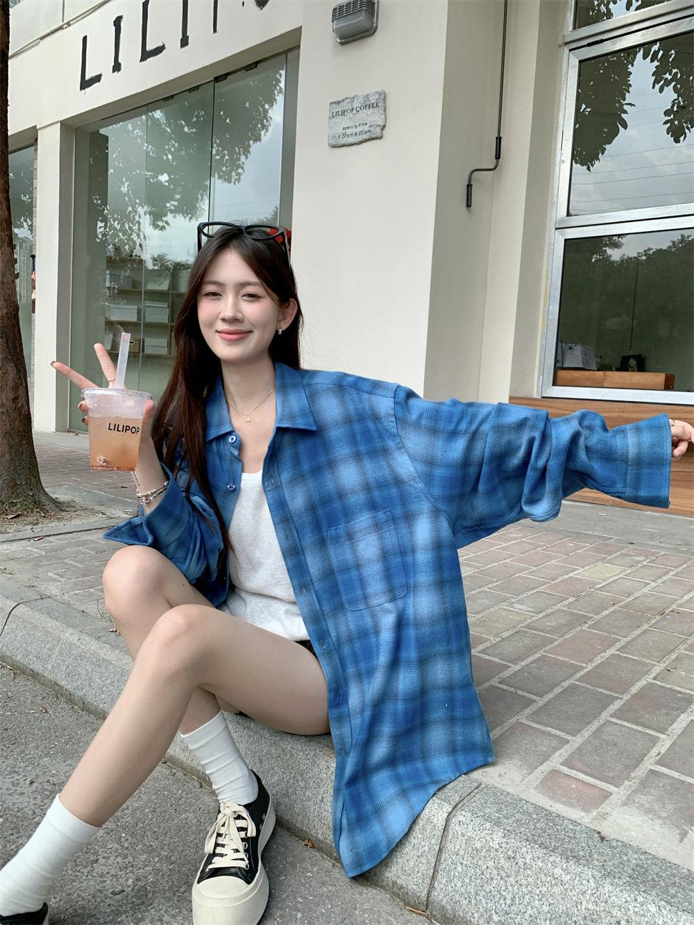 Foto Real Chaqueta Camisa de Cuadros Azul Cepillado Mujer Otoño 2025 Diseño Sensación Camisa Holgada Top Marea 88986