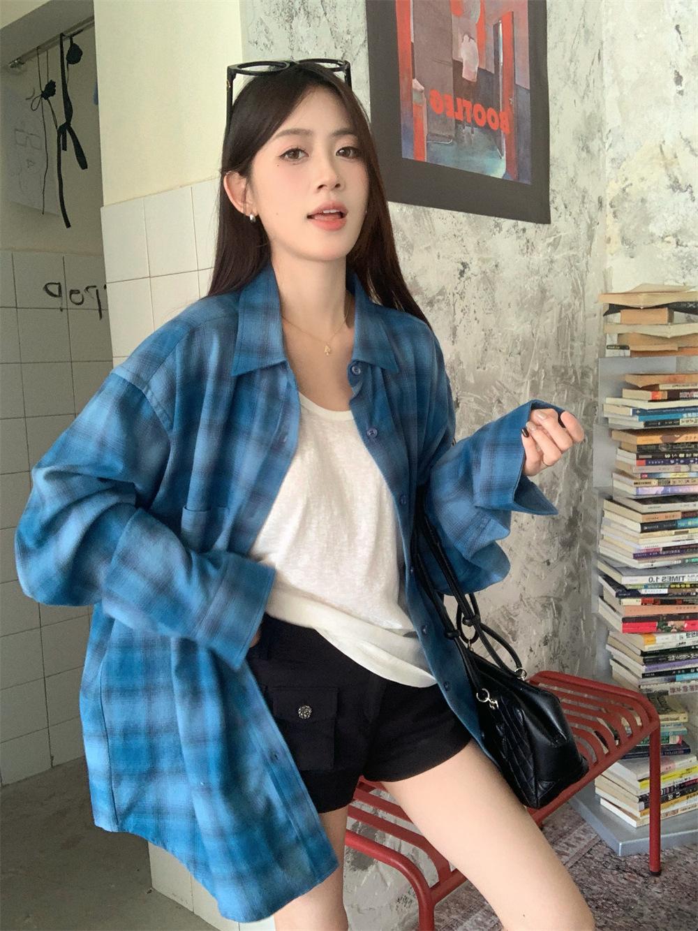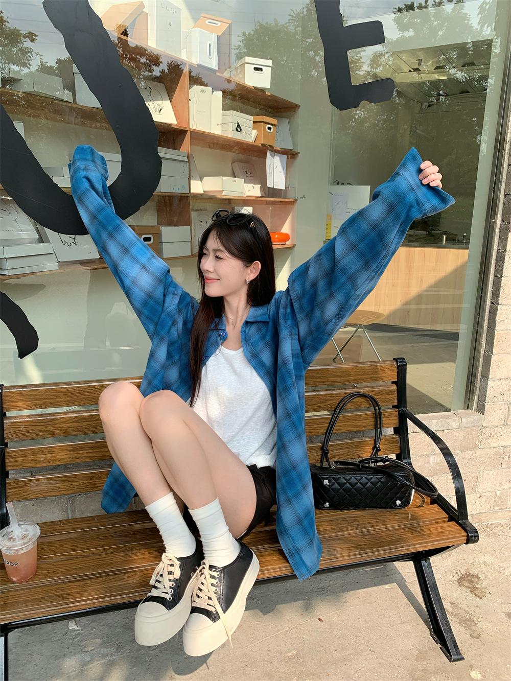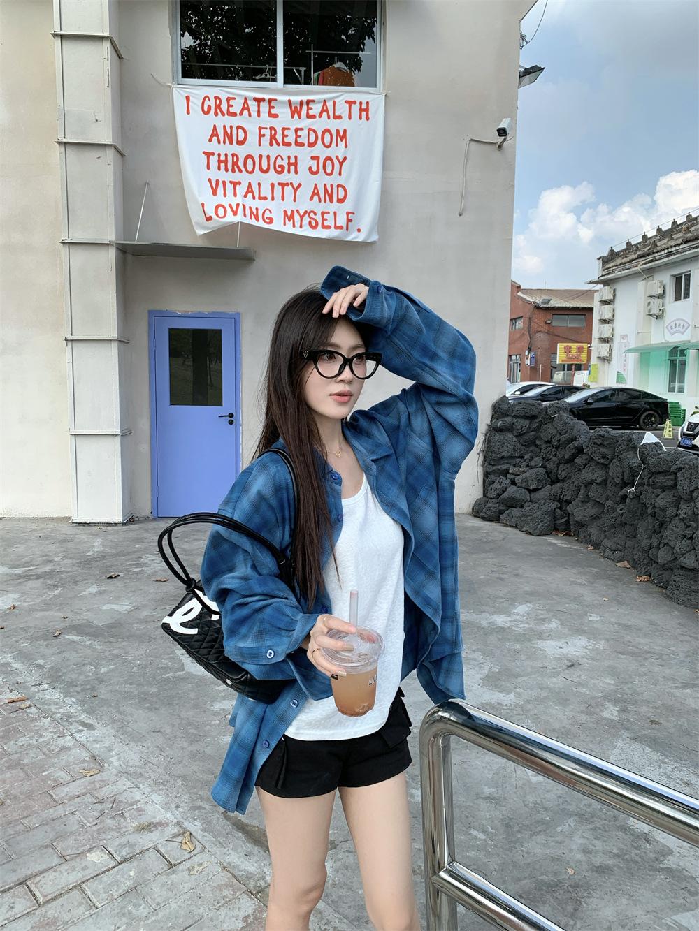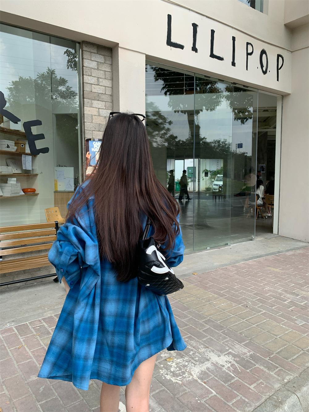 Foto Real Chaqueta Camisa de Cuadros Azul Cepillado Mujer Otoño 2025 Diseño Sensación Camisa Holgada Top Marea 88986