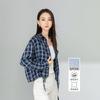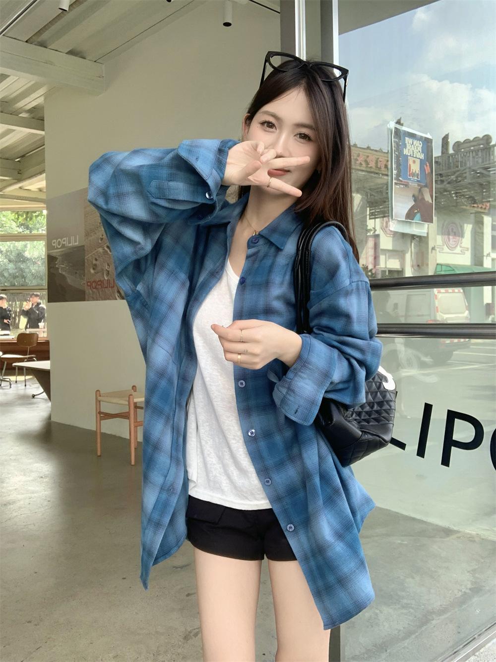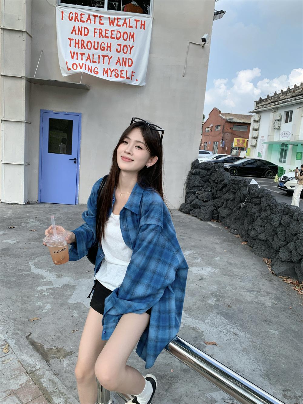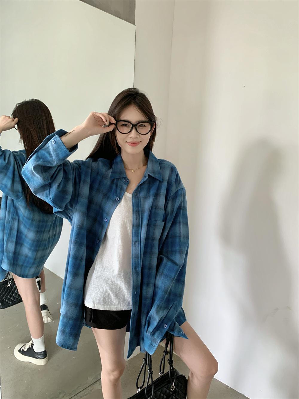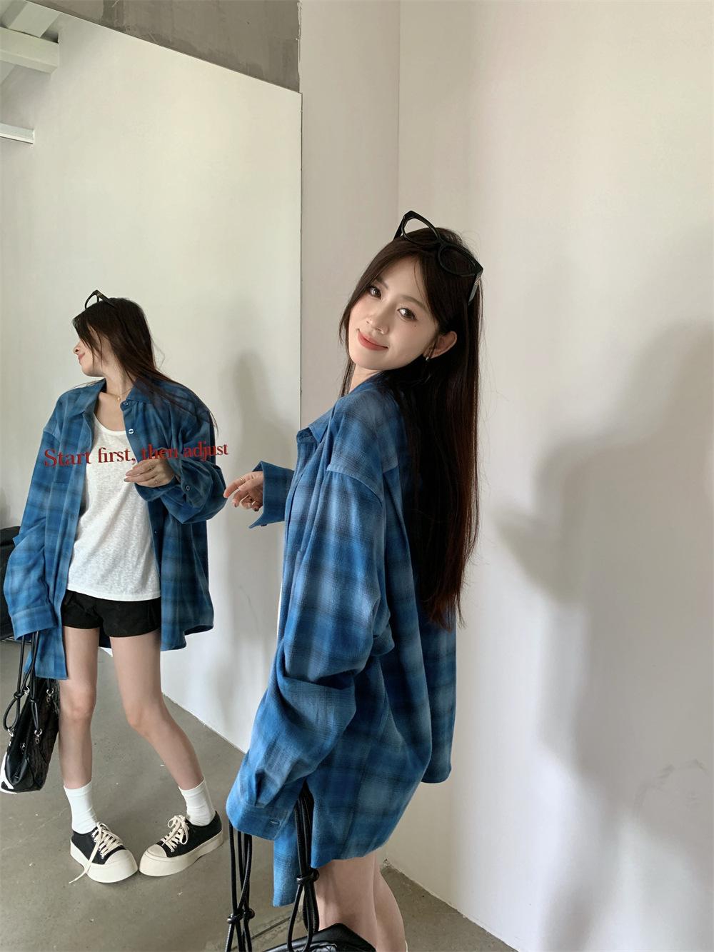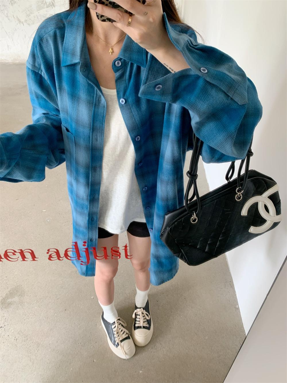 Foto Real Chaqueta Camisa de Cuadros Azul Cepillado Mujer Otoño 2025 Diseño Sensación Camisa Holgada Top Marea 88986