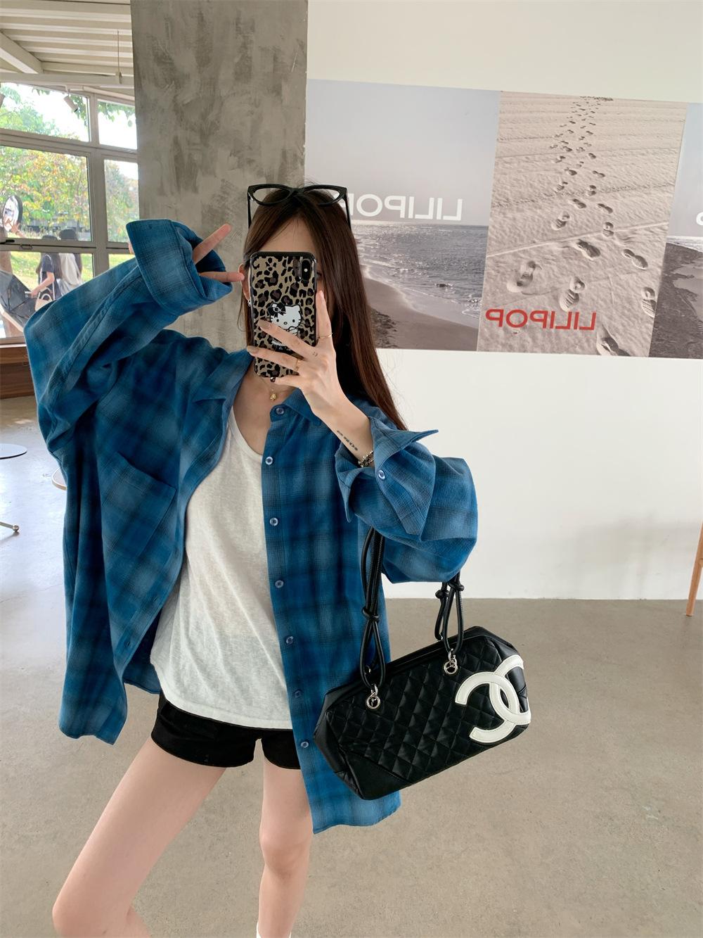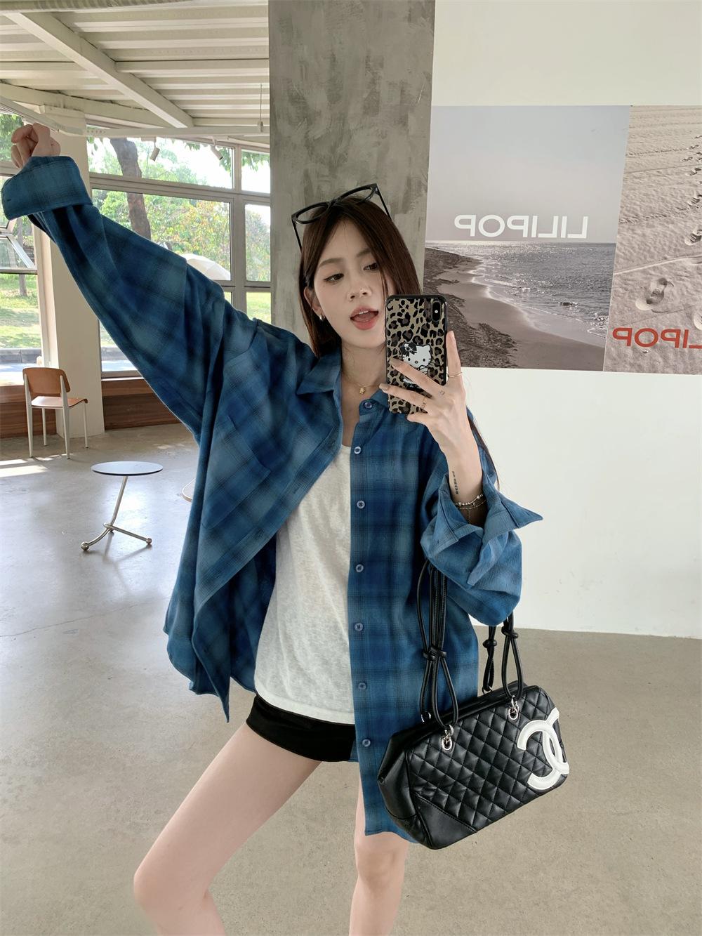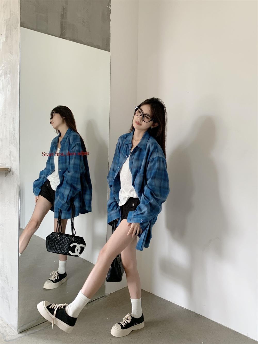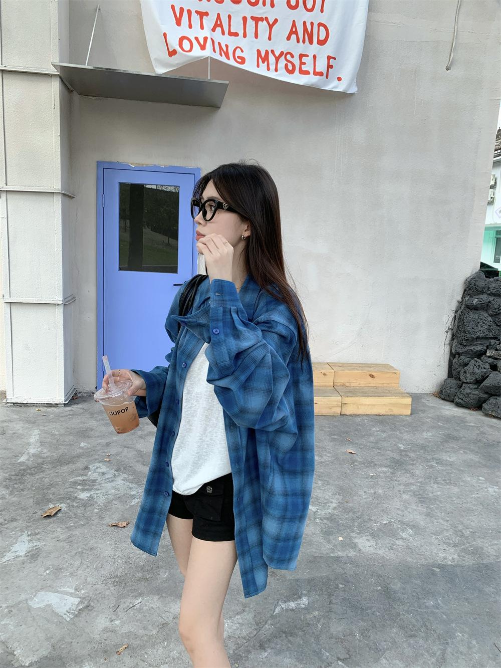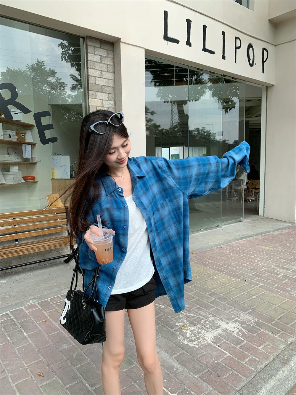 Foto Real Chaqueta Camisa de Cuadros Azul Cepillado Mujer Otoño 2025 Diseño Sensación Camisa Holgada Top Marea 88986