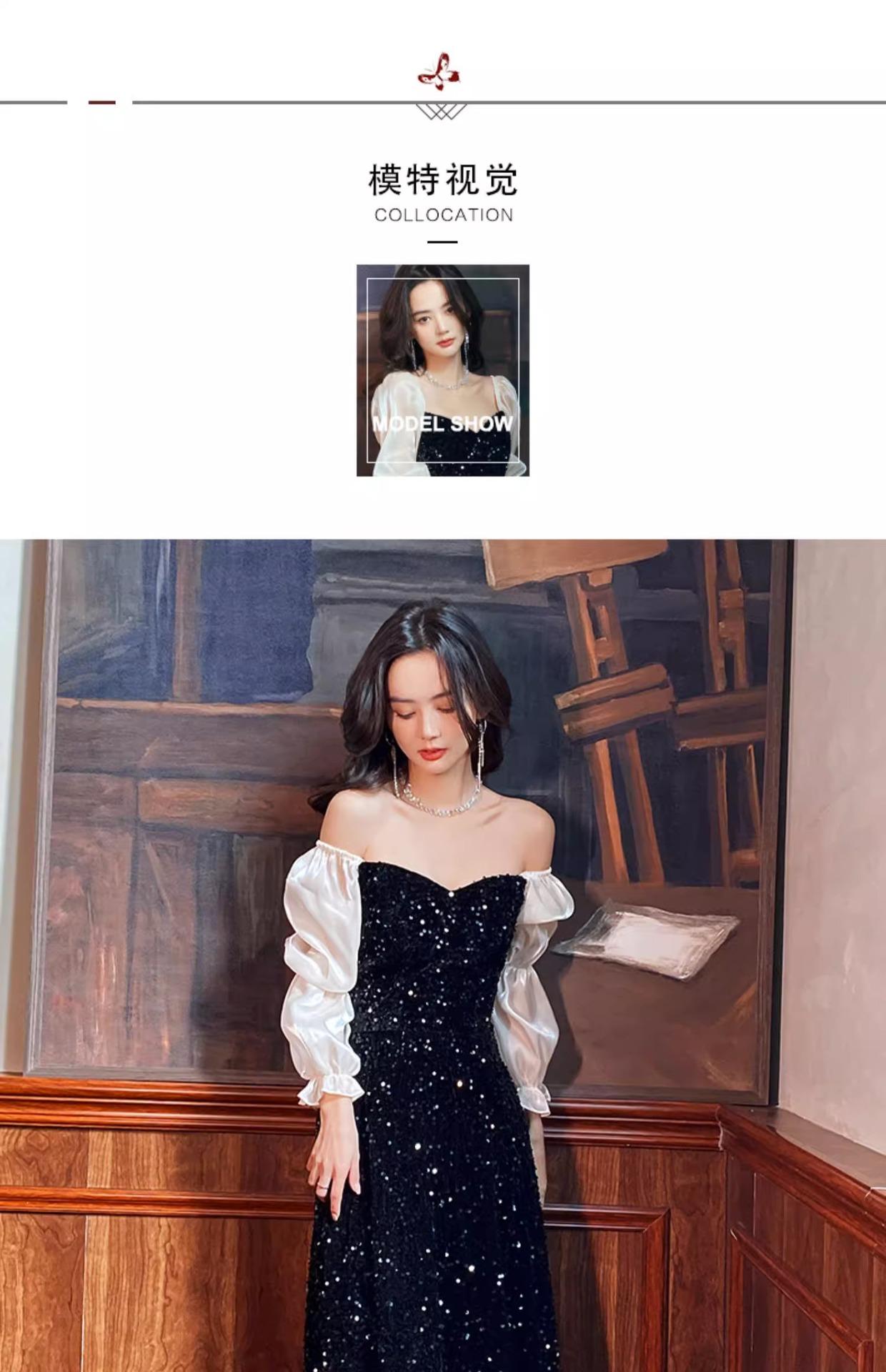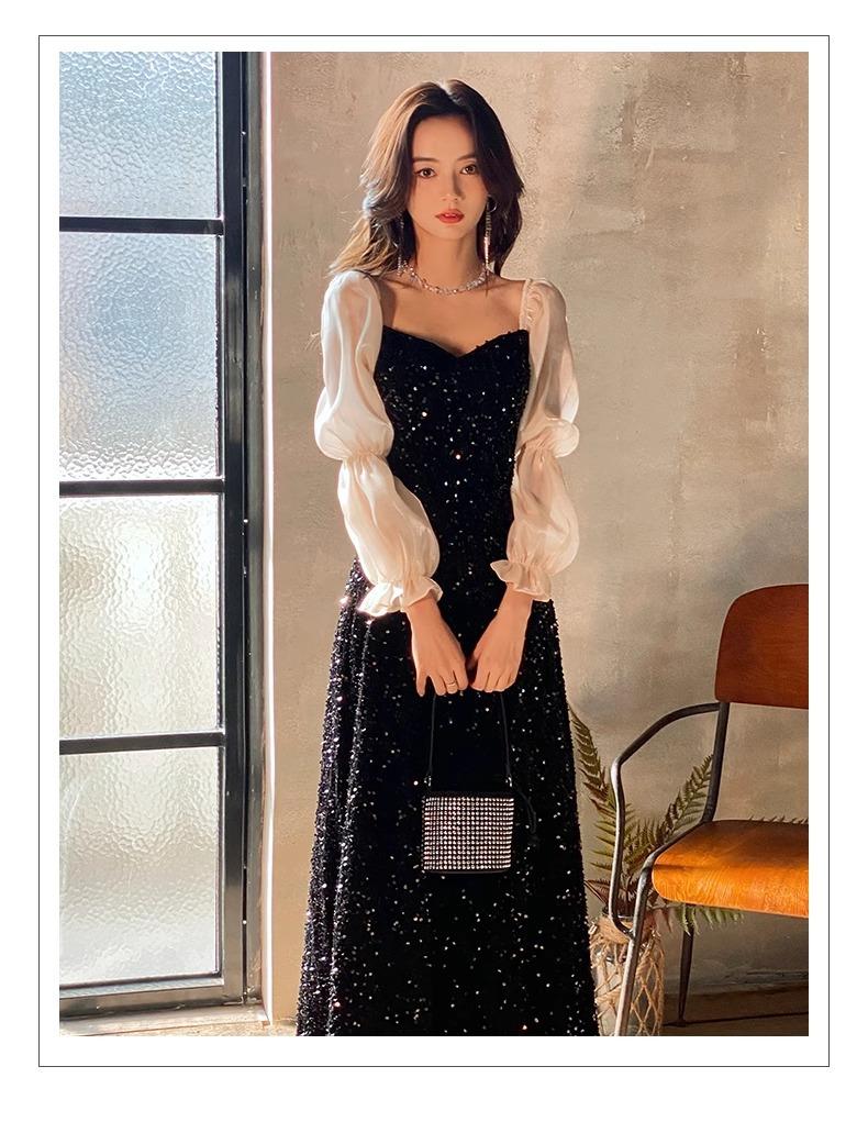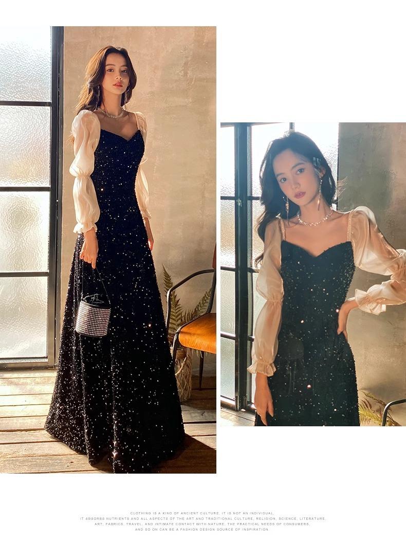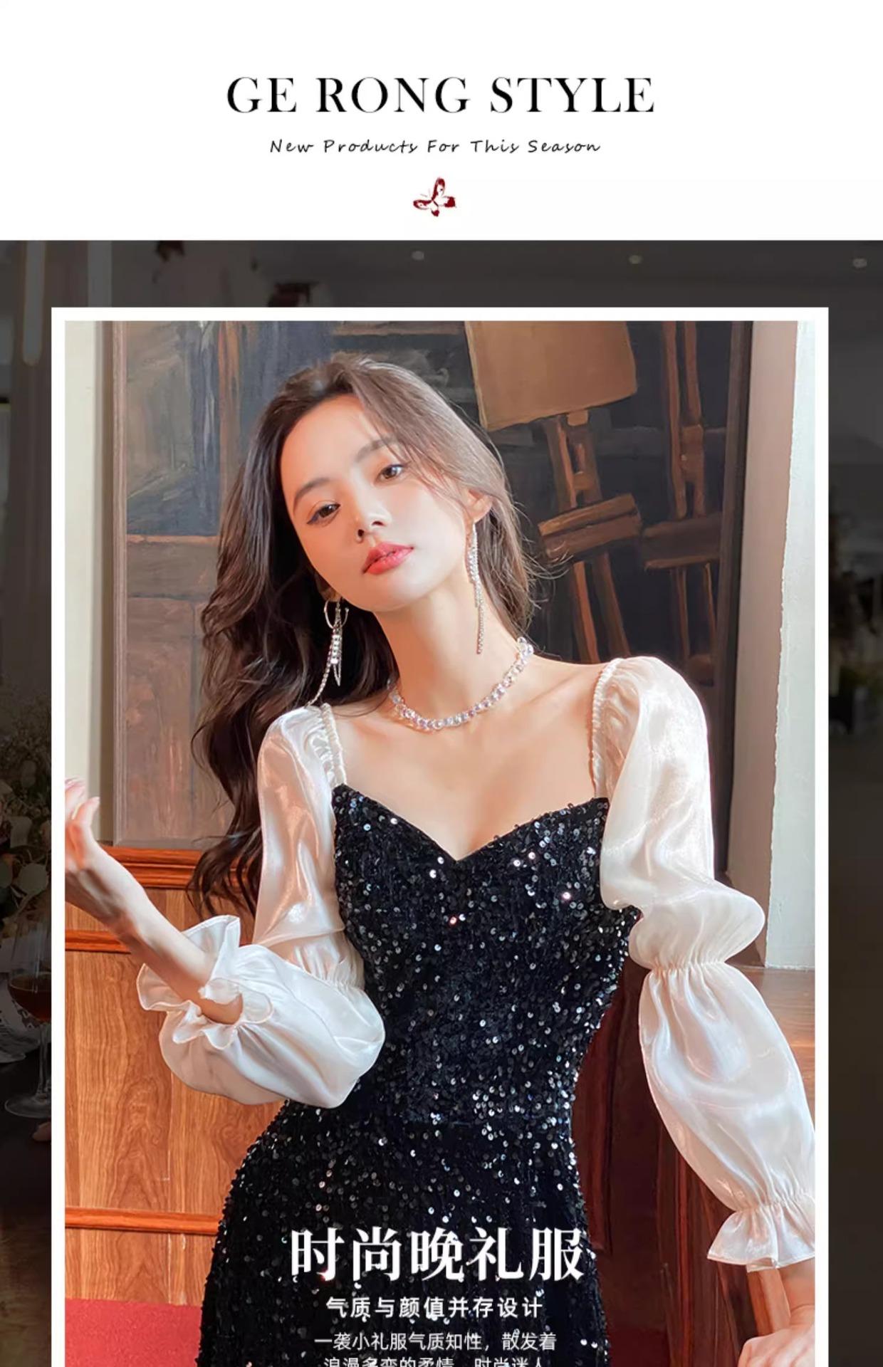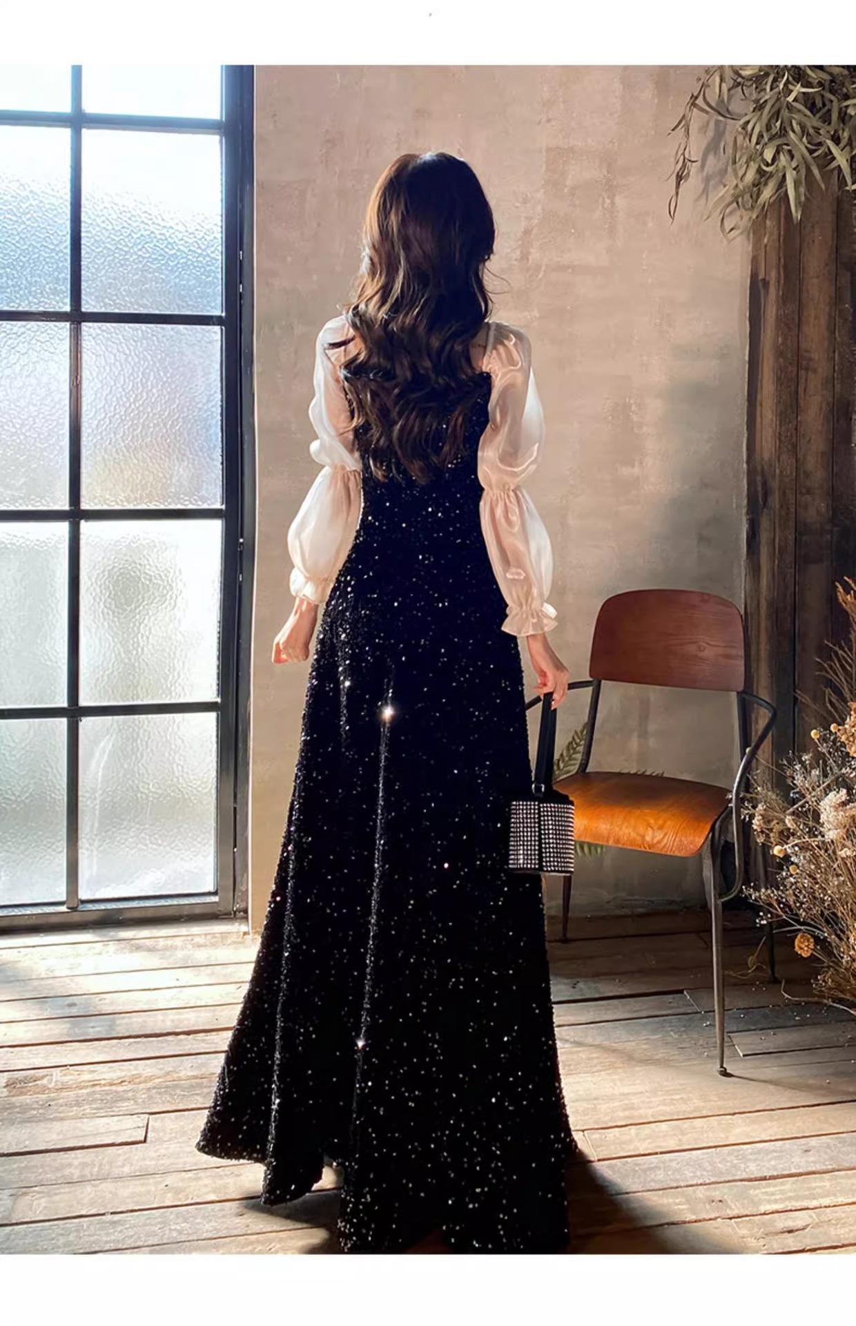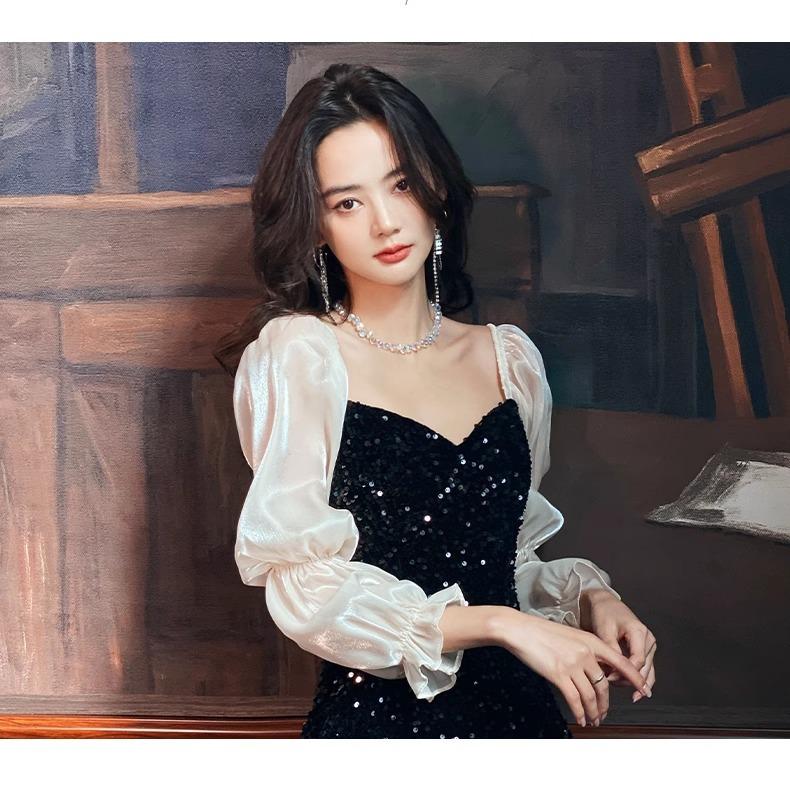 Vestido de Noche Negro para Reunión Anual para Mujer 2025 Nuevo Elegante con Clase Anfitrión Textura con Clase Manga Larga Examen de Arte Noble