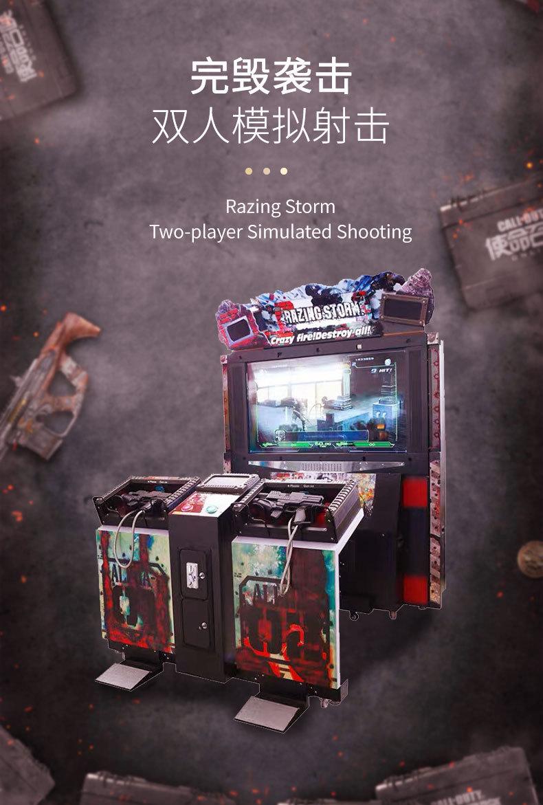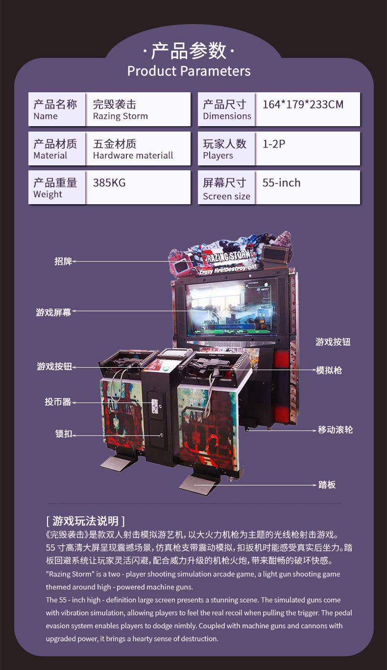 "Razing Storm" es un juego arcade de simulación de disparos para dos jugadores, un juego de disparos con pistola de luz temático sobre ametralladoras de alta potencia. La pantalla grande de alta definición de 55 pulgadas presenta una escena impresionante. Las pistolas simuladas vienen con simulación de vibración, permitiendo a los jugadores sentir el retroceso real al apretar el gatillo. El sistema de evasión con pedal permite a los jugadores esquivar ágilmente. Junto con ametralladoras y cañones con potencia mejorada, aporta una cordial sensación de destrucción.