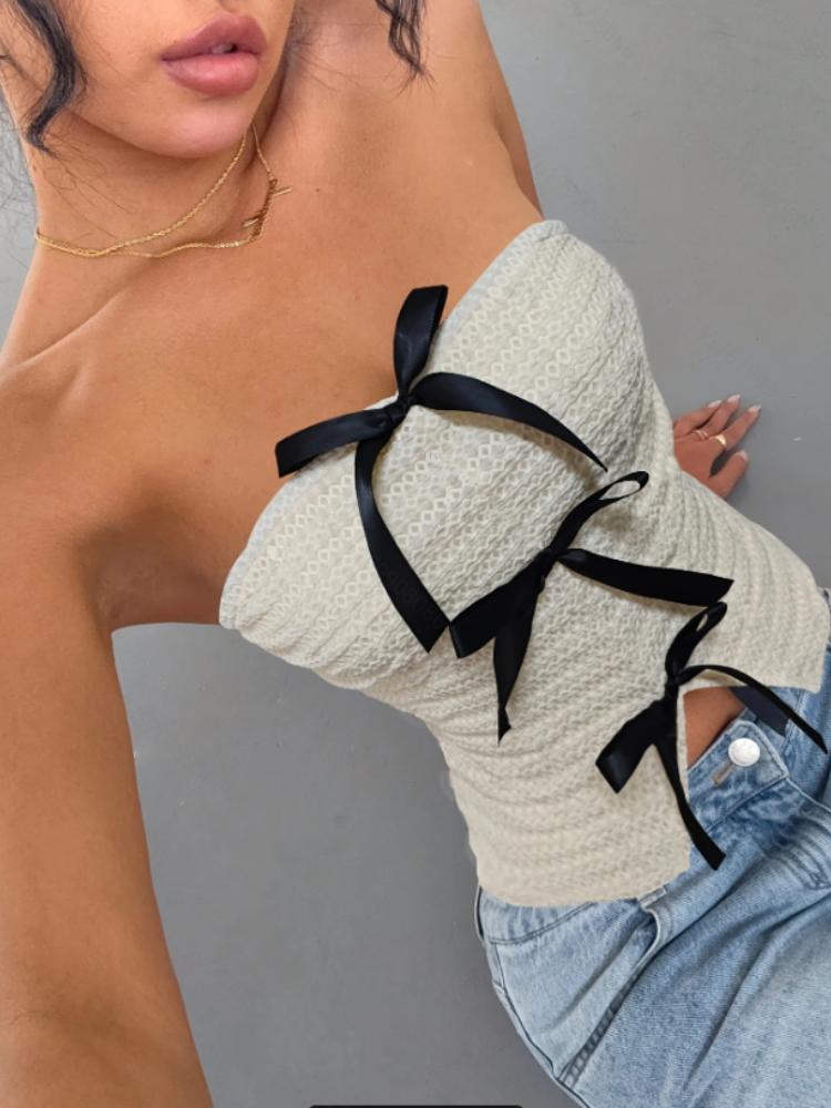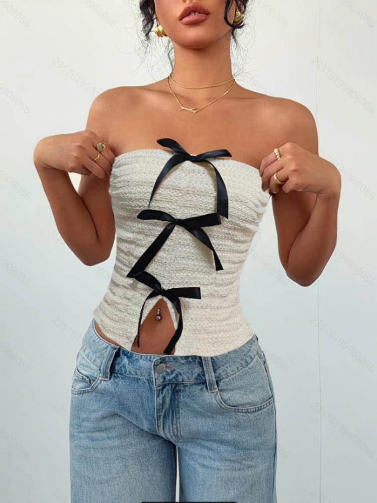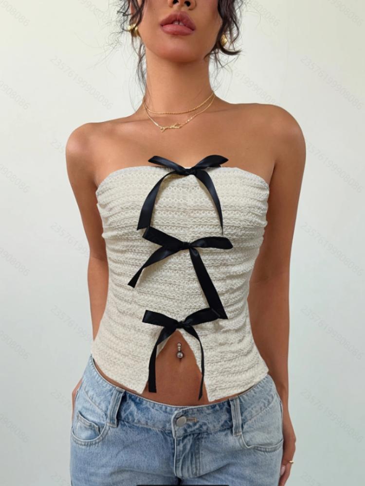 Este top strapless para mujer es una mezcla perfecta de encanto y moda para el verano. Elaborado con delicado crochet, tiene una textura y un tacto transpirable. El frente presenta llamativas cintas negras atadas en dulces lazos, añadiendo un toque juguetón y femenino.. El diseño estilo corsé ciñe la cintura maravillosamente, acentuando tus curvas. El largo corto combina bien con jeans, shorts o faldas de cintura alta, lo que lo hace versátil para varios looks de verano. Ya sea que te dirijas a una fiesta, una cita o una salida casual, este top te permitirá destacar con su diseño único y su vibra elegante.