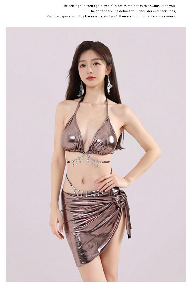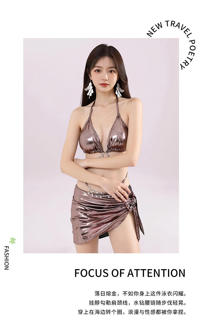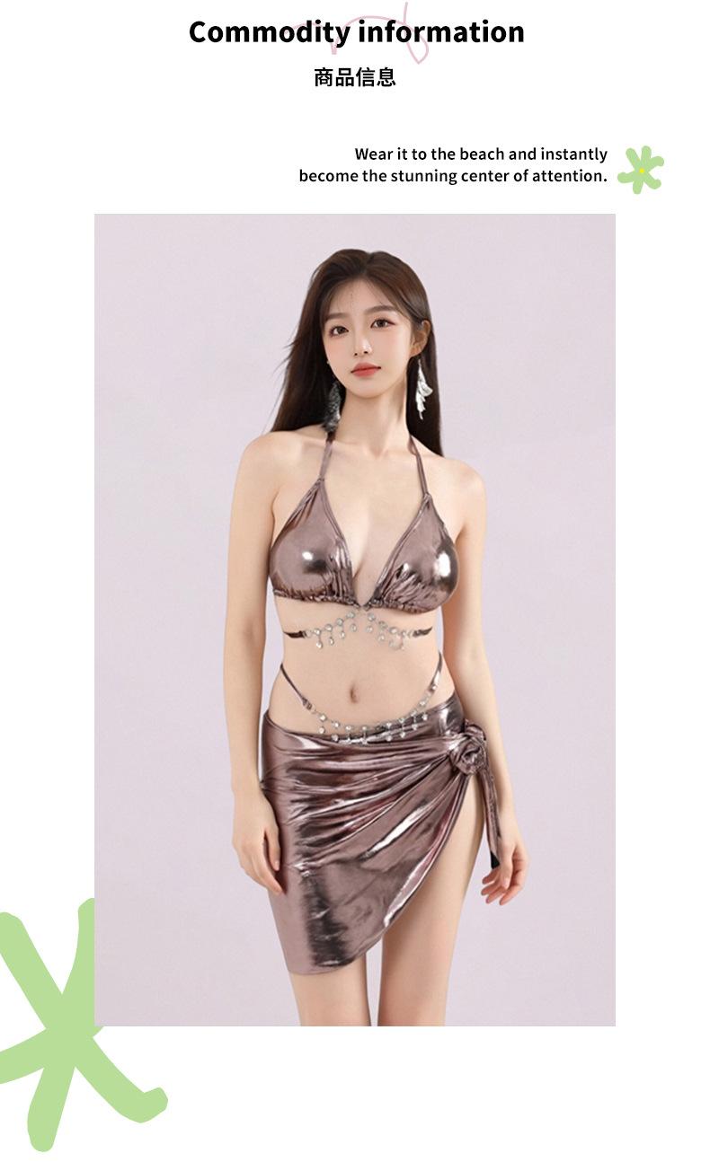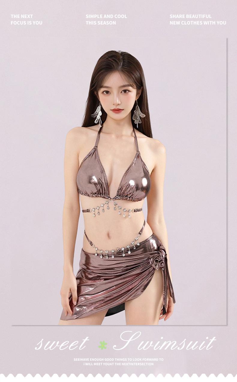 202 Nuevo Conjunto de Bikini Brillante Sexy Halter Dividido Traje de Baño Decoración de Cadena Ropa de Playa para Vacaciones