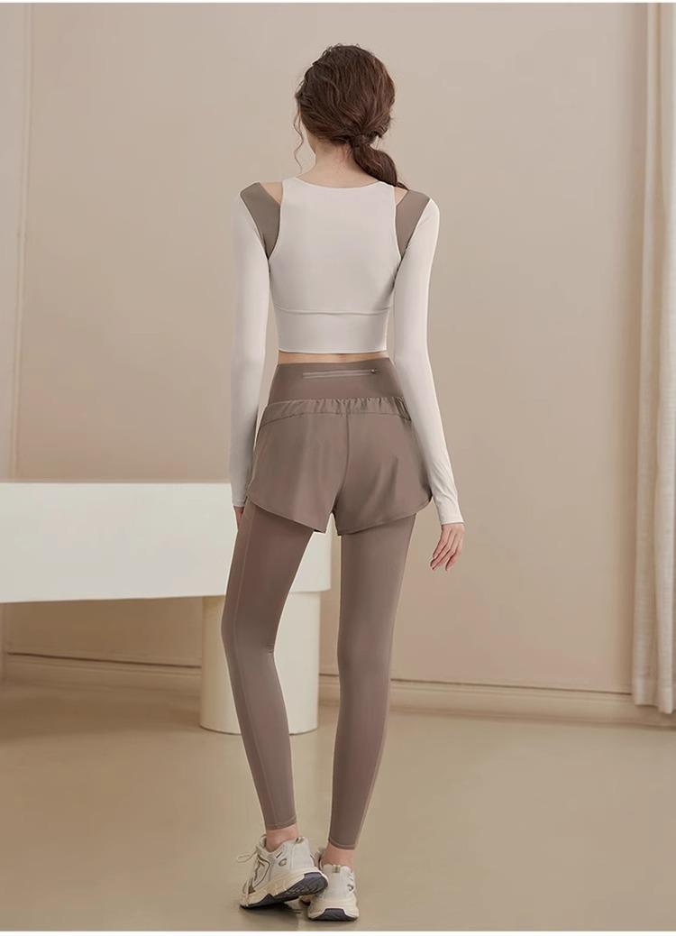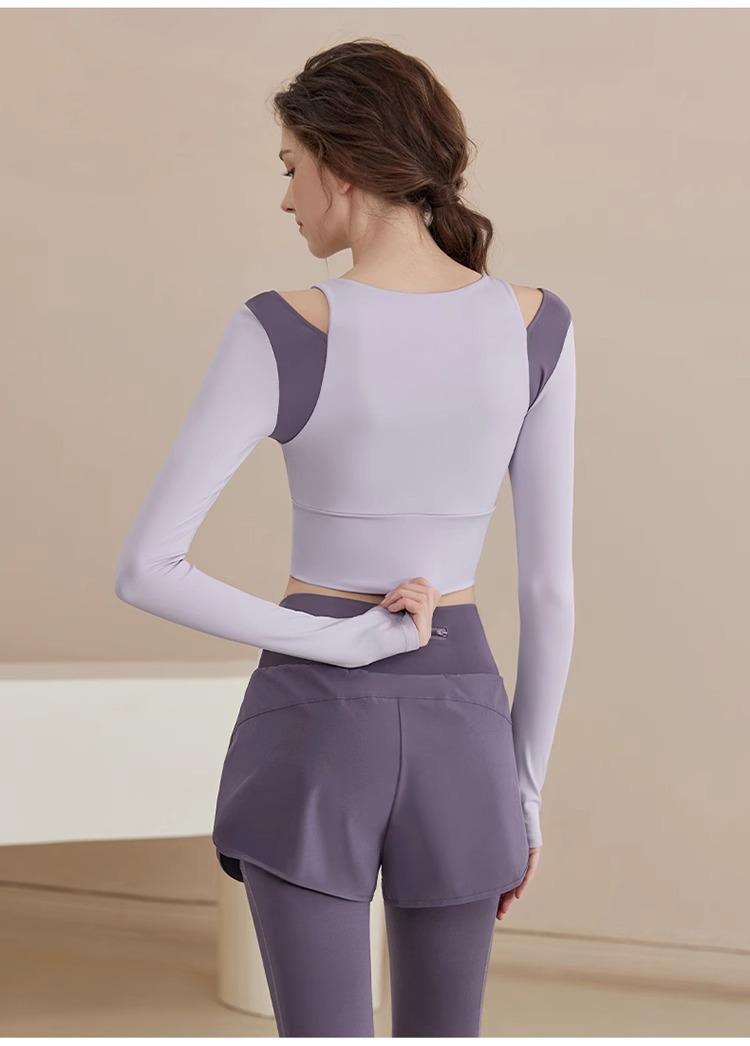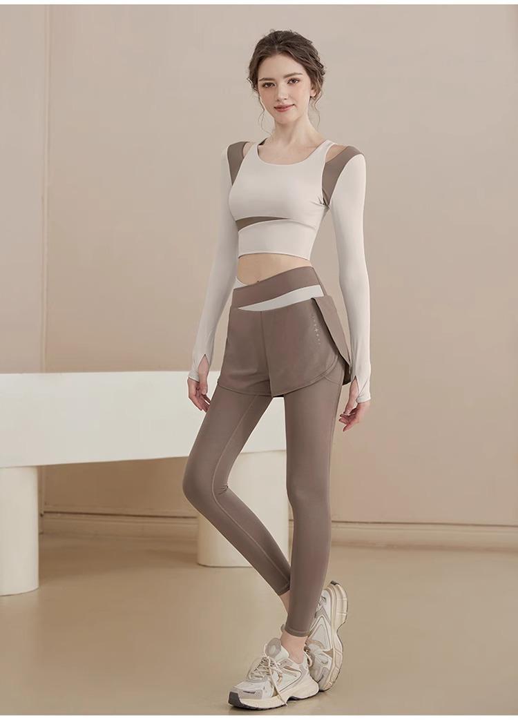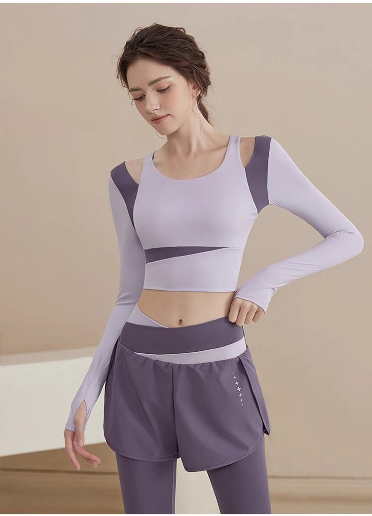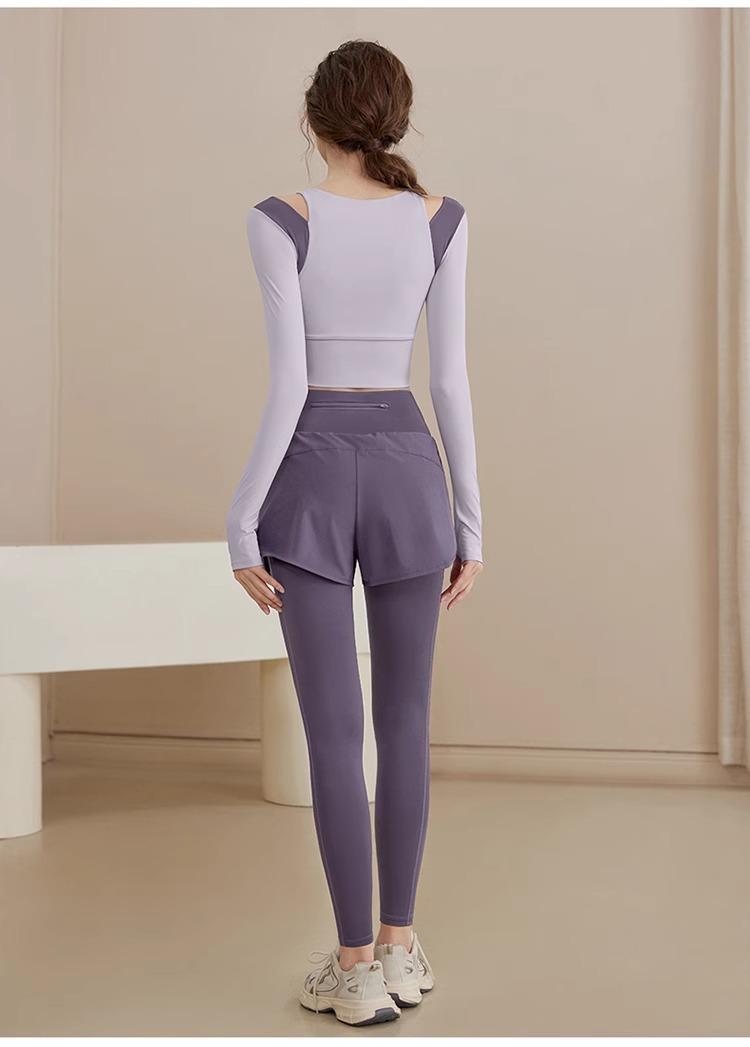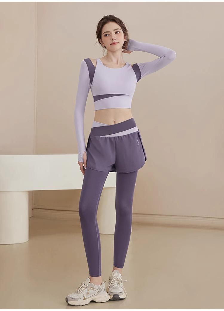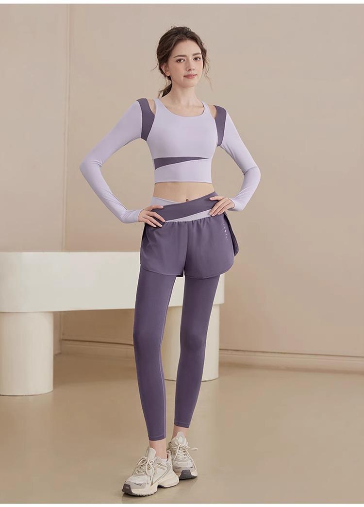 Brown top, Purple top, Brown top + coffee color fake two-piece yoga pants, Purple top + purple two-piece yoga ...