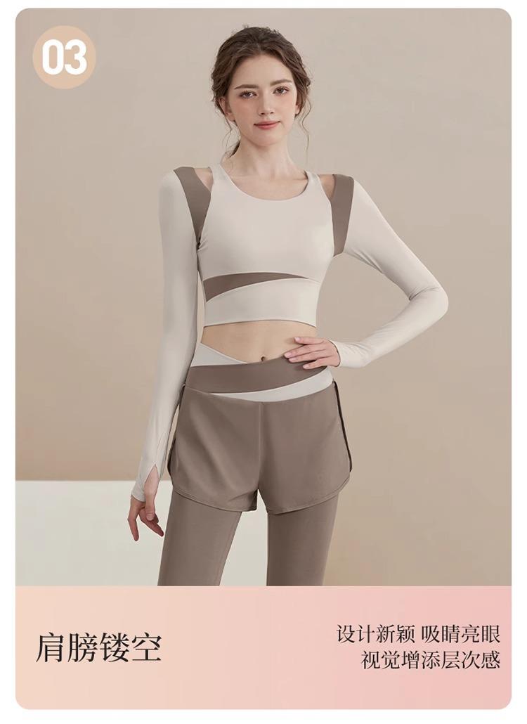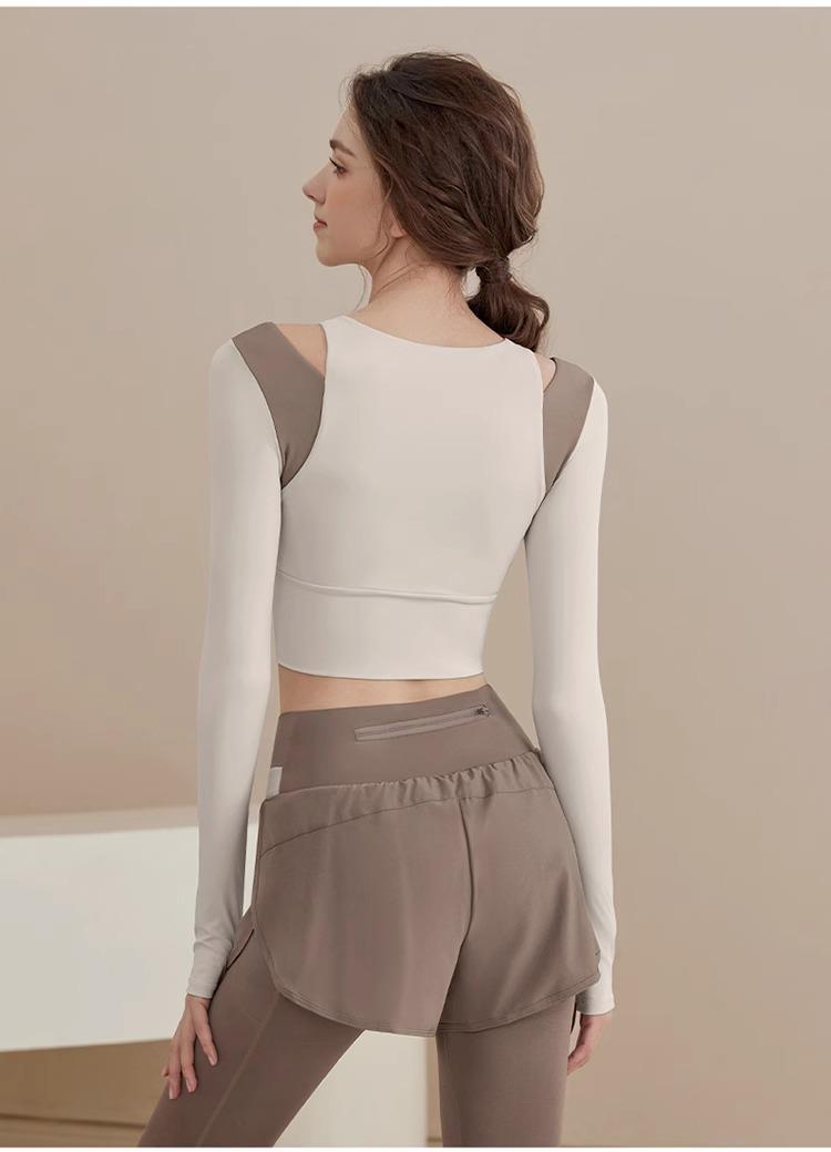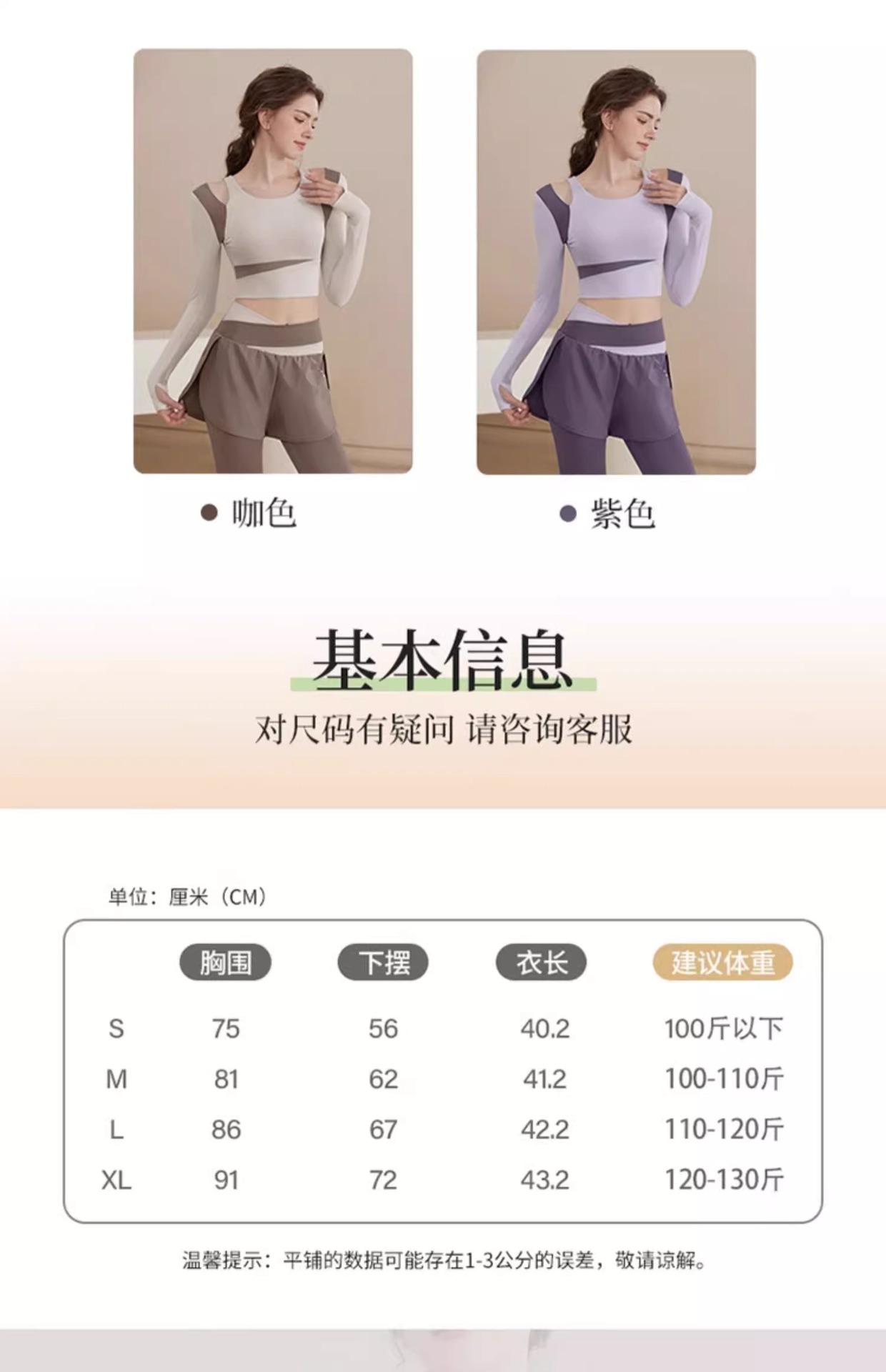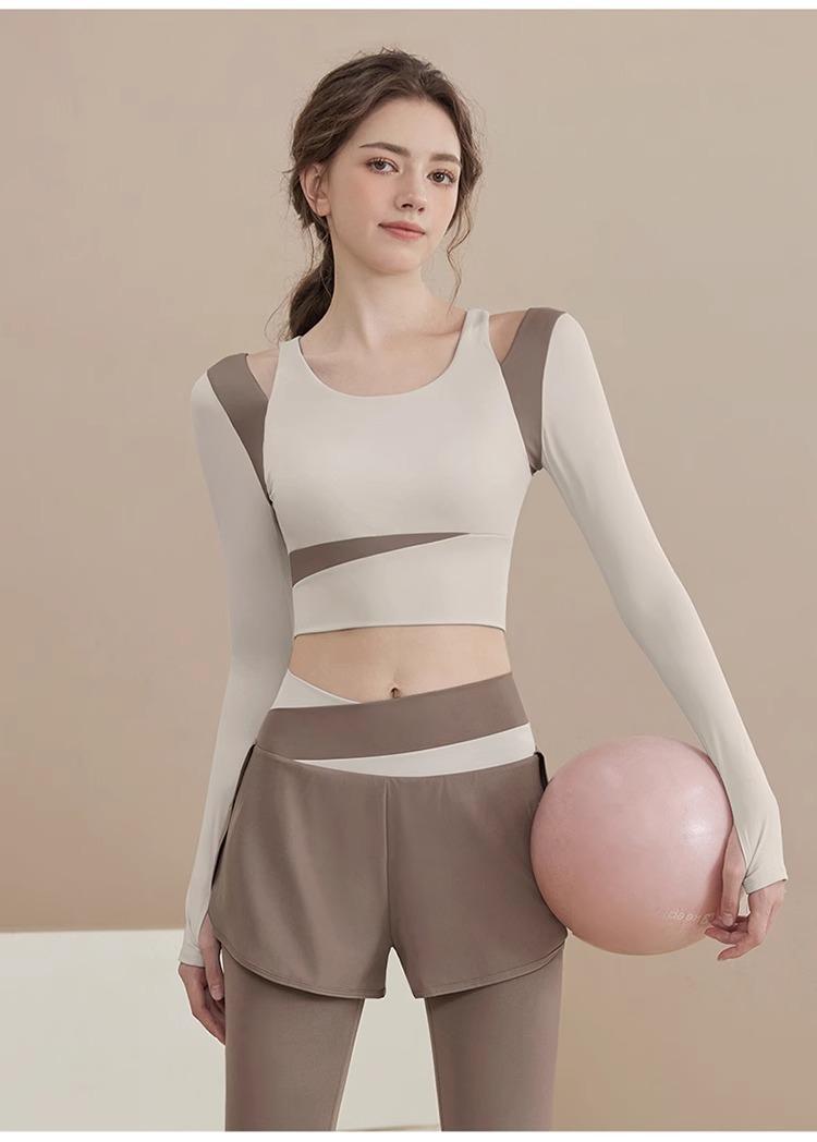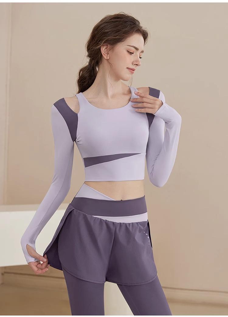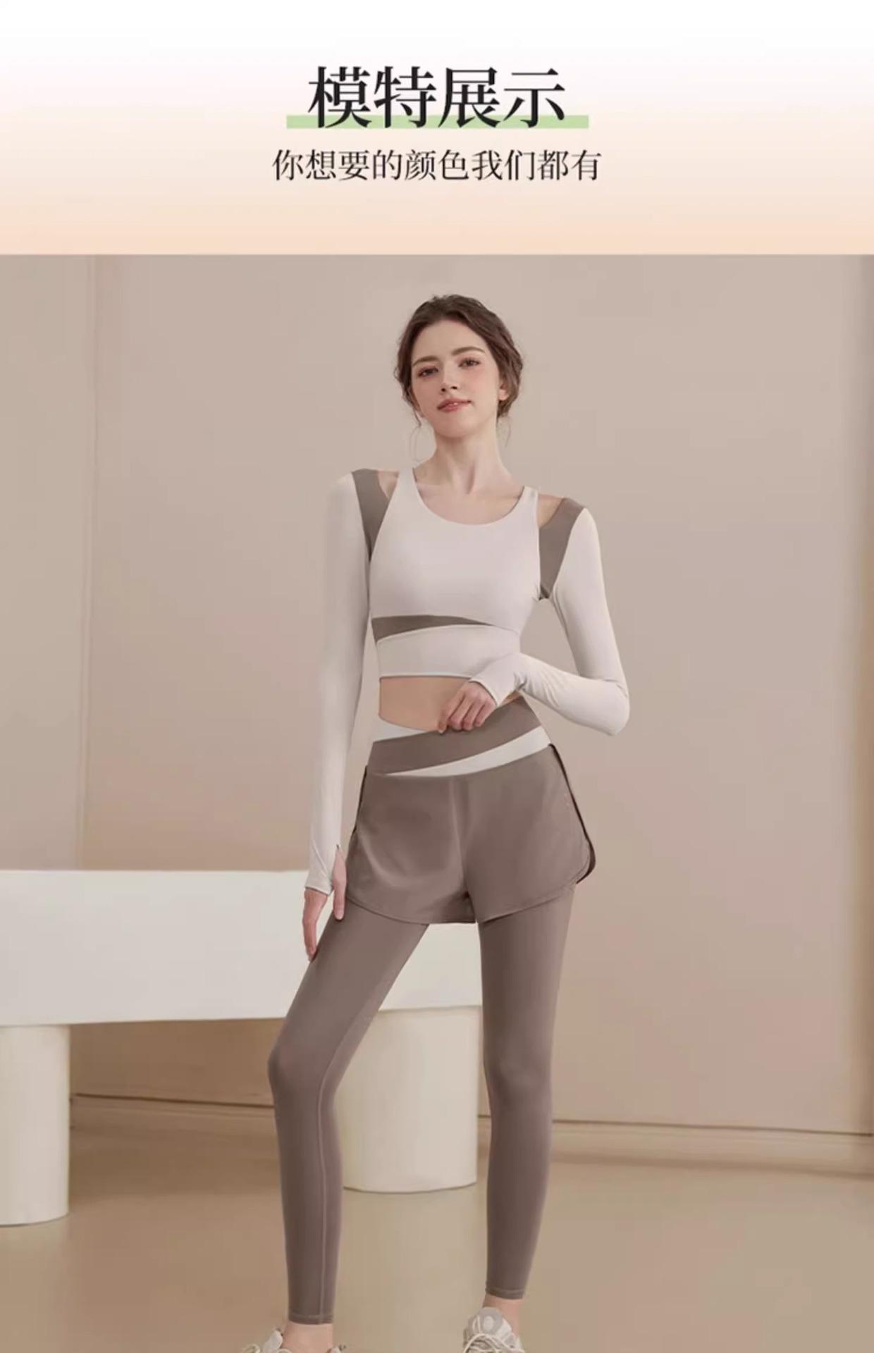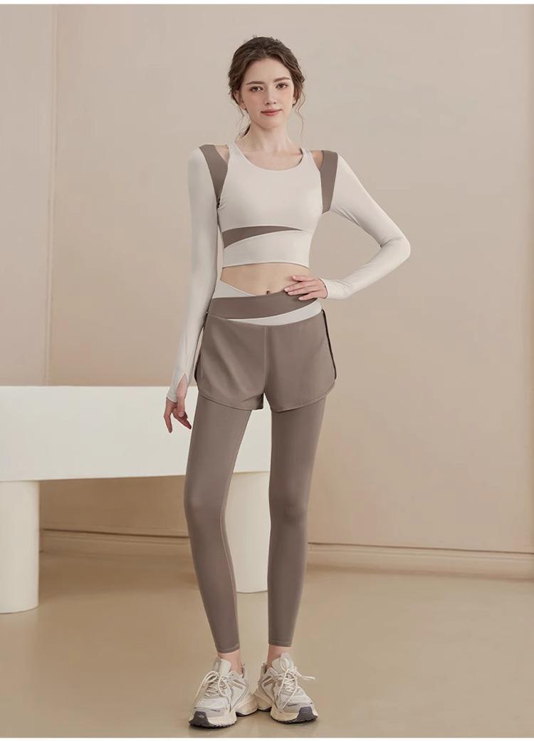 Brown top, Purple top, Brown top + coffee color fake two-piece yoga pants, Purple top + purple two-piece yoga ...