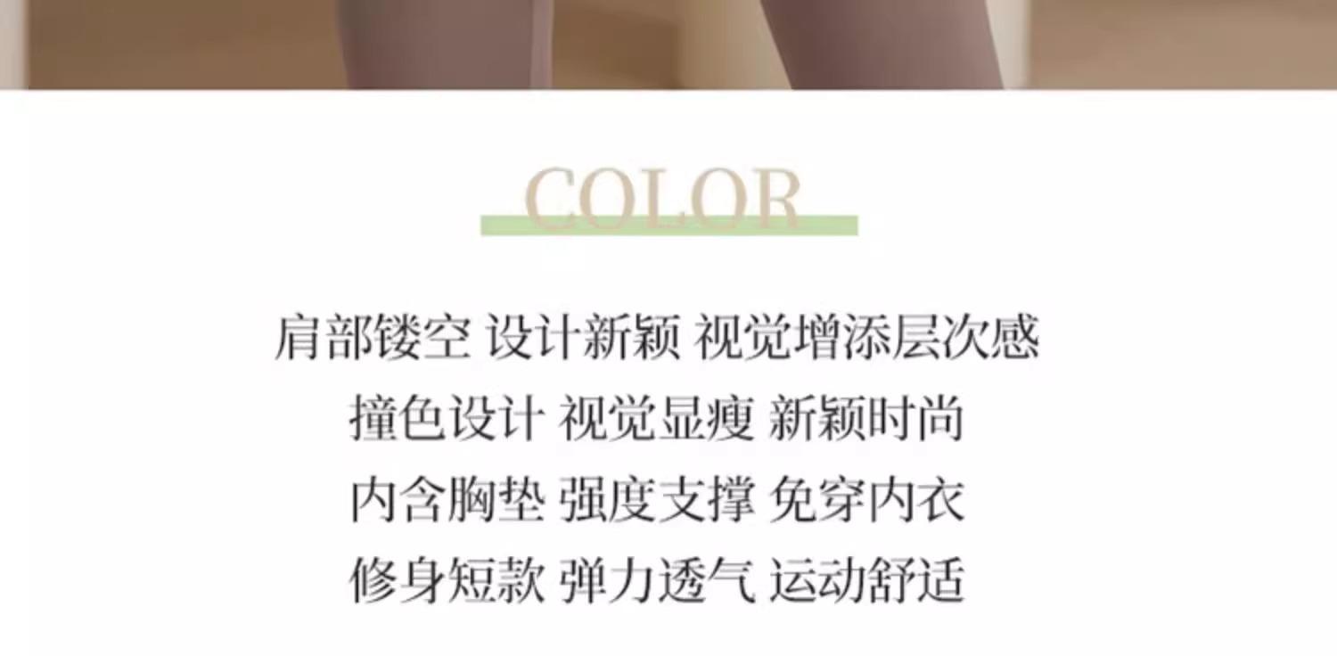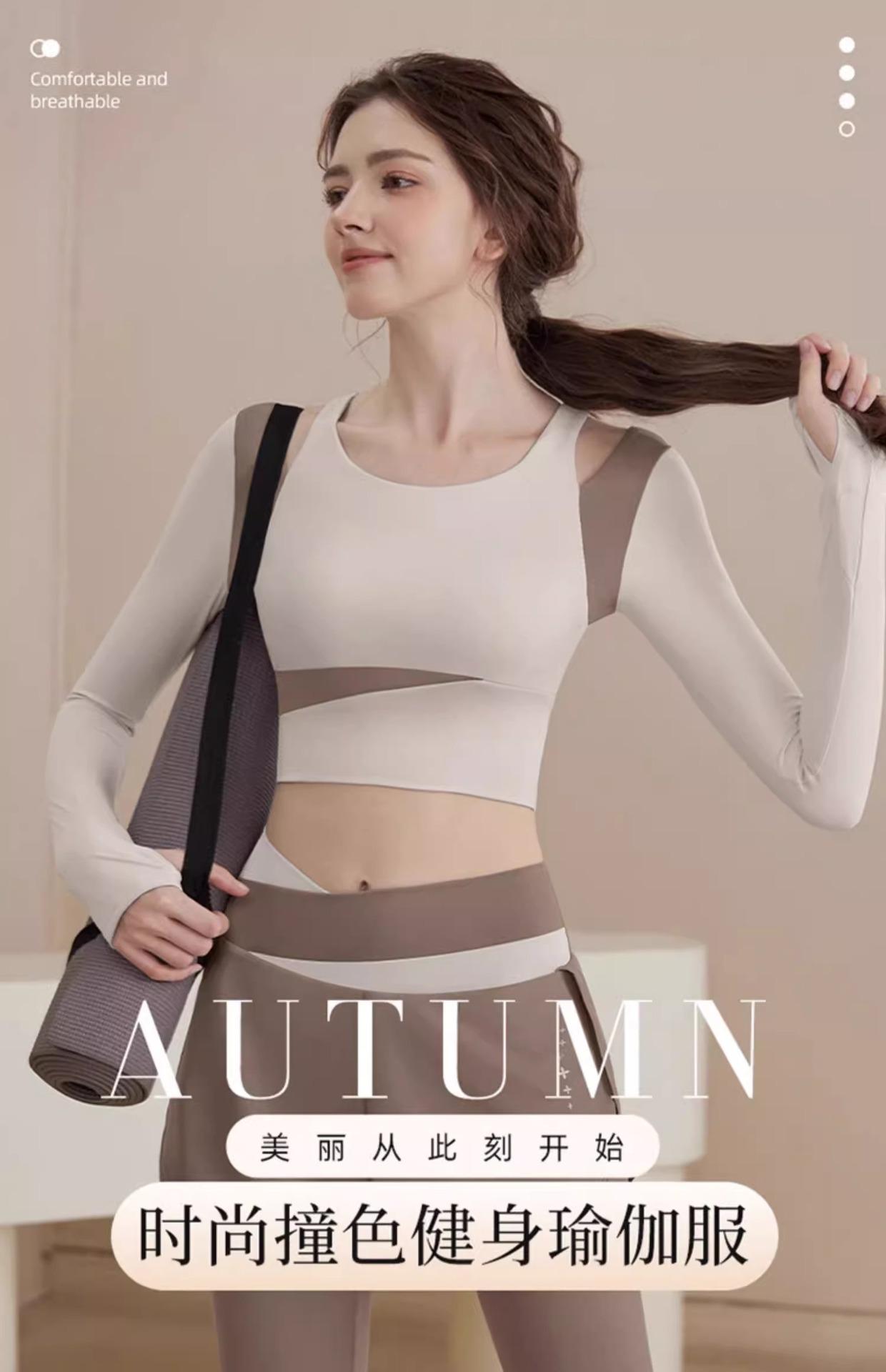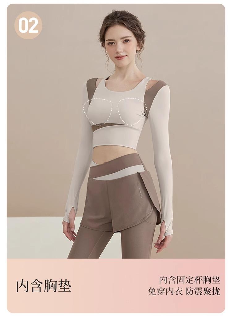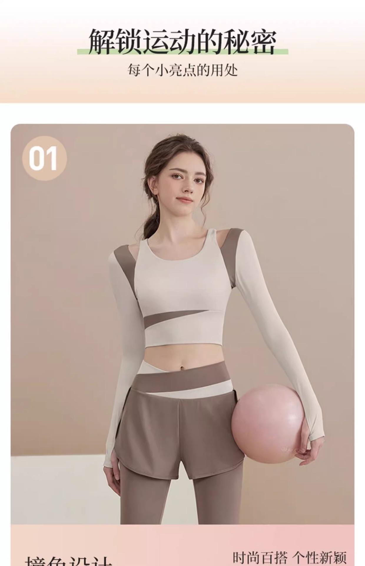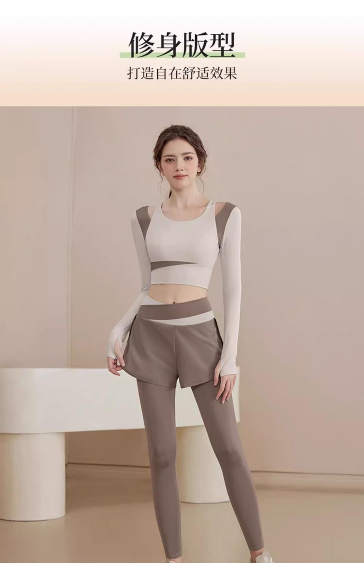 Brown top, Purple top, Brown top + coffee color fake two-piece yoga pants, Purple top + purple two-piece yoga ...
