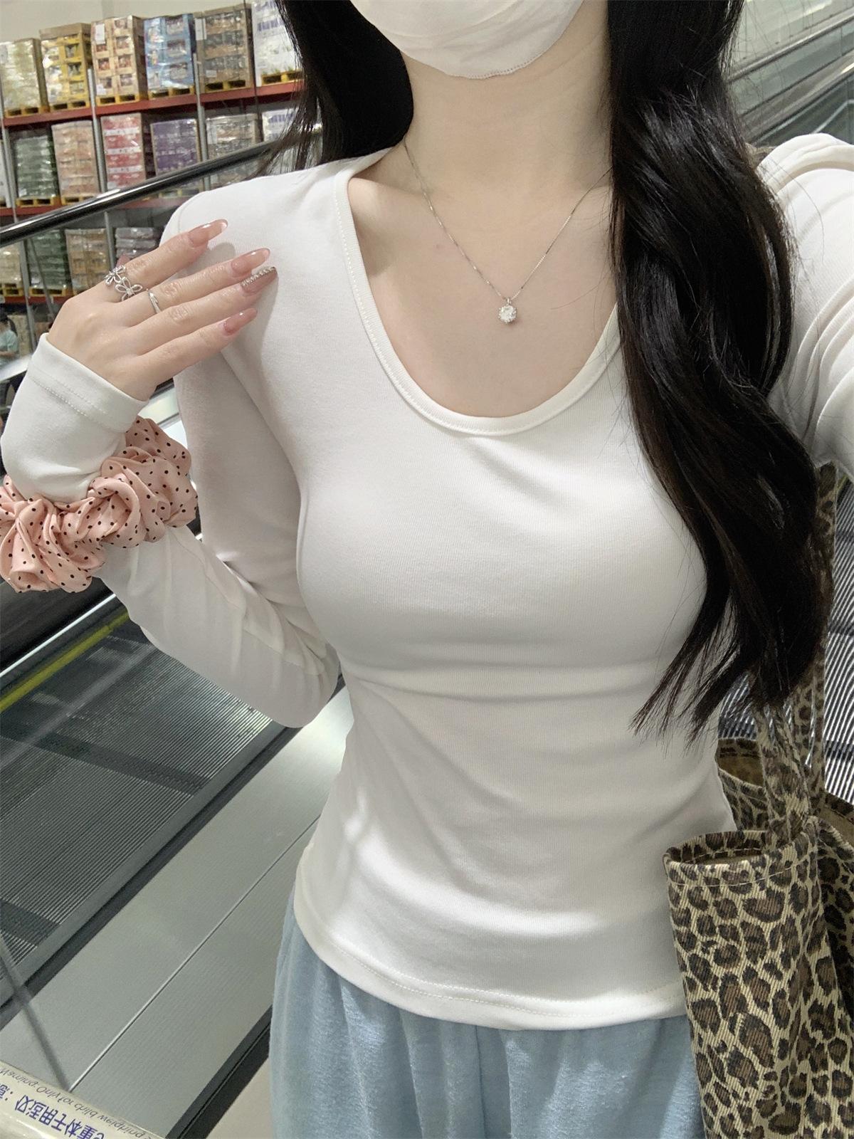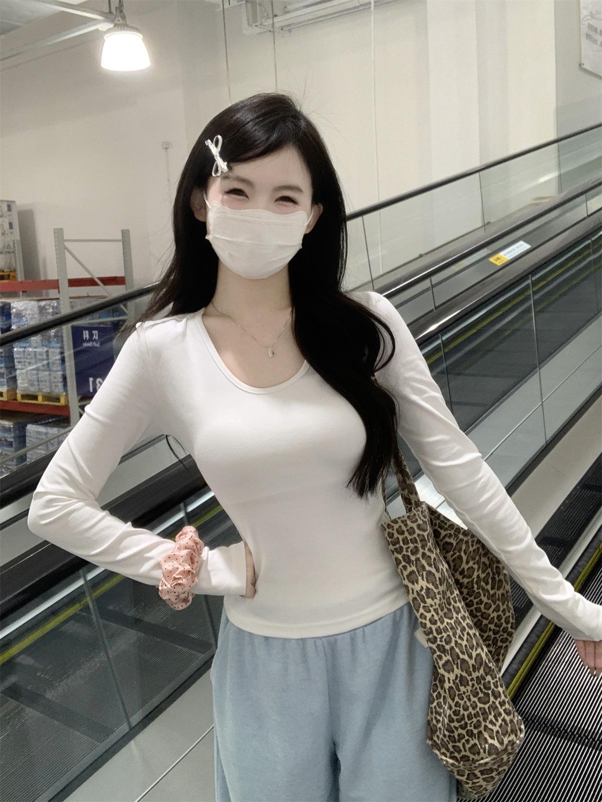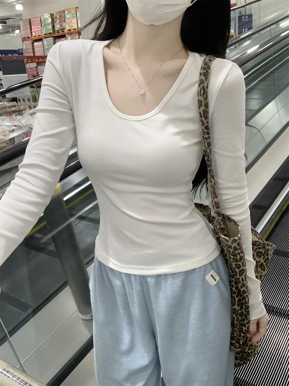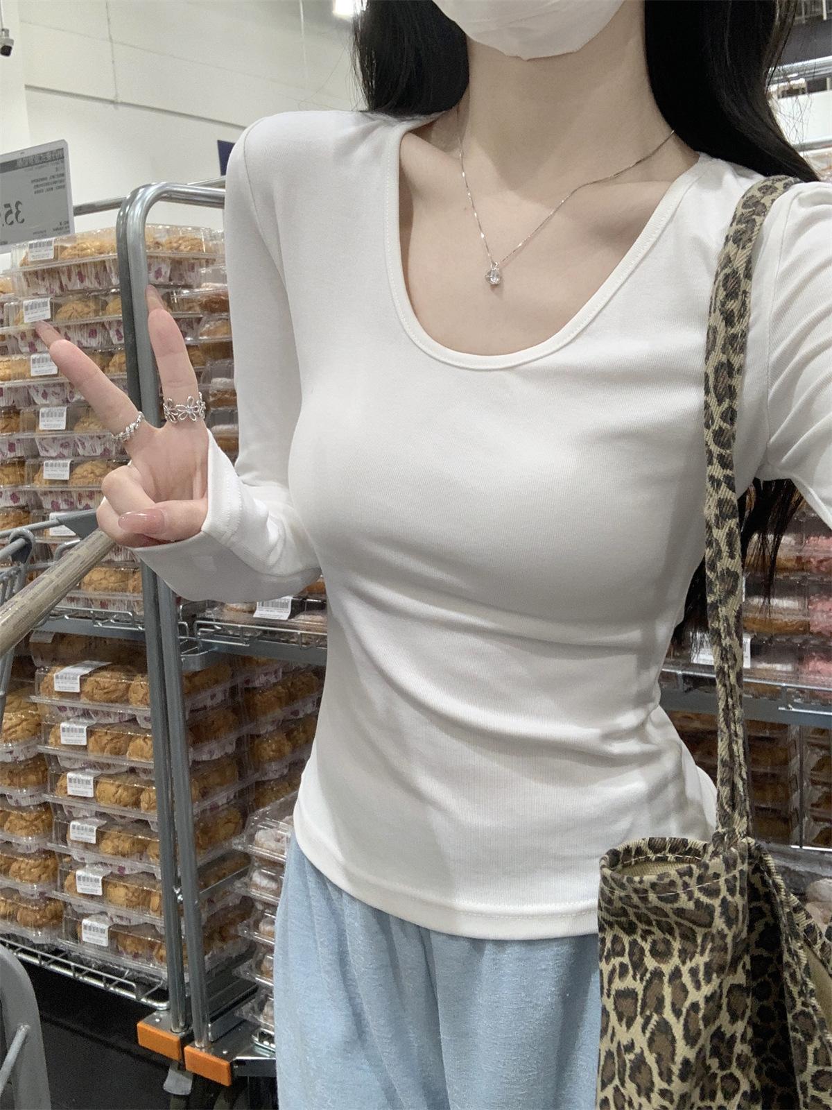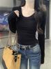 Cosas buenas otoño 2025 estilo coreano corte ajustado chica hot hombro recto color sólido cuello U interior camiseta de manga larga camisa base ropa de mujer top