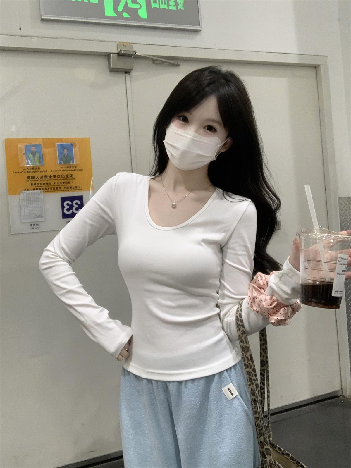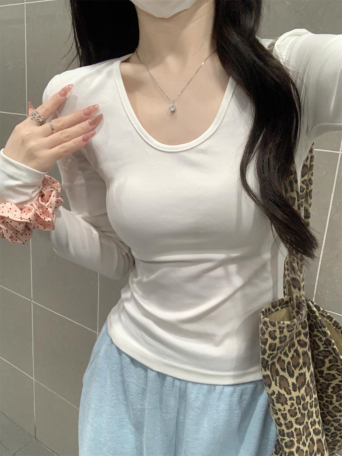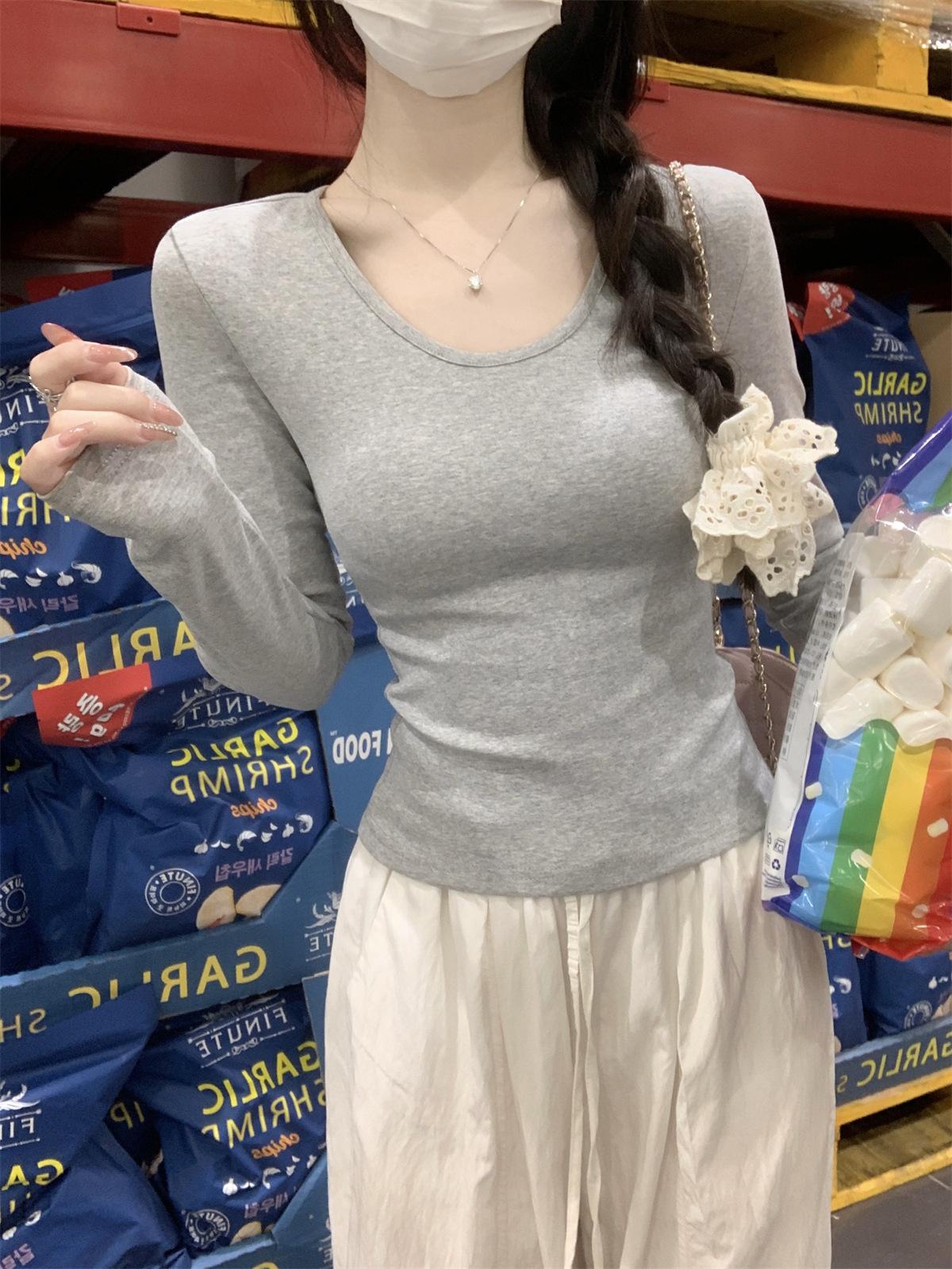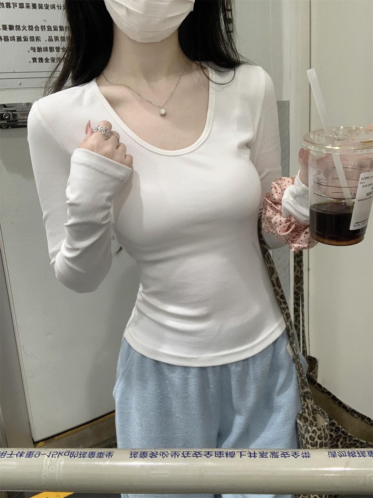 Cosas buenas otoño 2025 estilo coreano corte ajustado chica hot hombro recto color sólido cuello U interior camiseta de manga larga camisa base ropa de mujer top