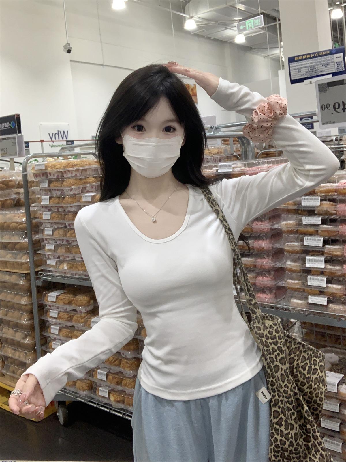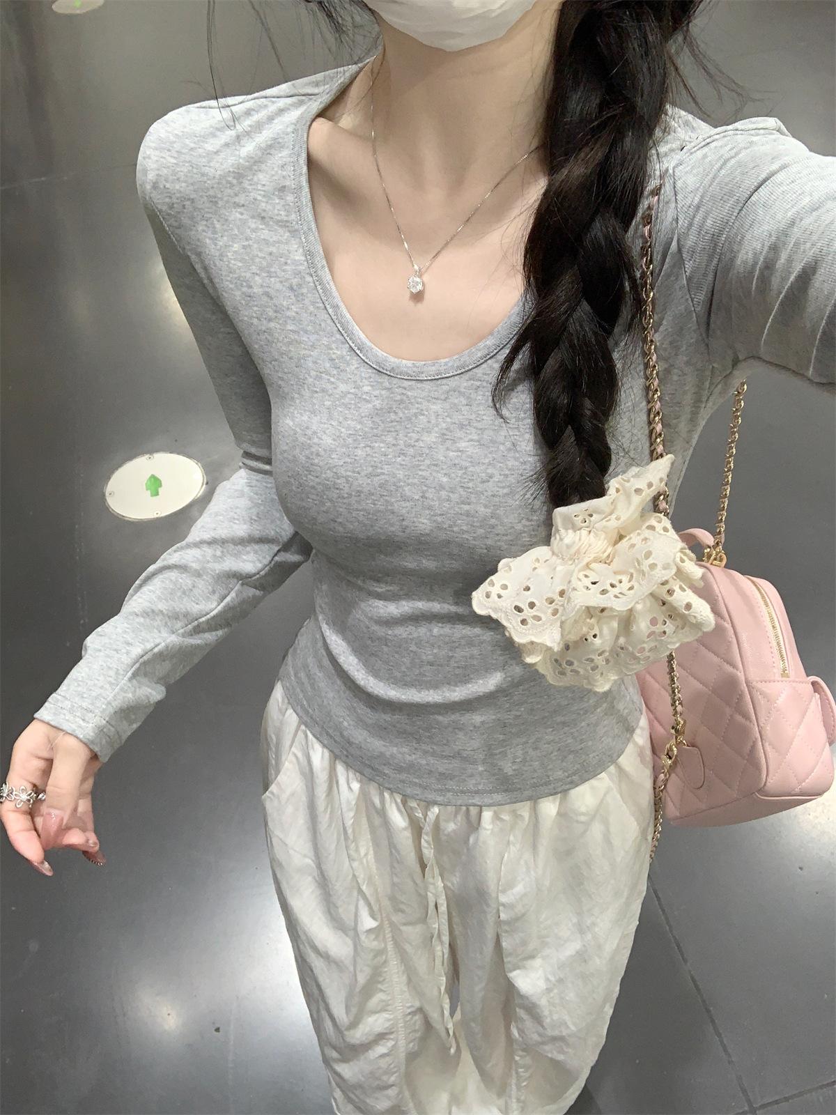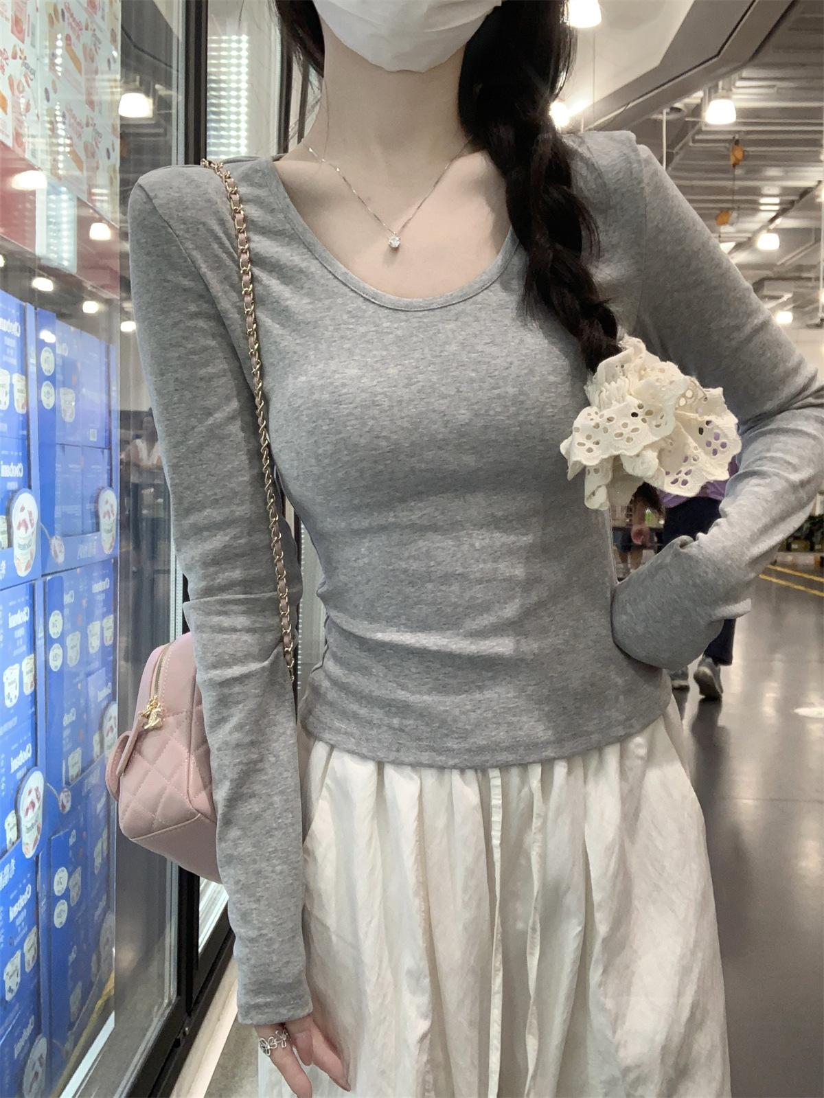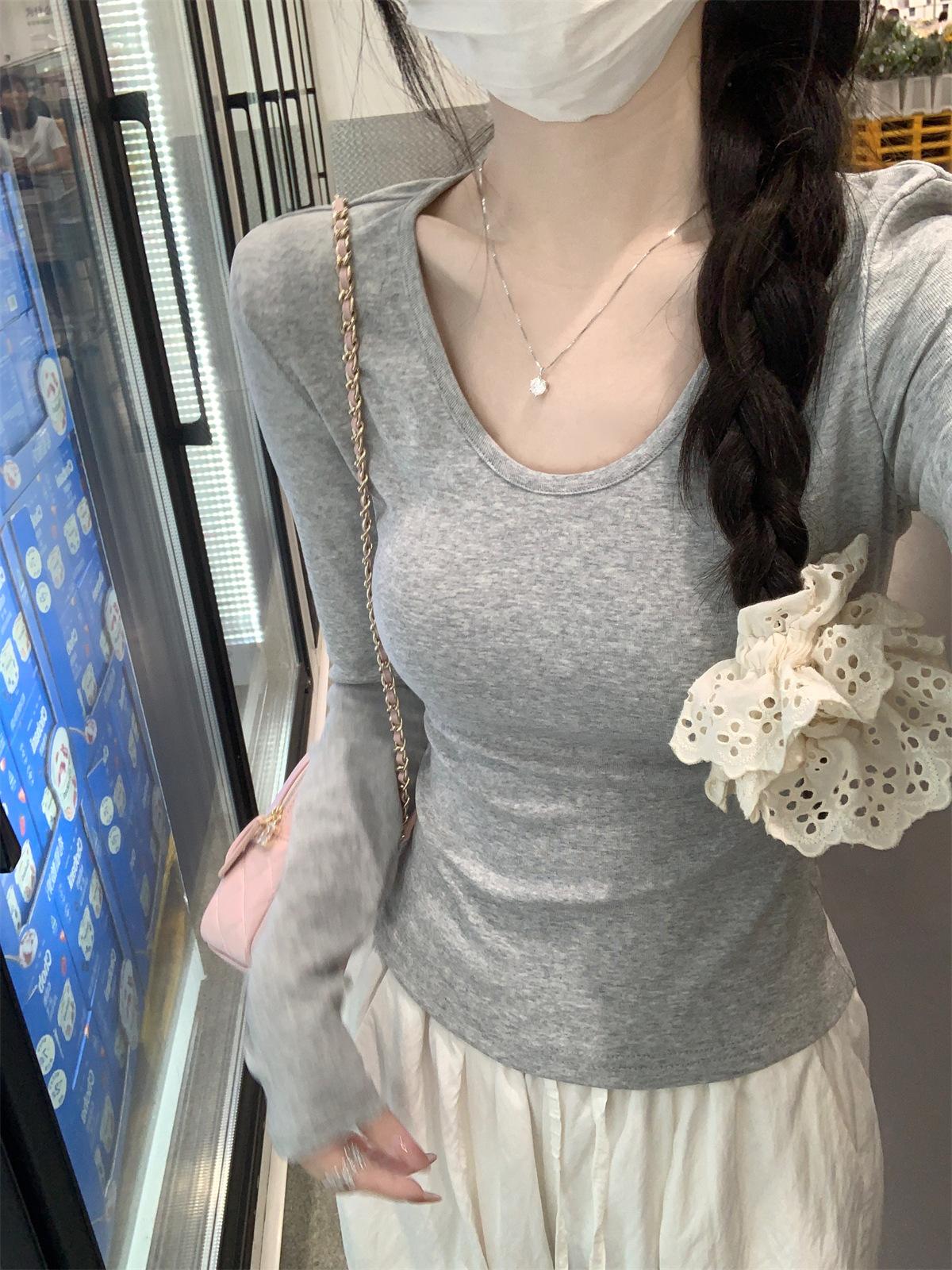 Cosas buenas otoño 2025 estilo coreano corte ajustado chica hot hombro recto color sólido cuello U interior camiseta de manga larga camisa base ropa de mujer top