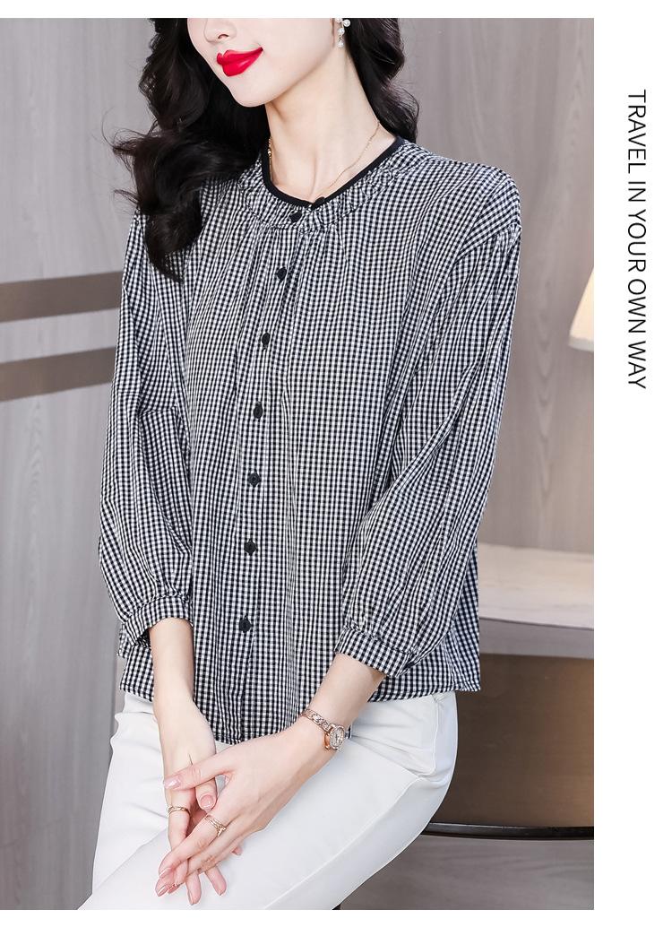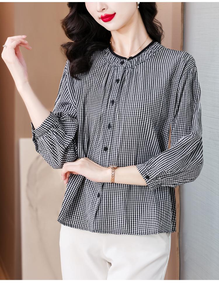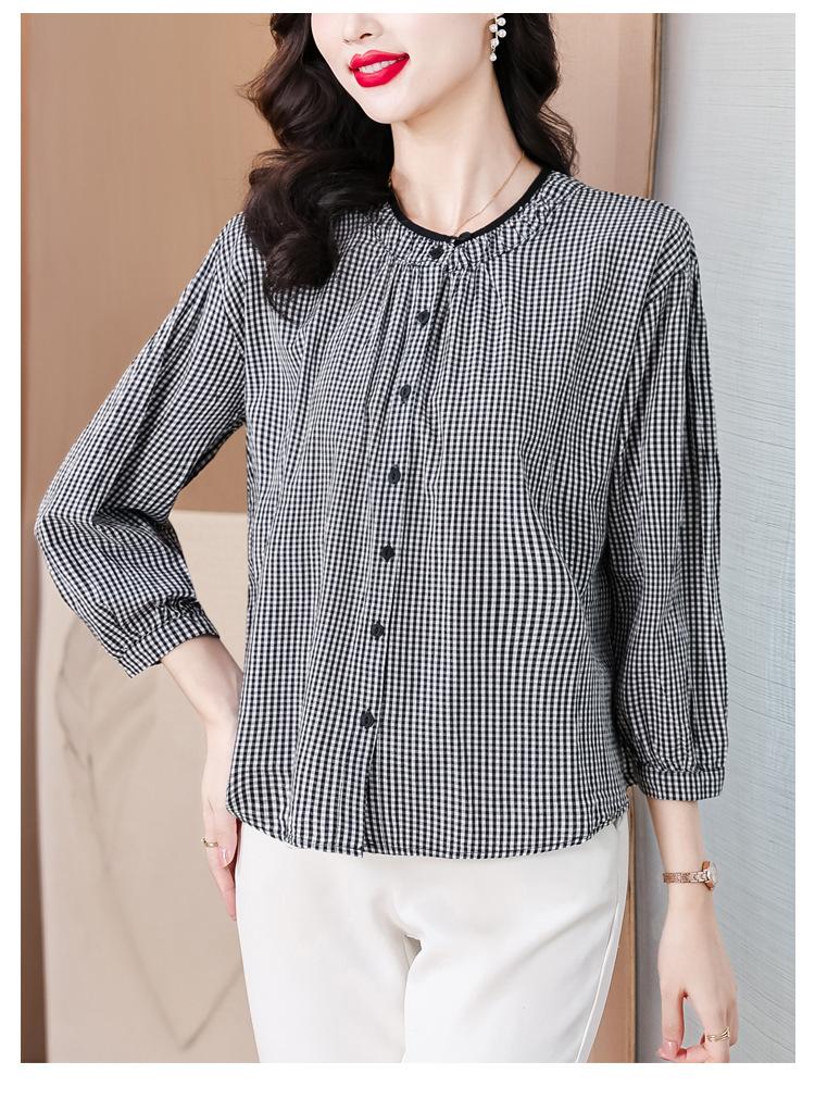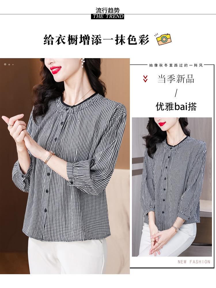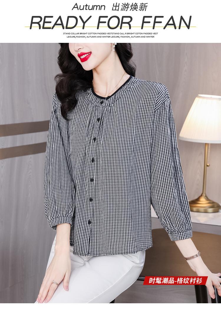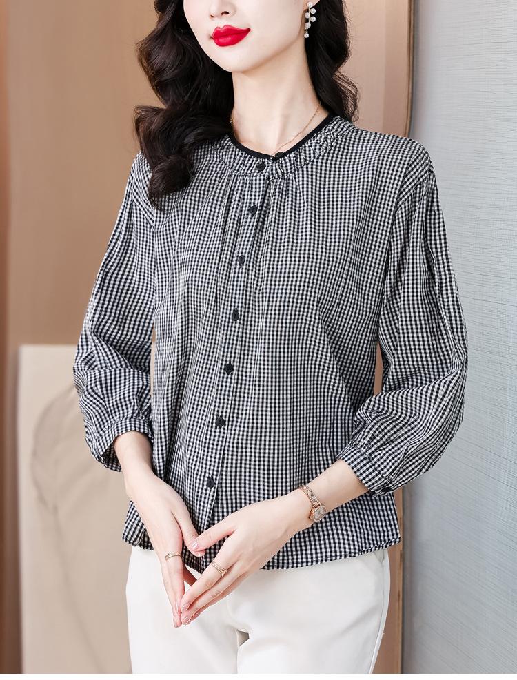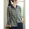 Foto real otoño nueva camisa de cuadros para mujer diseño suelto retro sentido cuello redondo manga larga top