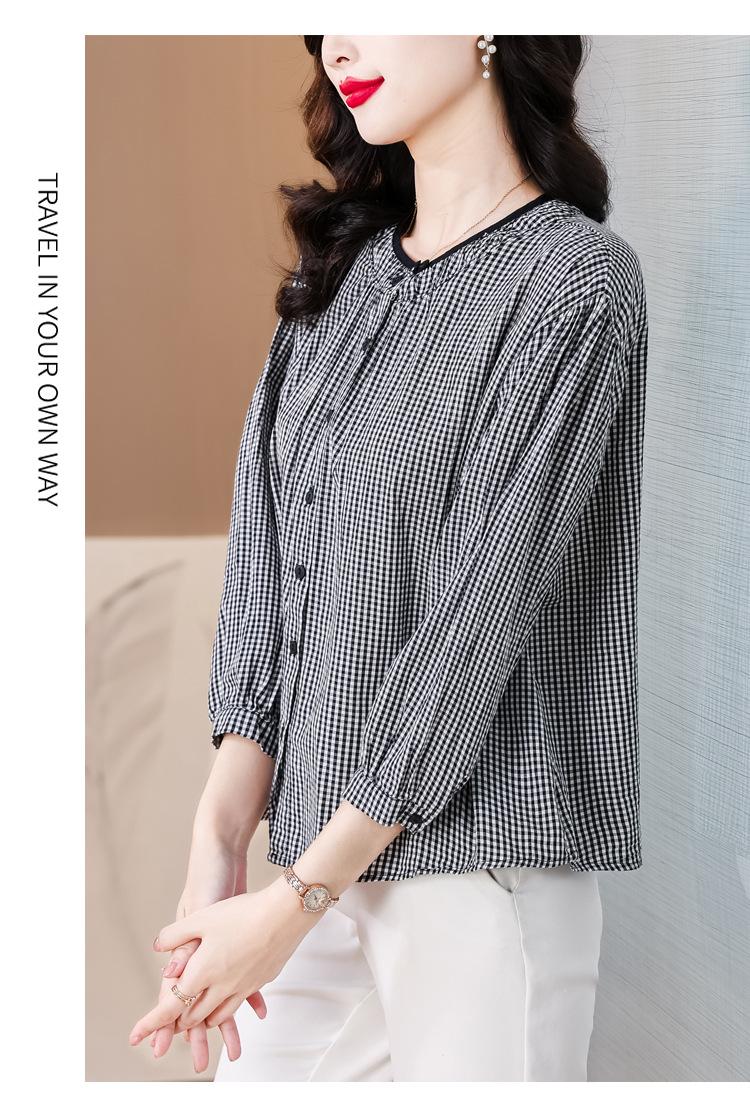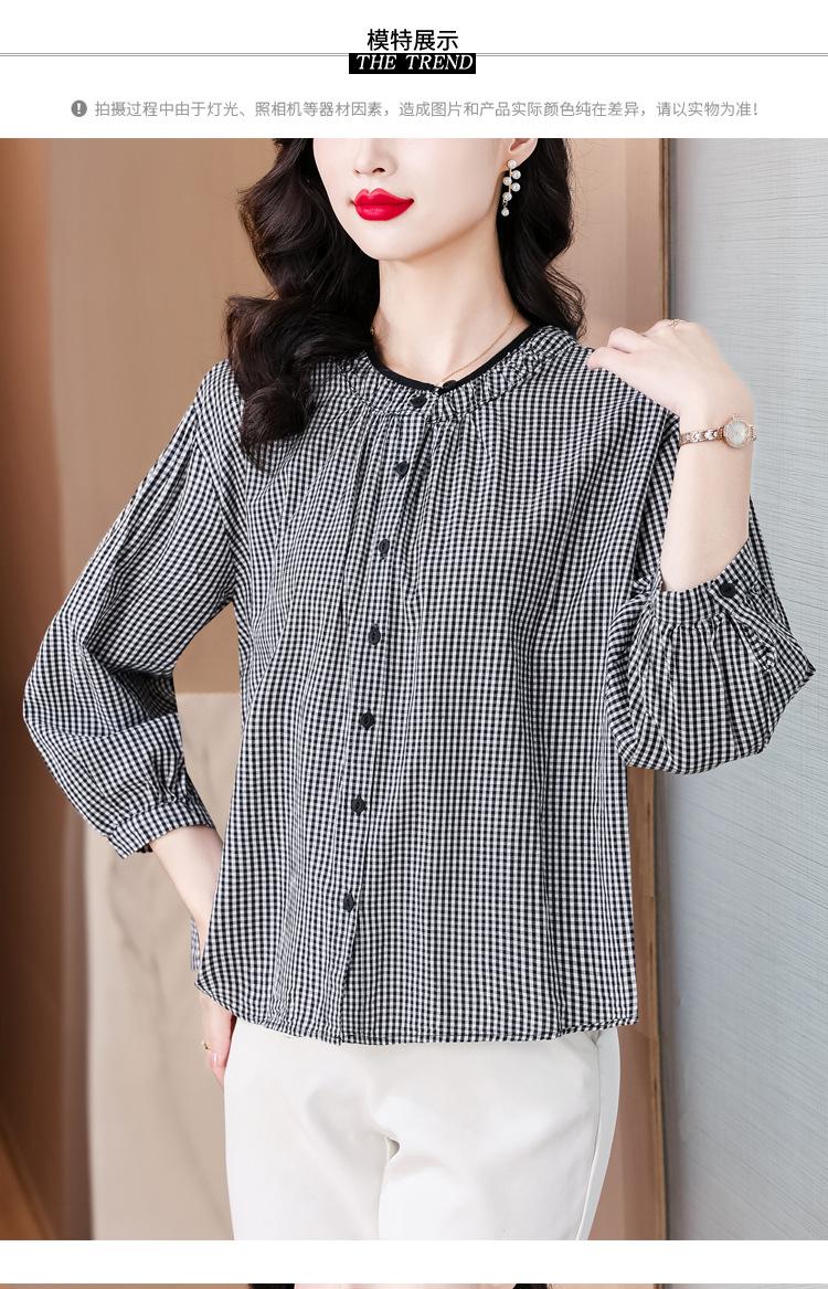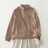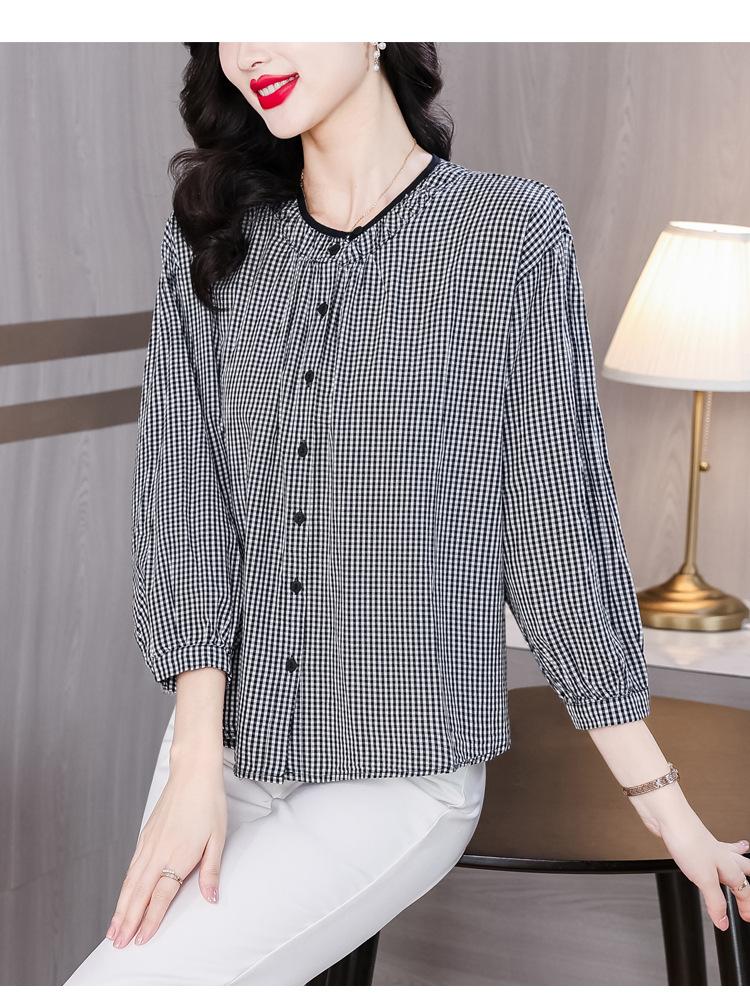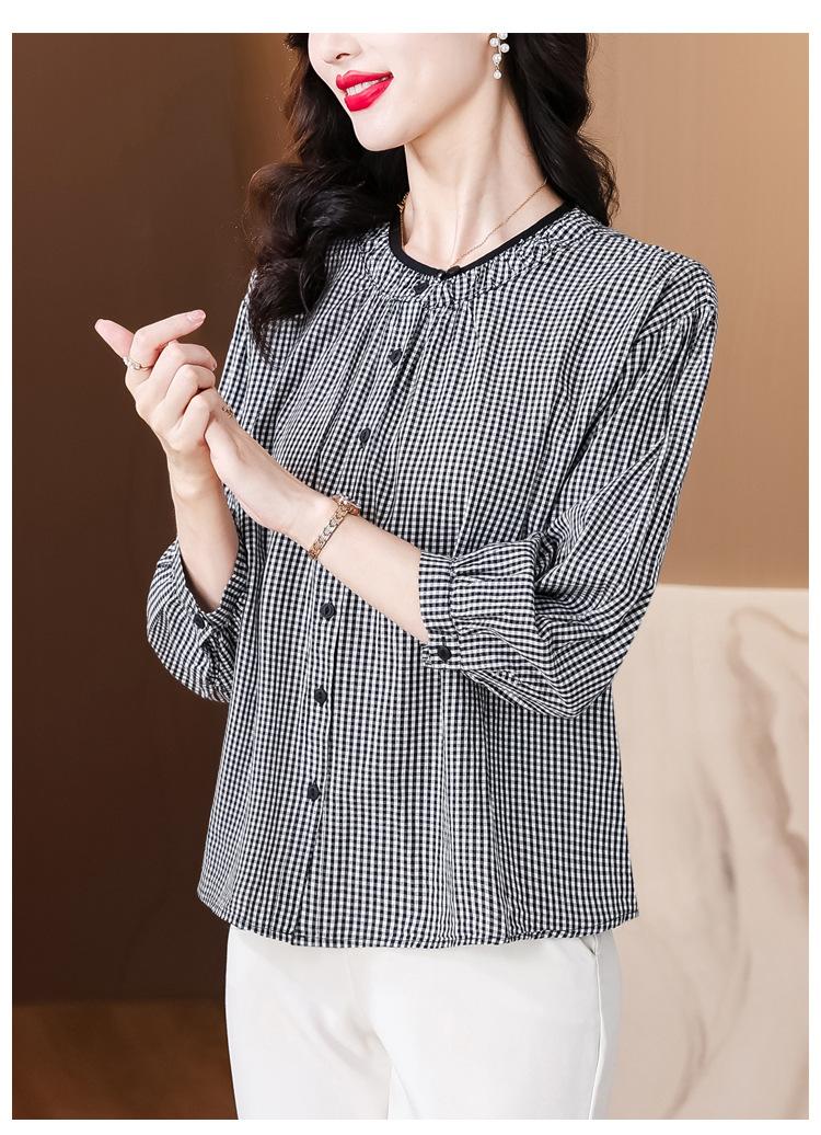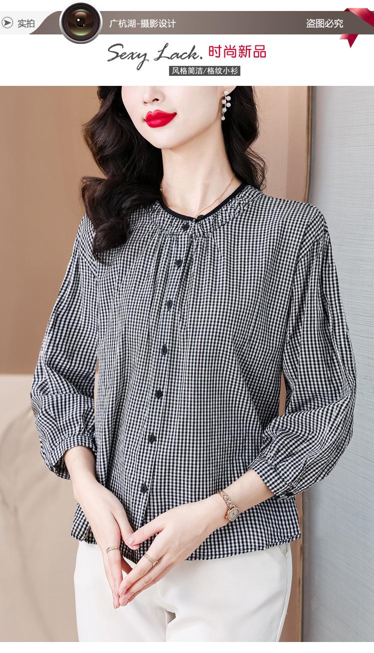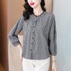 Foto real otoño nueva camisa de cuadros para mujer diseño suelto retro sentido cuello redondo manga larga top