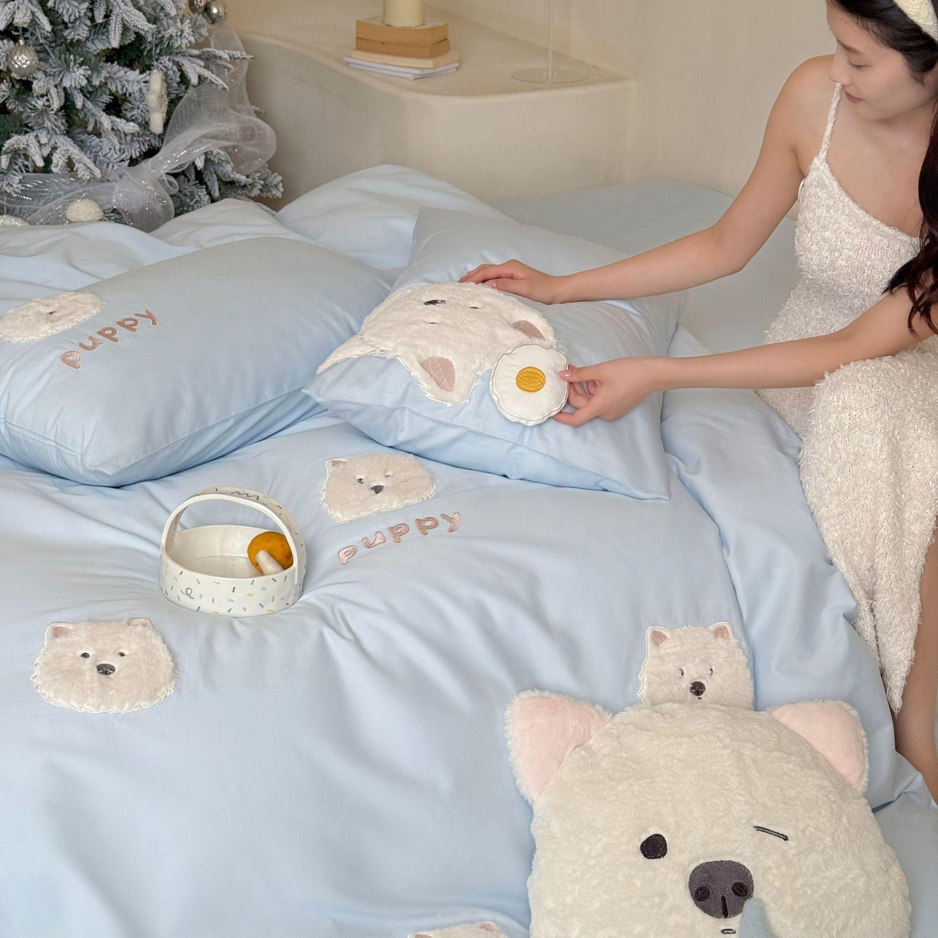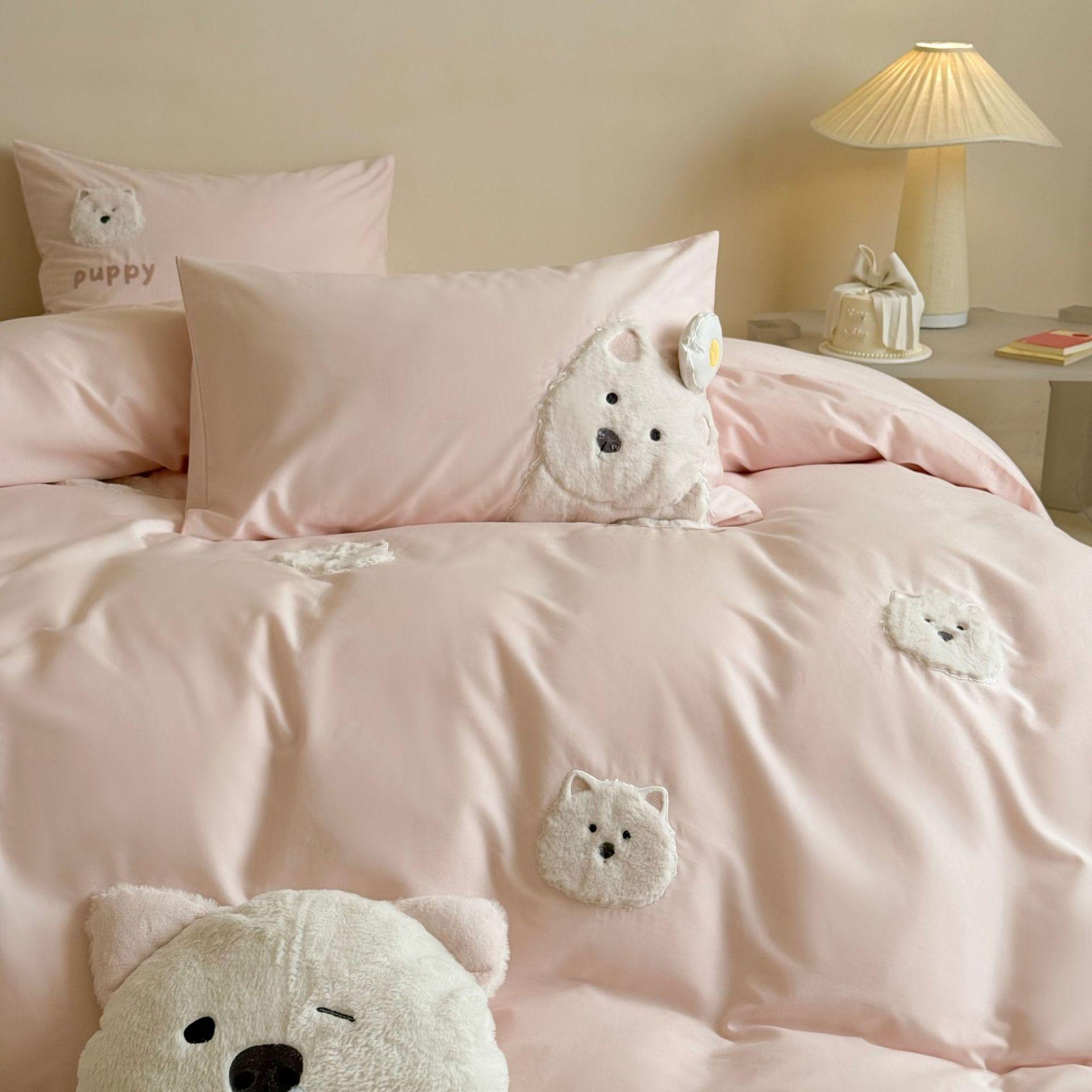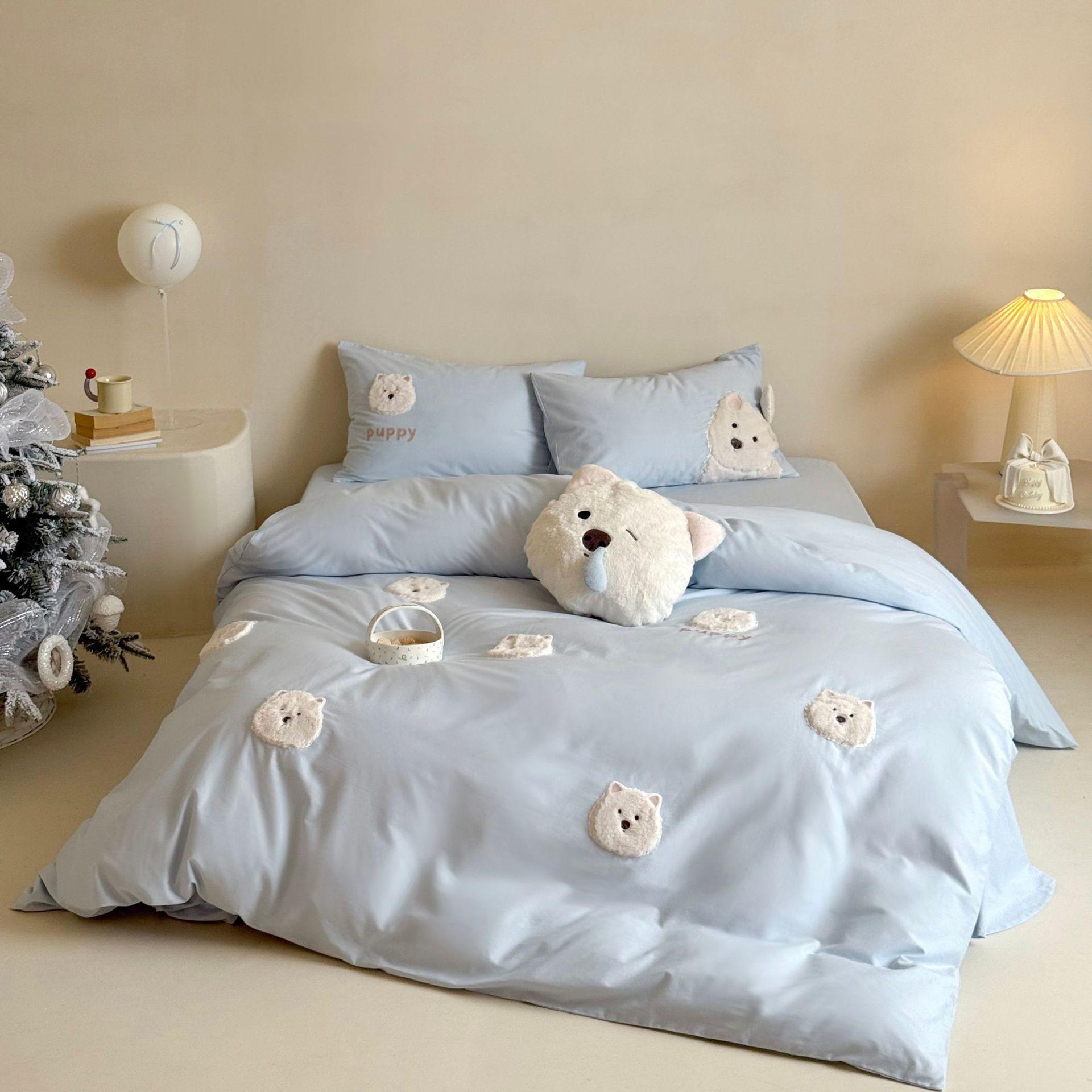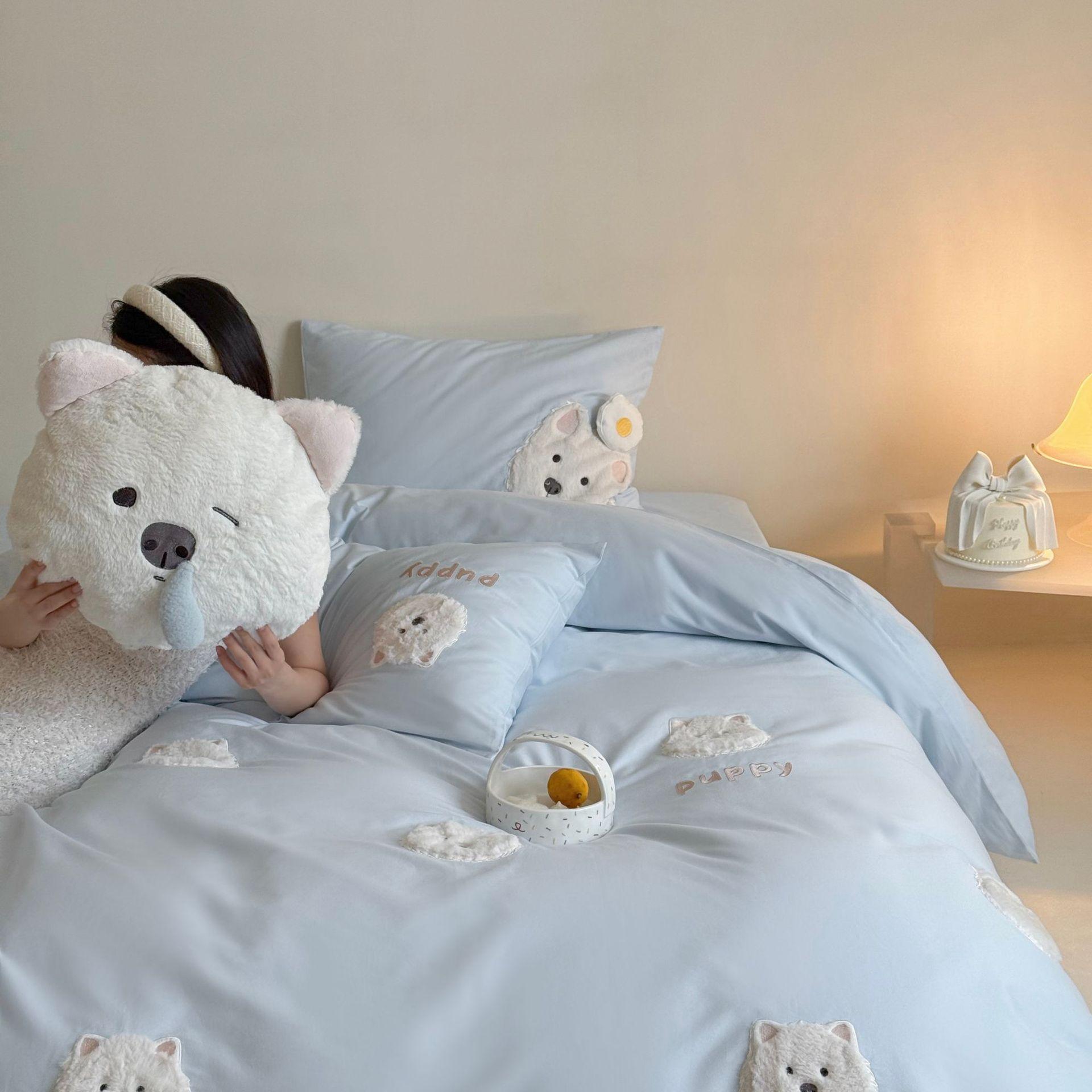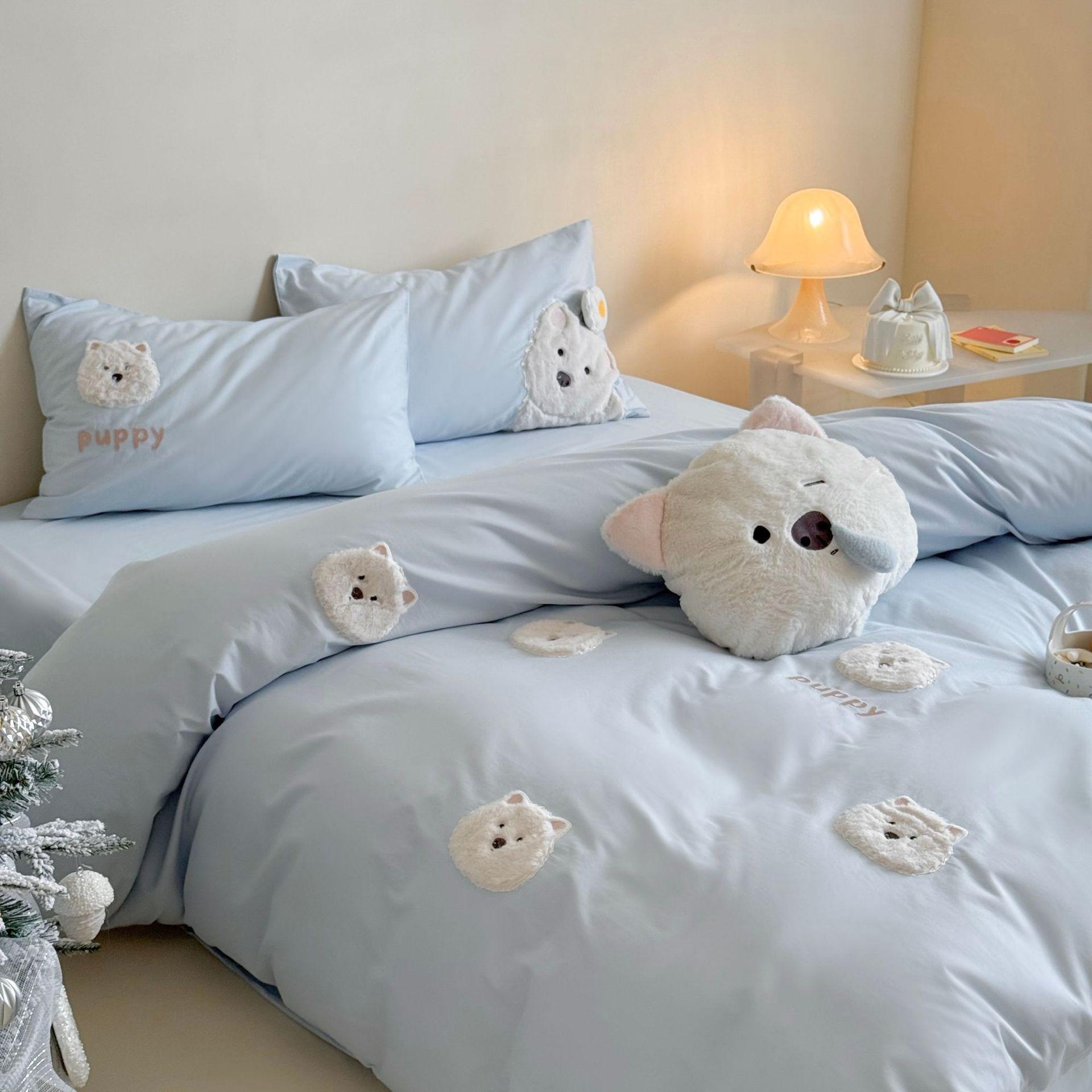 Conjunto de tres o cuatro piezas de algodón puro con felpa para otoño e invierno bordado de cachorro de dibujos animados funda nórdica de algodón puro sábana de cama ropa de cama gruesa para niños