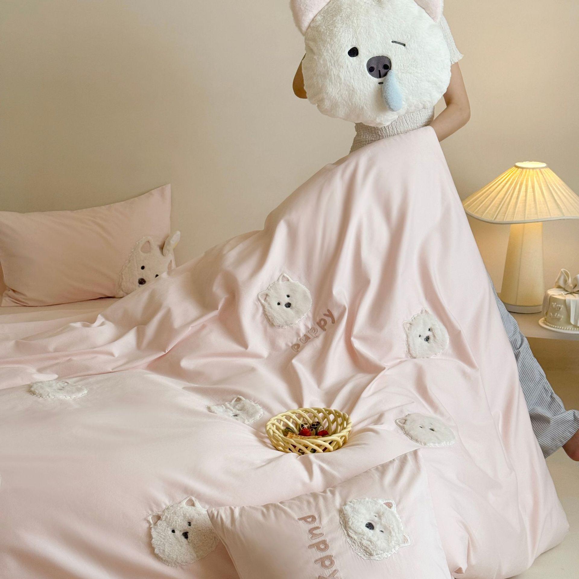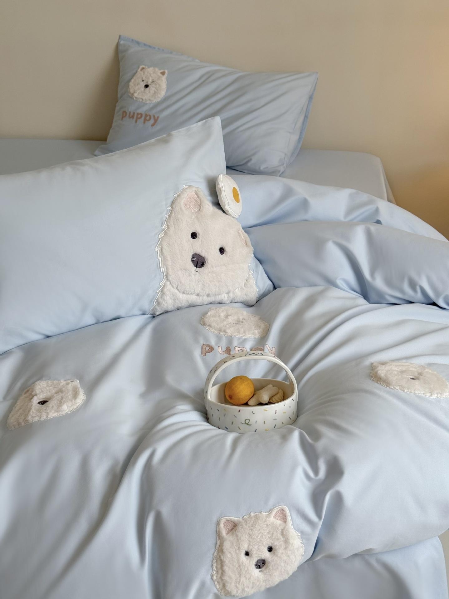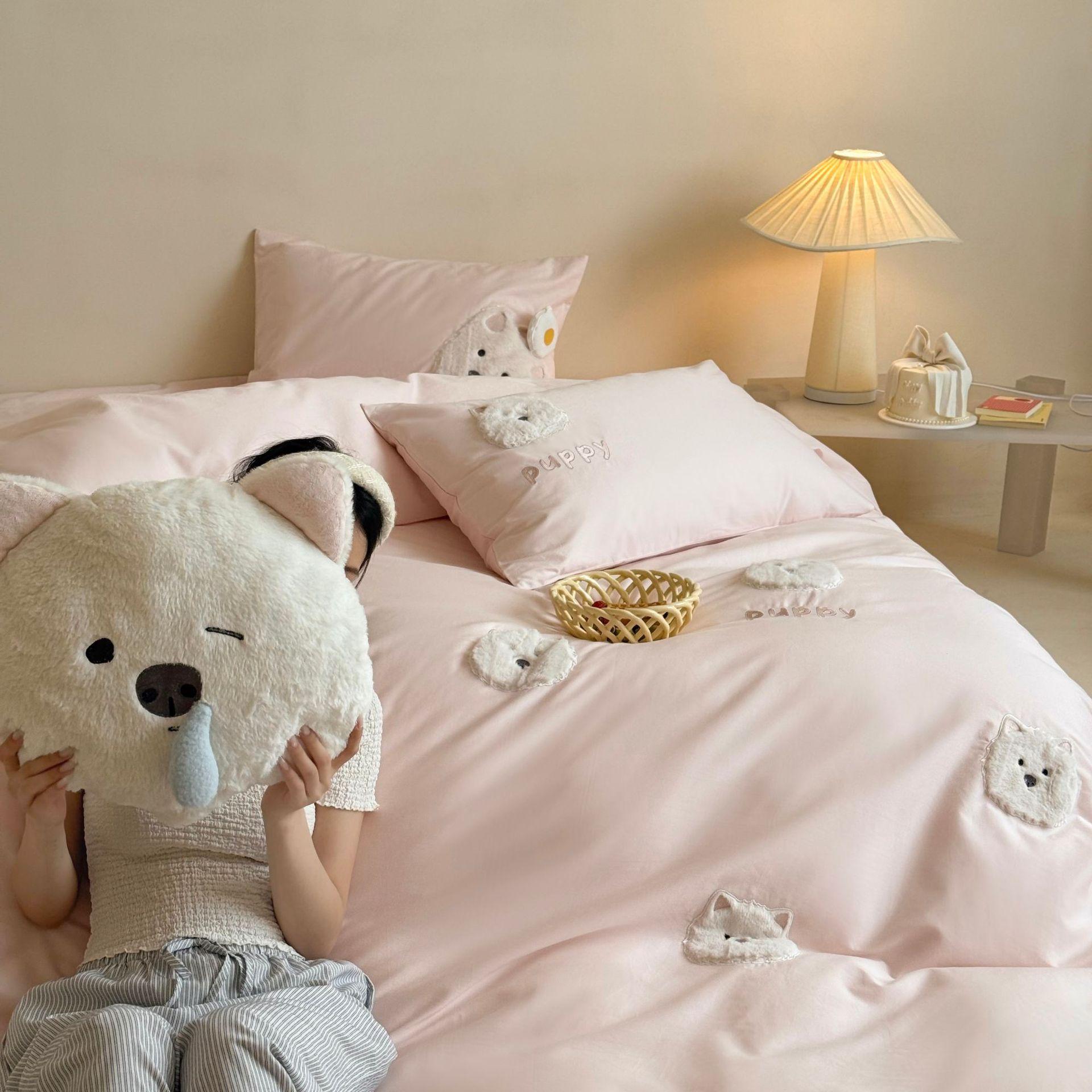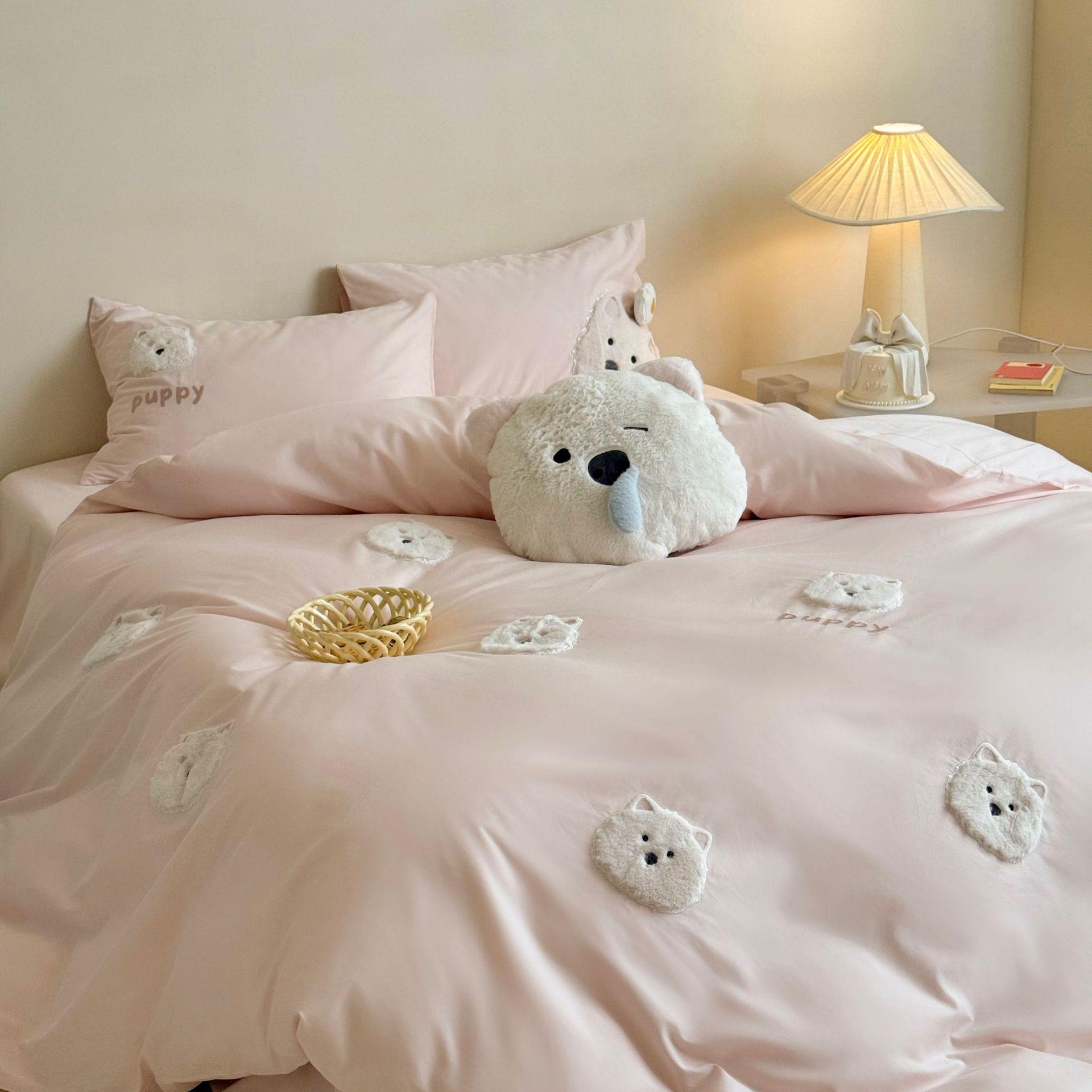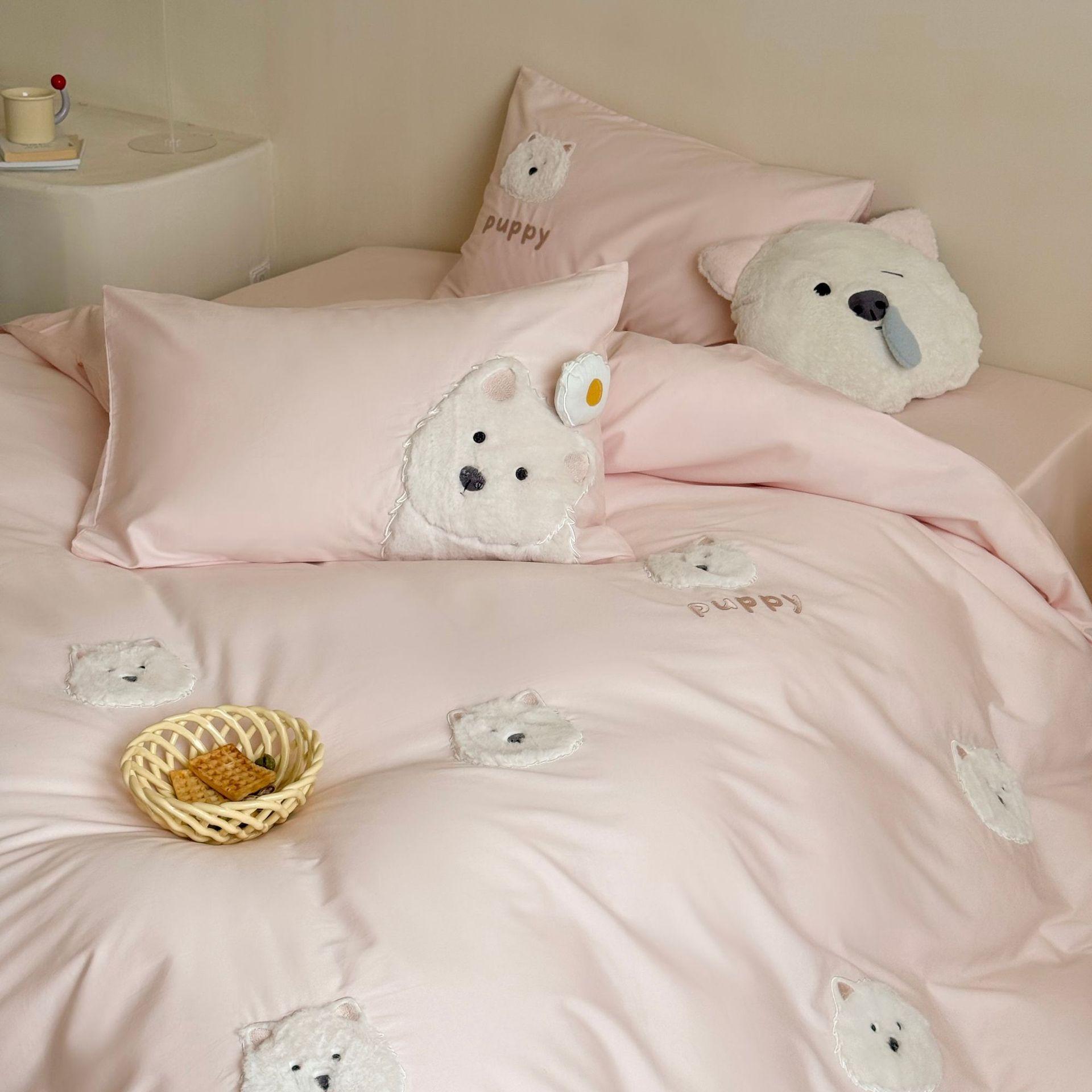 Conjunto de tres o cuatro piezas de algodón puro con felpa para otoño e invierno bordado de cachorro de dibujos animados funda nórdica de algodón puro sábana de cama ropa de cama gruesa para niños