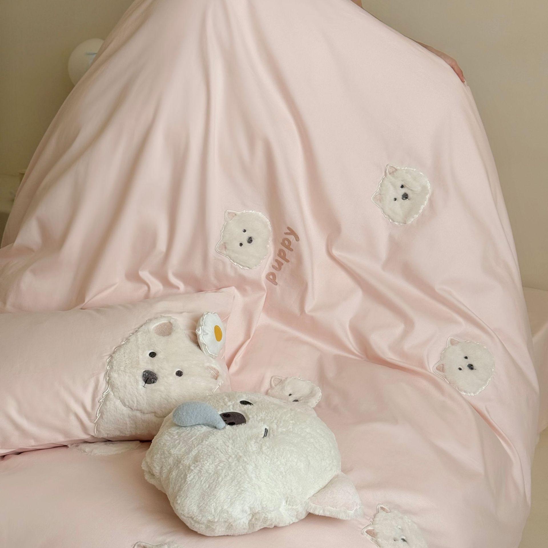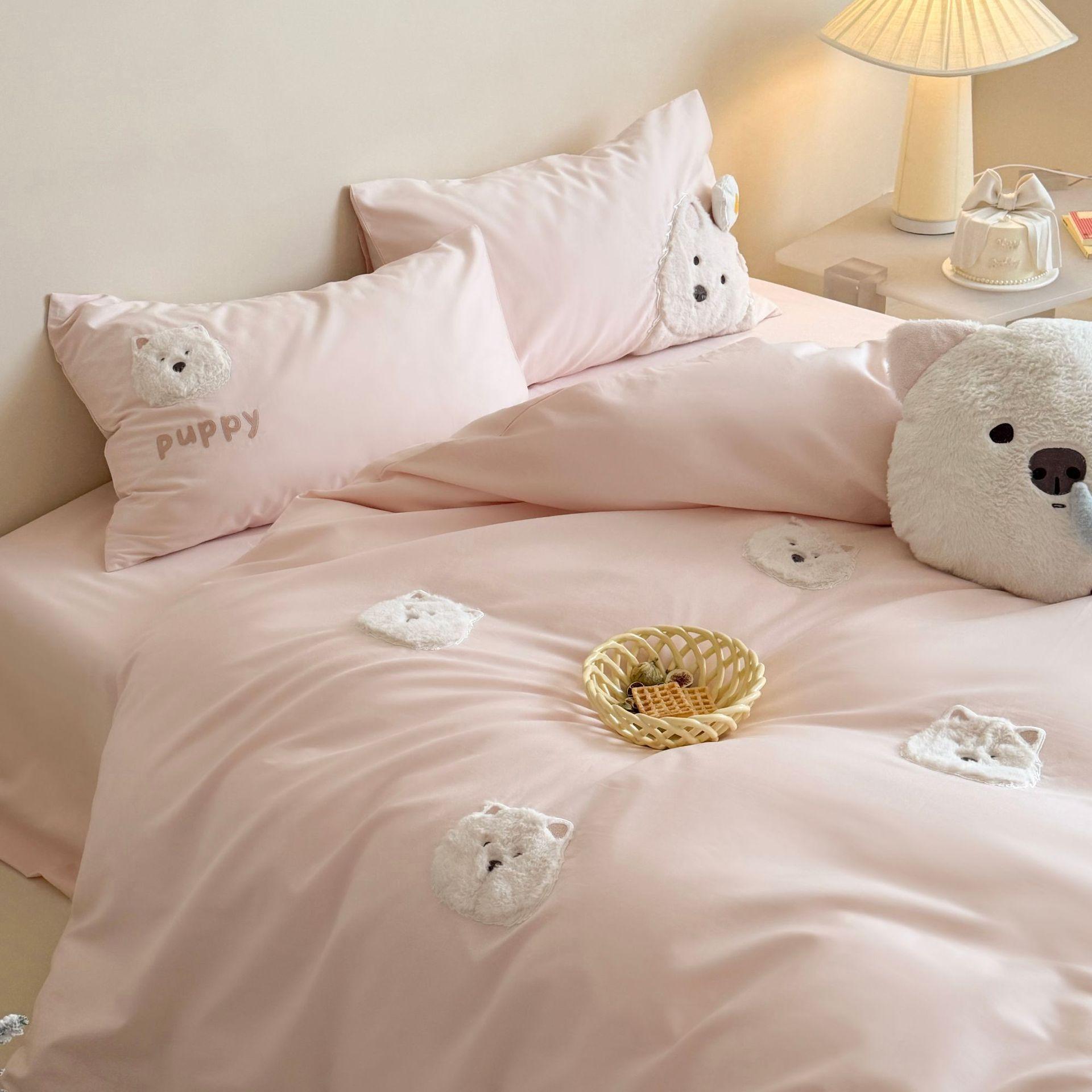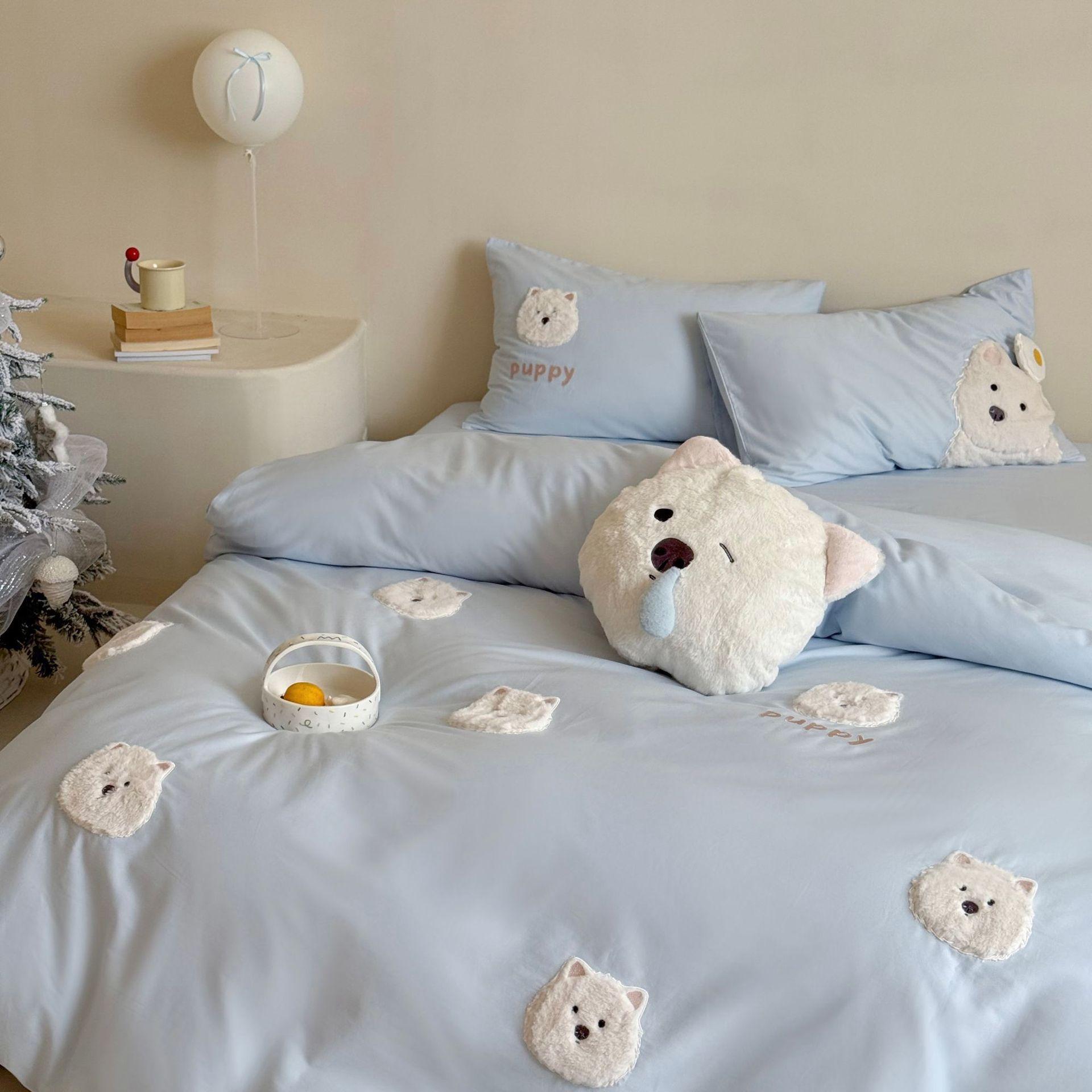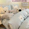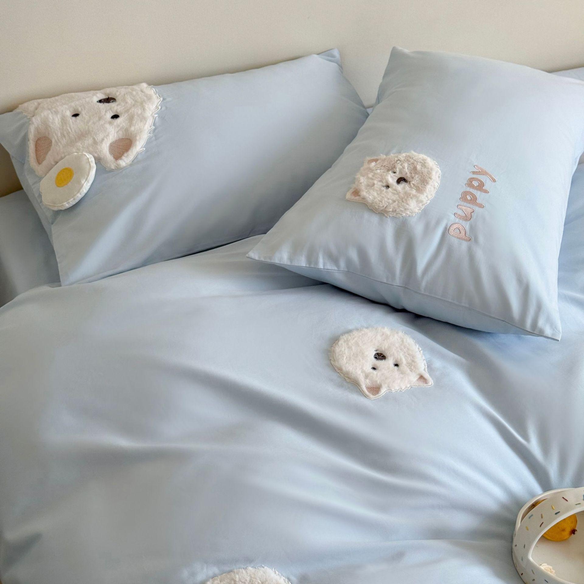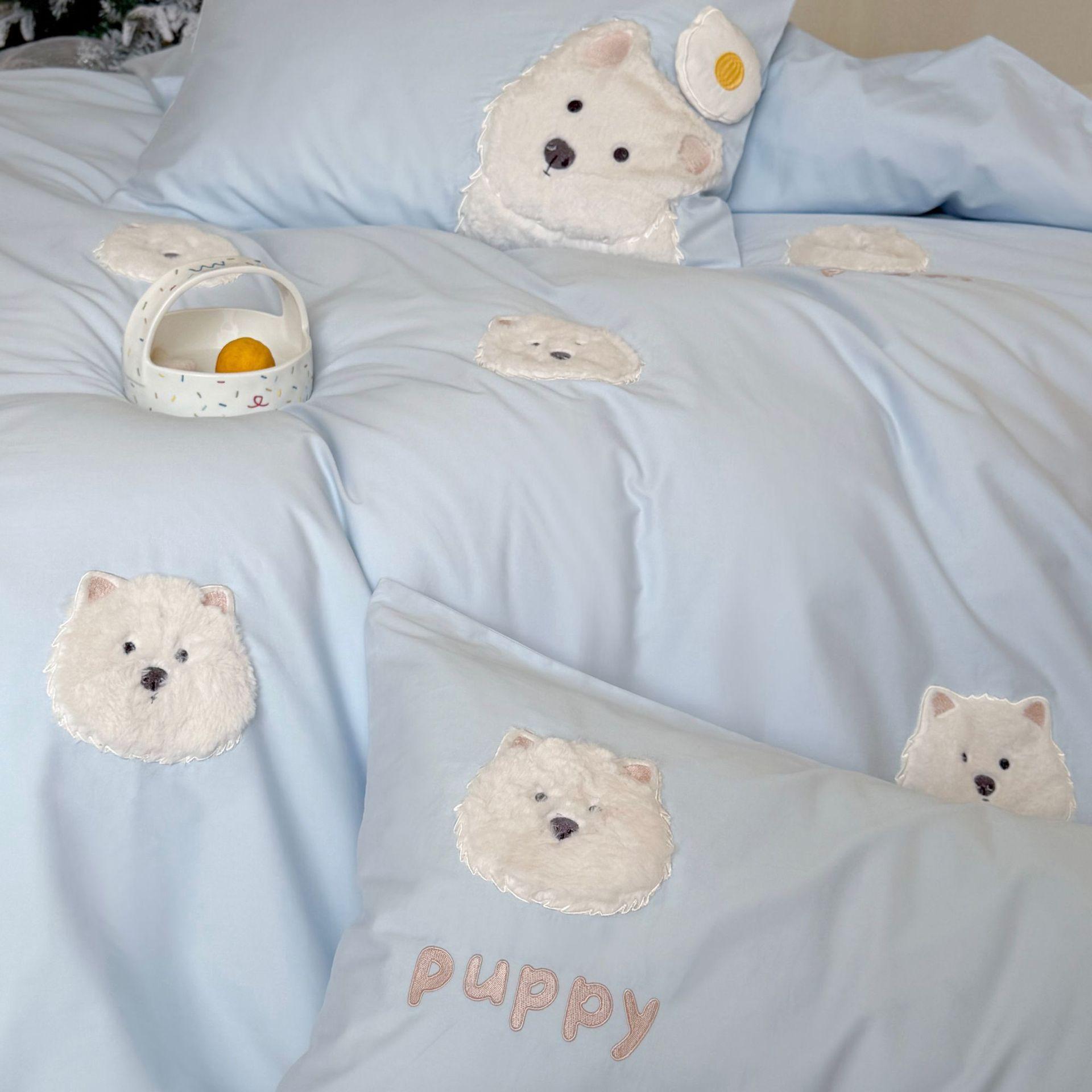 Conjunto de tres o cuatro piezas de algodón puro con felpa para otoño e invierno bordado de cachorro de dibujos animados funda nórdica de algodón puro sábana de cama ropa de cama gruesa para niños