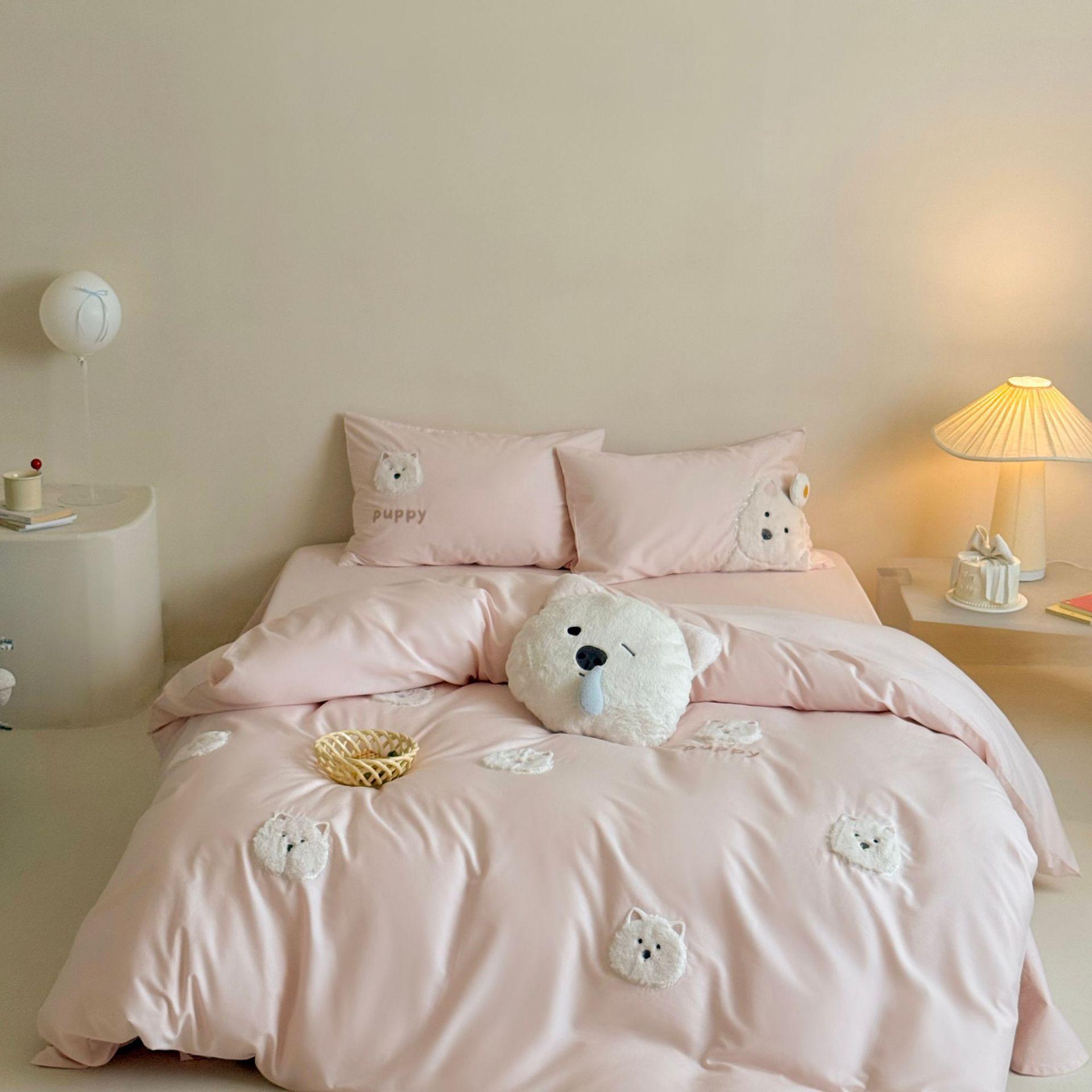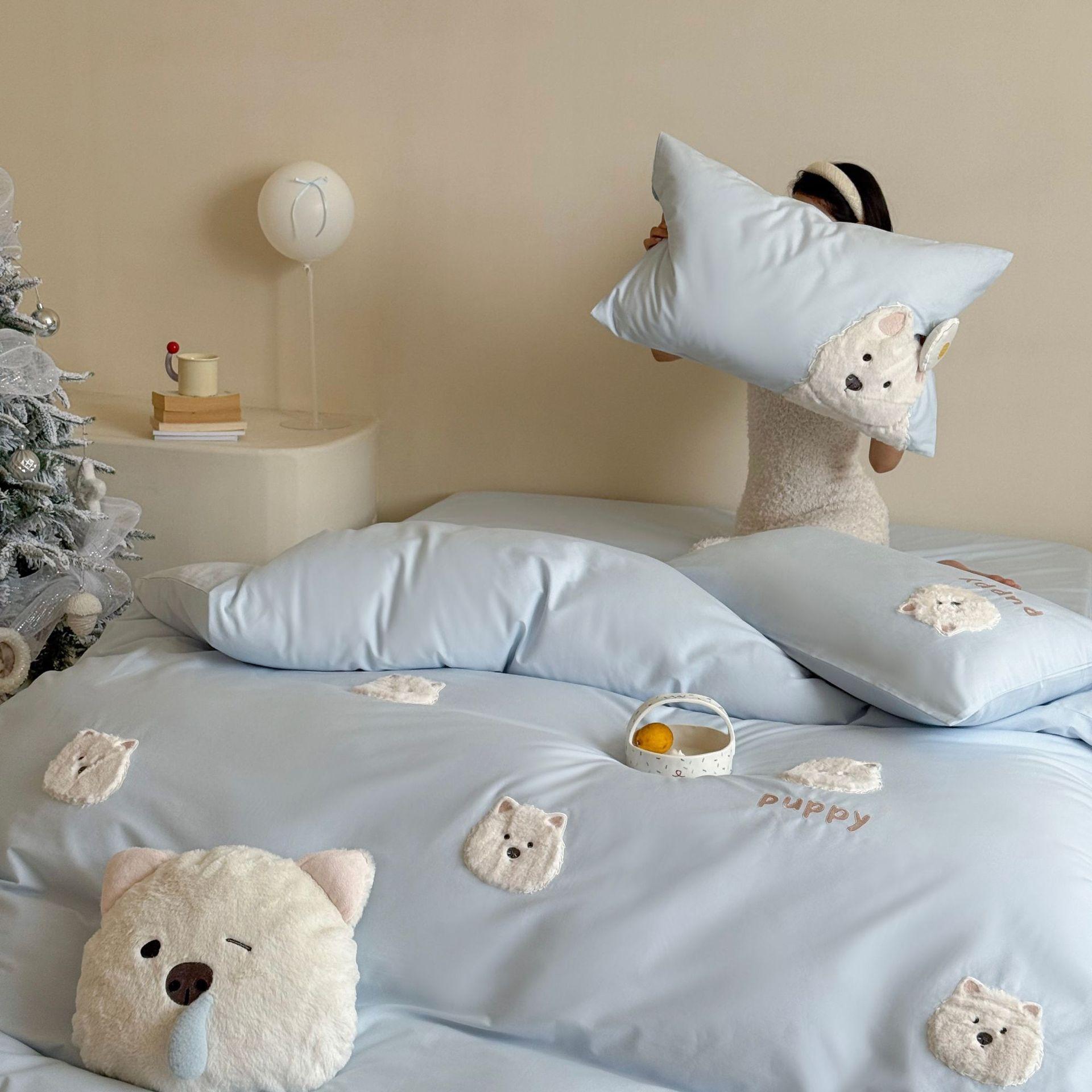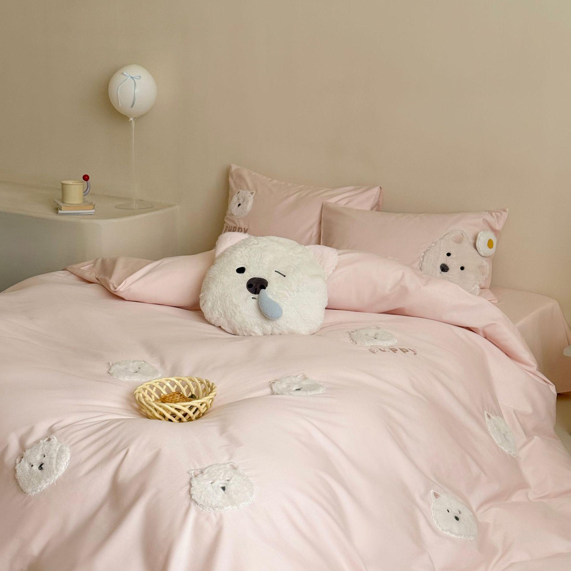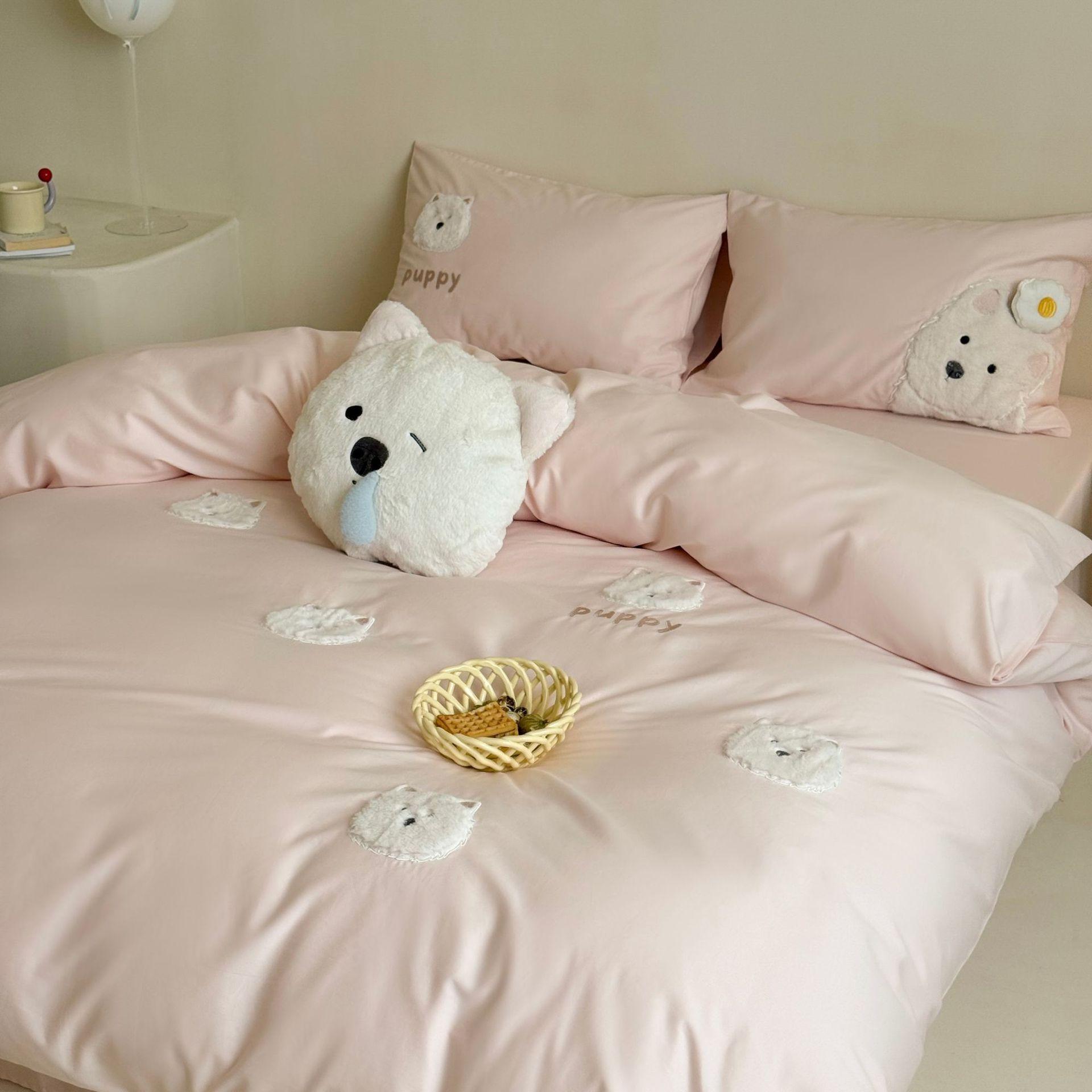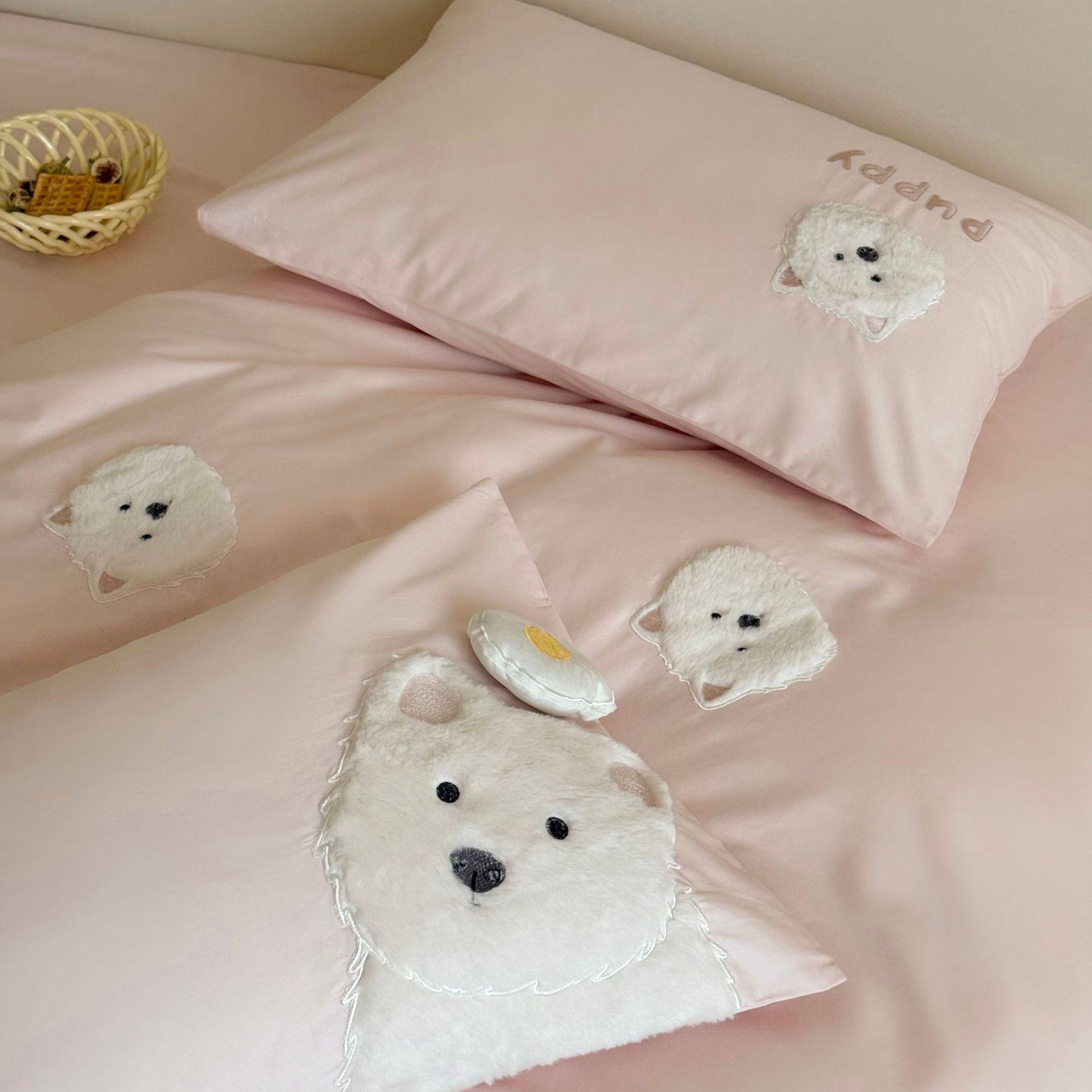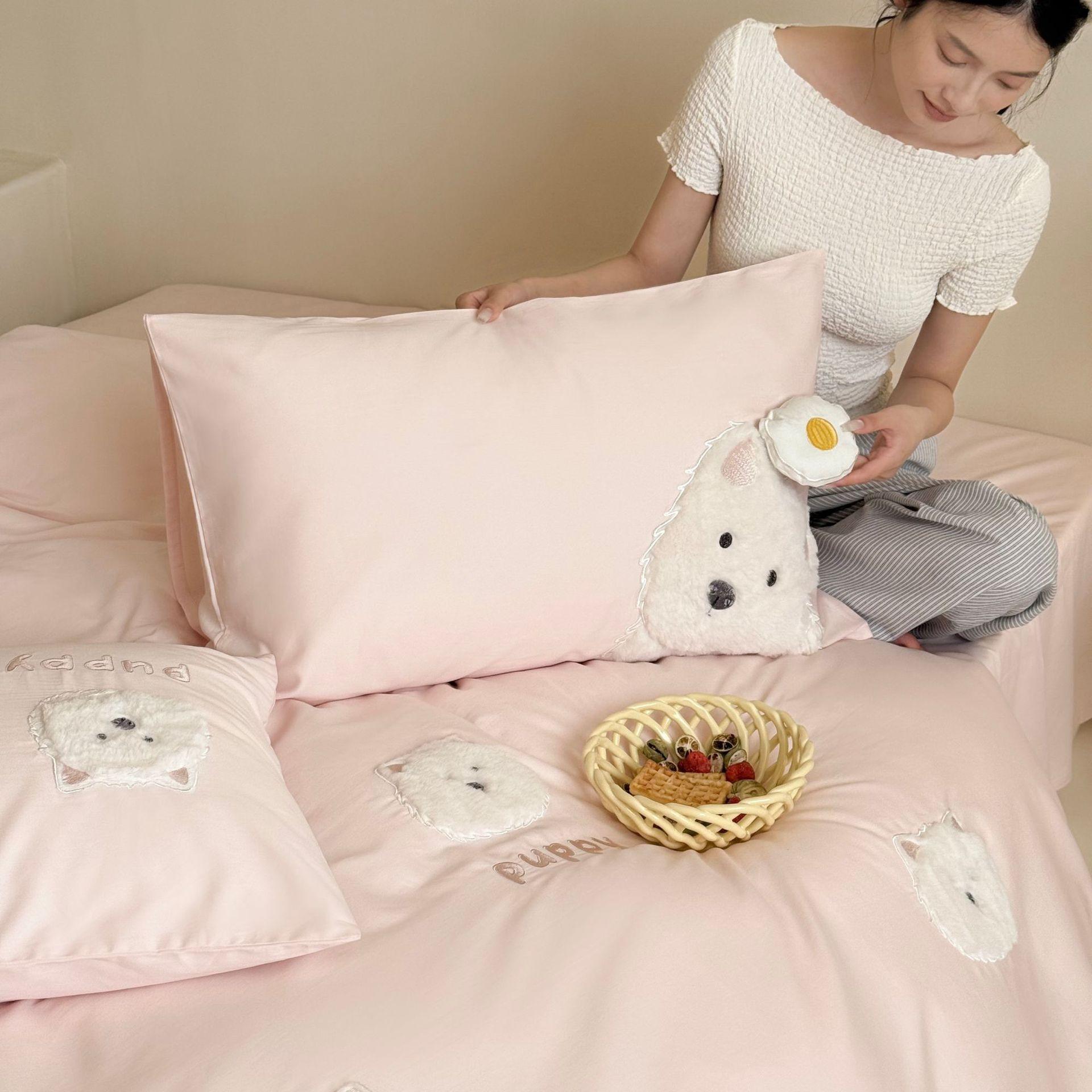 Conjunto de tres o cuatro piezas de algodón puro con felpa para otoño e invierno bordado de cachorro de dibujos animados funda nórdica de algodón puro sábana de cama ropa de cama gruesa para niños