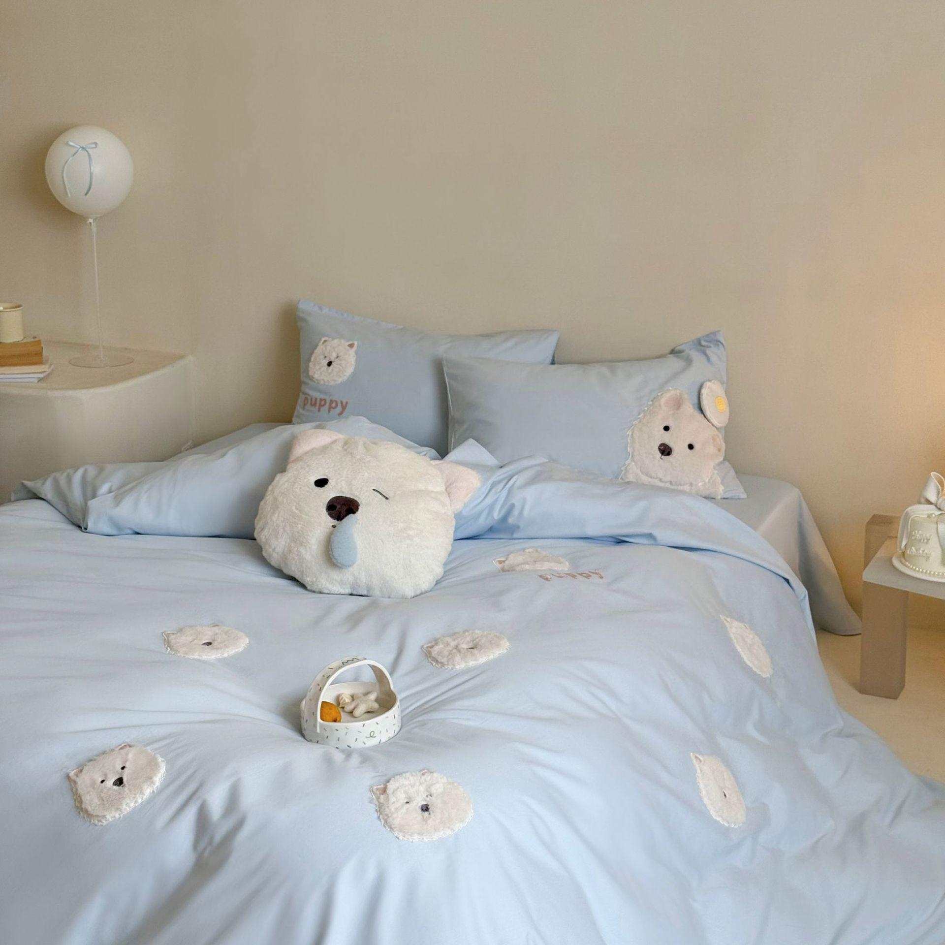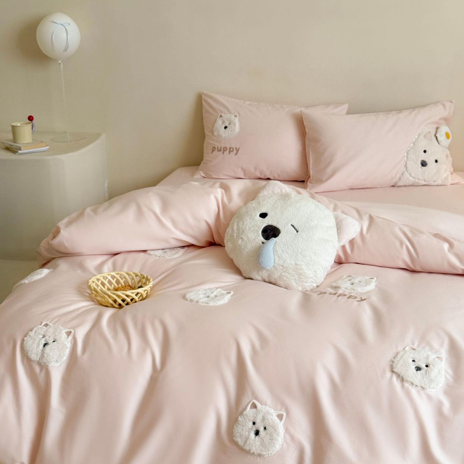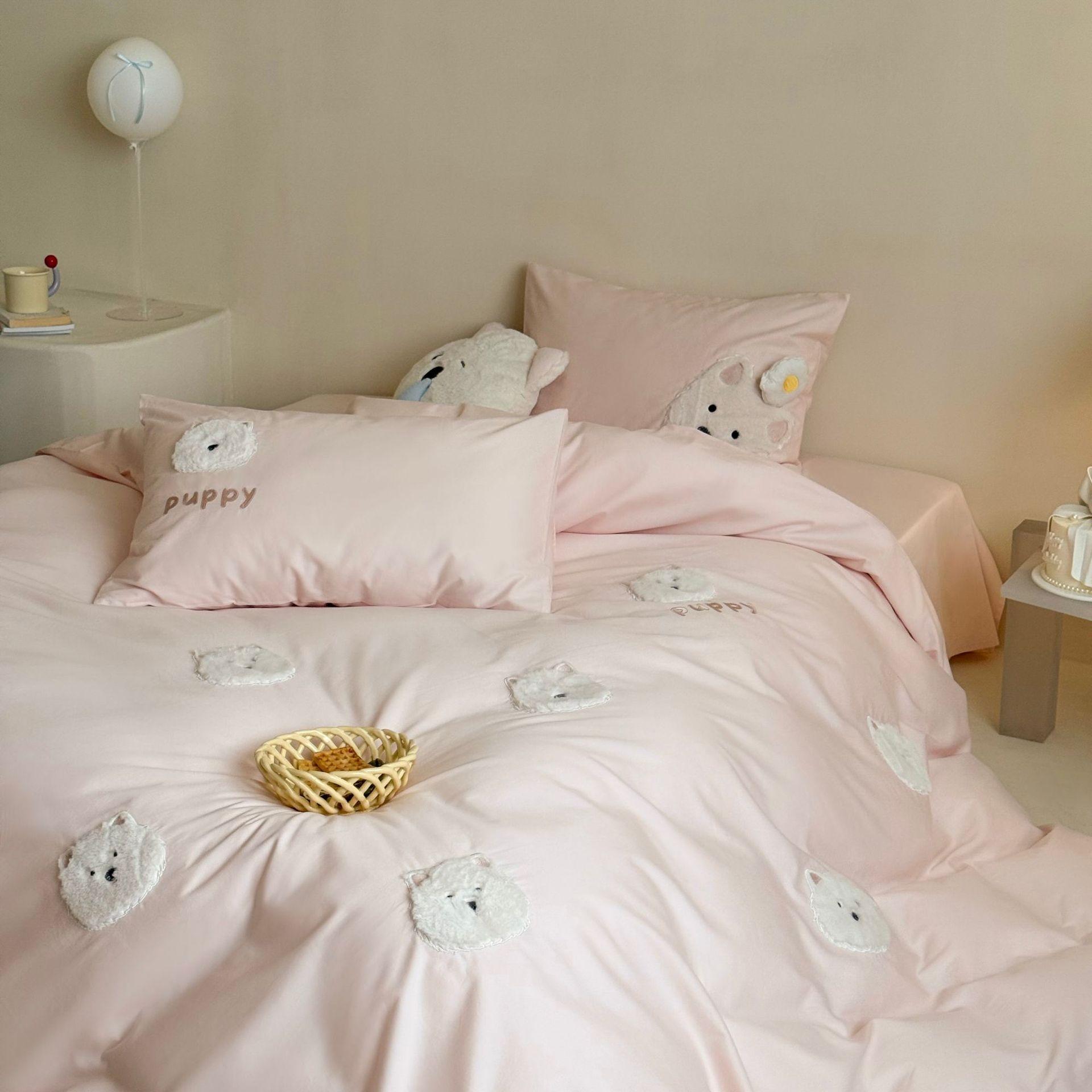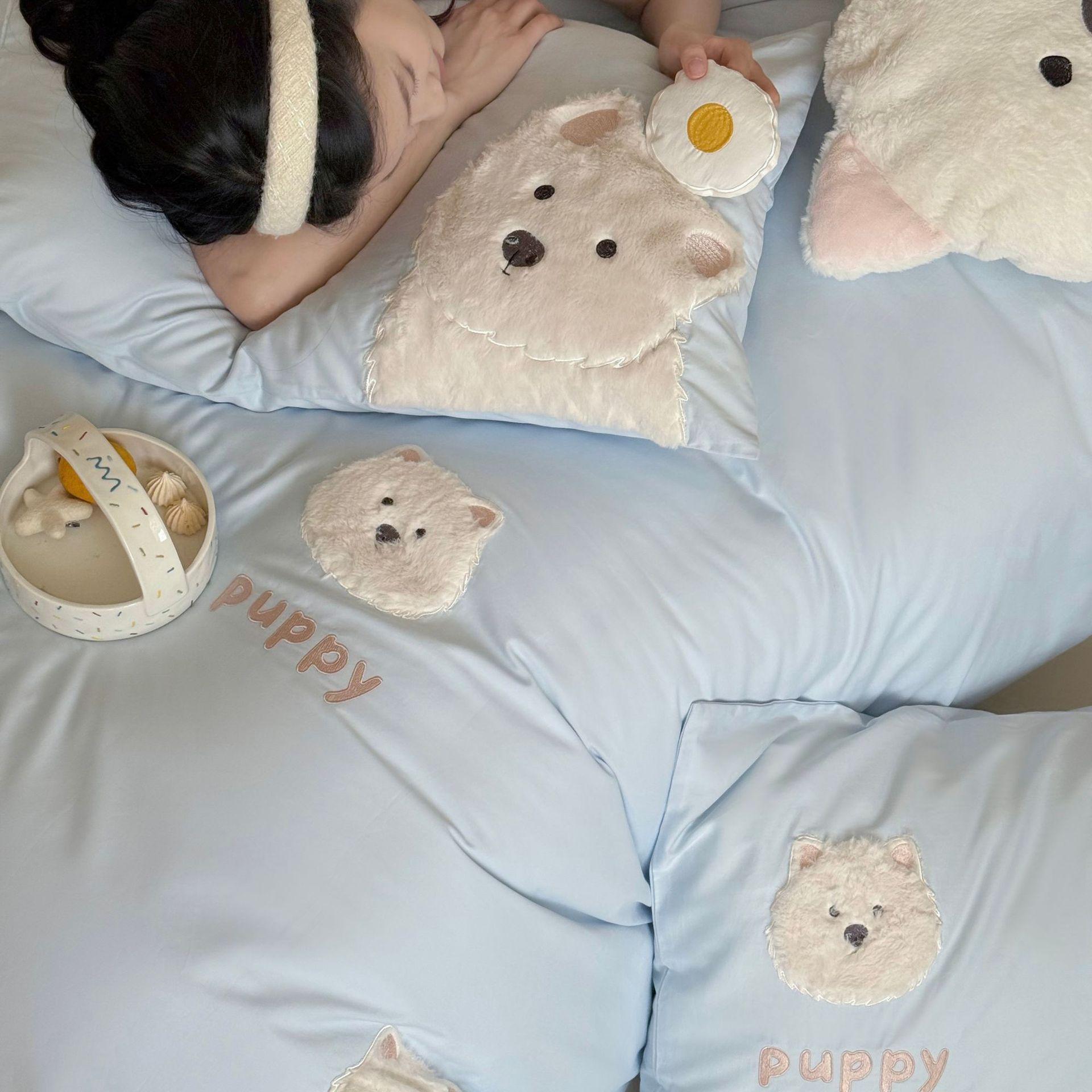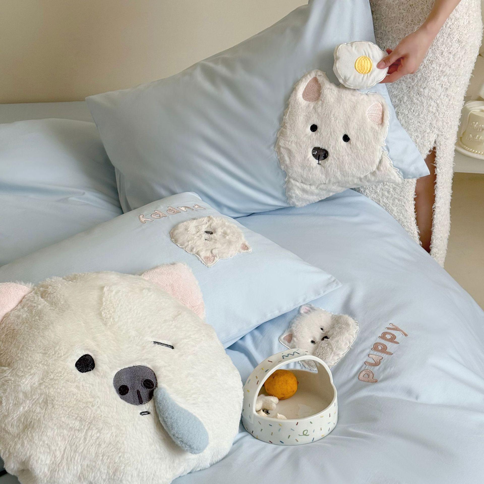 Conjunto de tres o cuatro piezas de algodón puro con felpa para otoño e invierno bordado de cachorro de dibujos animados funda nórdica de algodón puro sábana de cama ropa de cama gruesa para niños