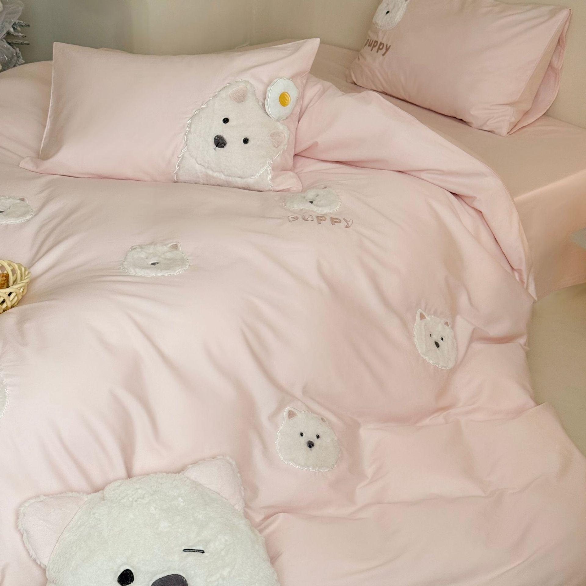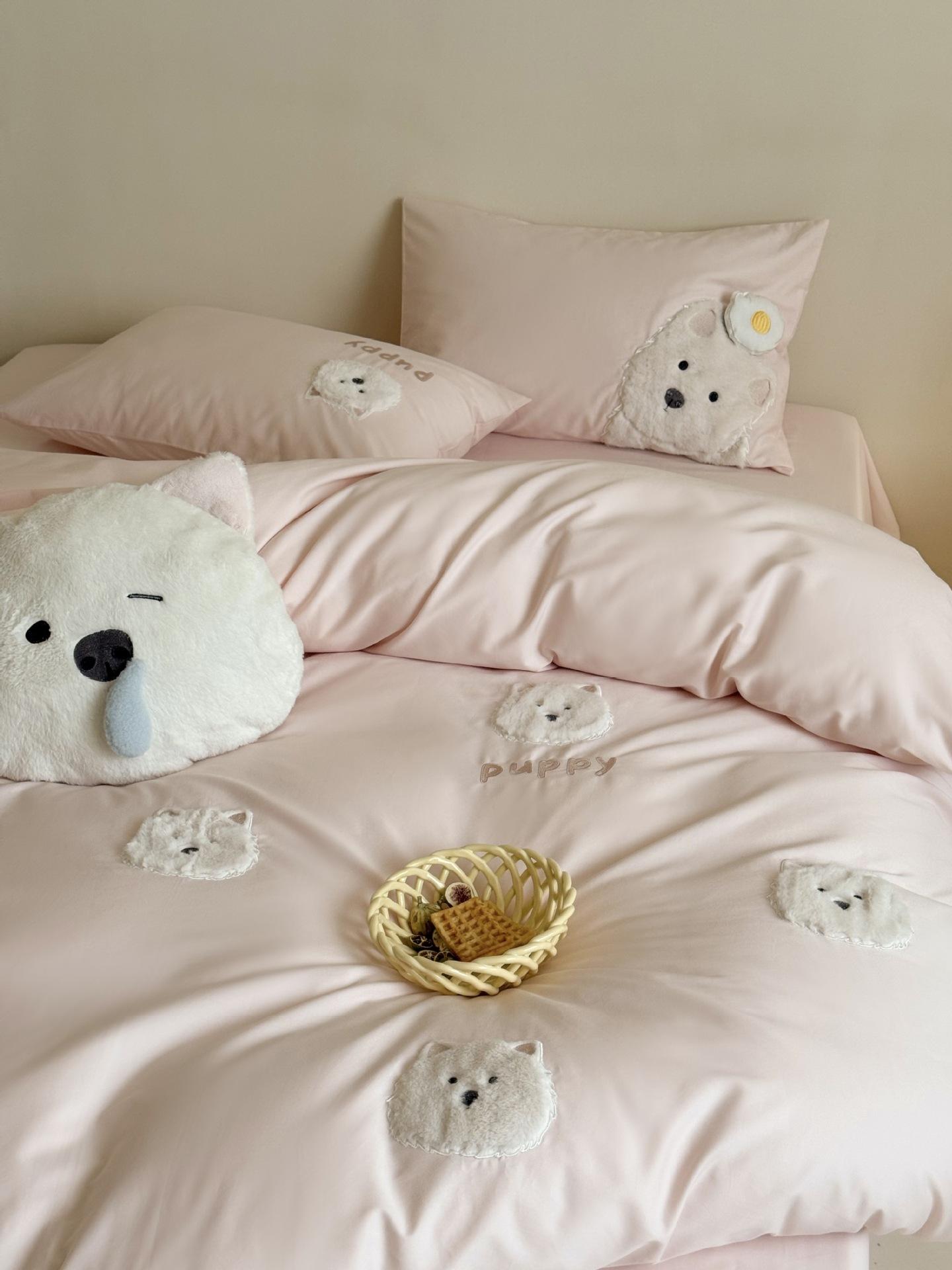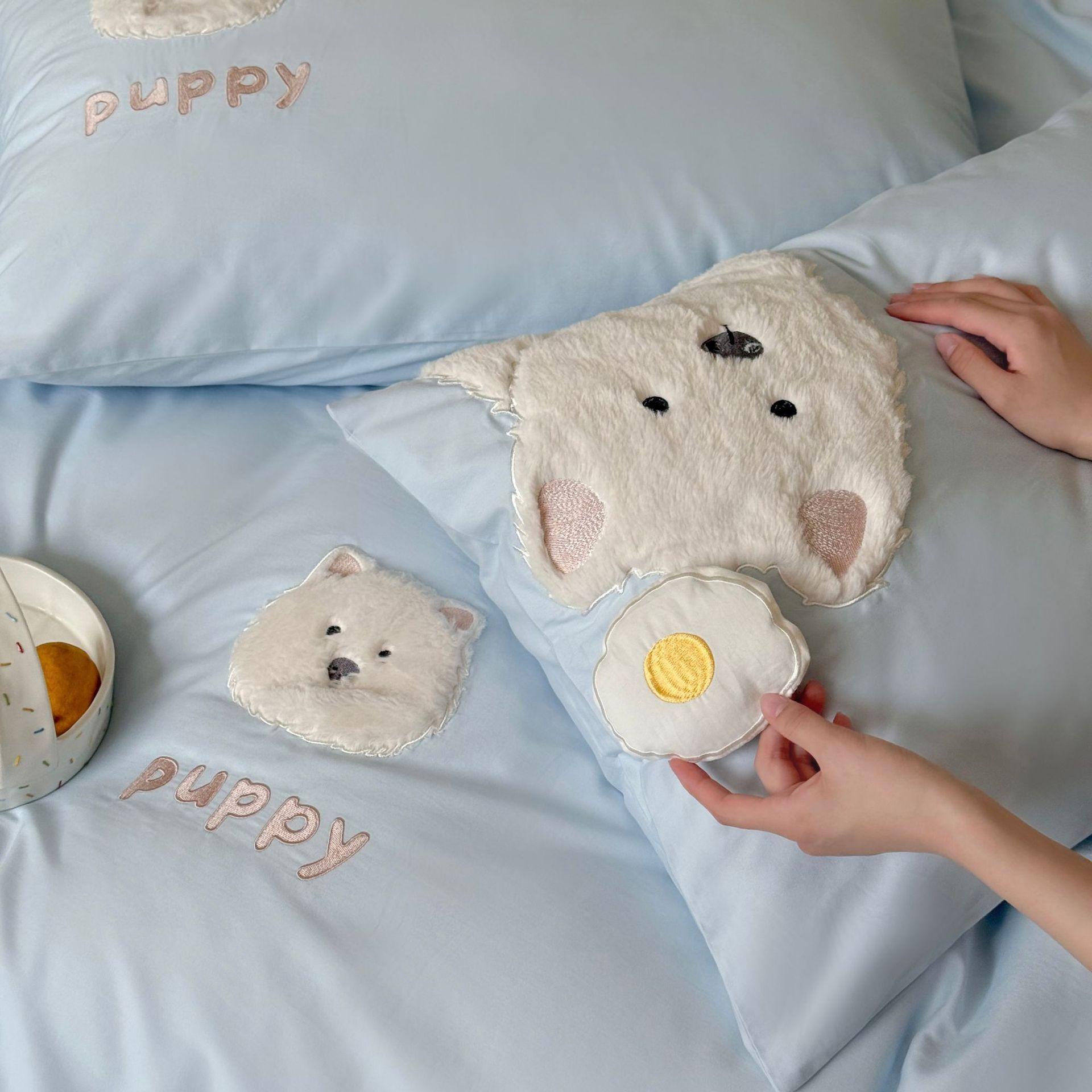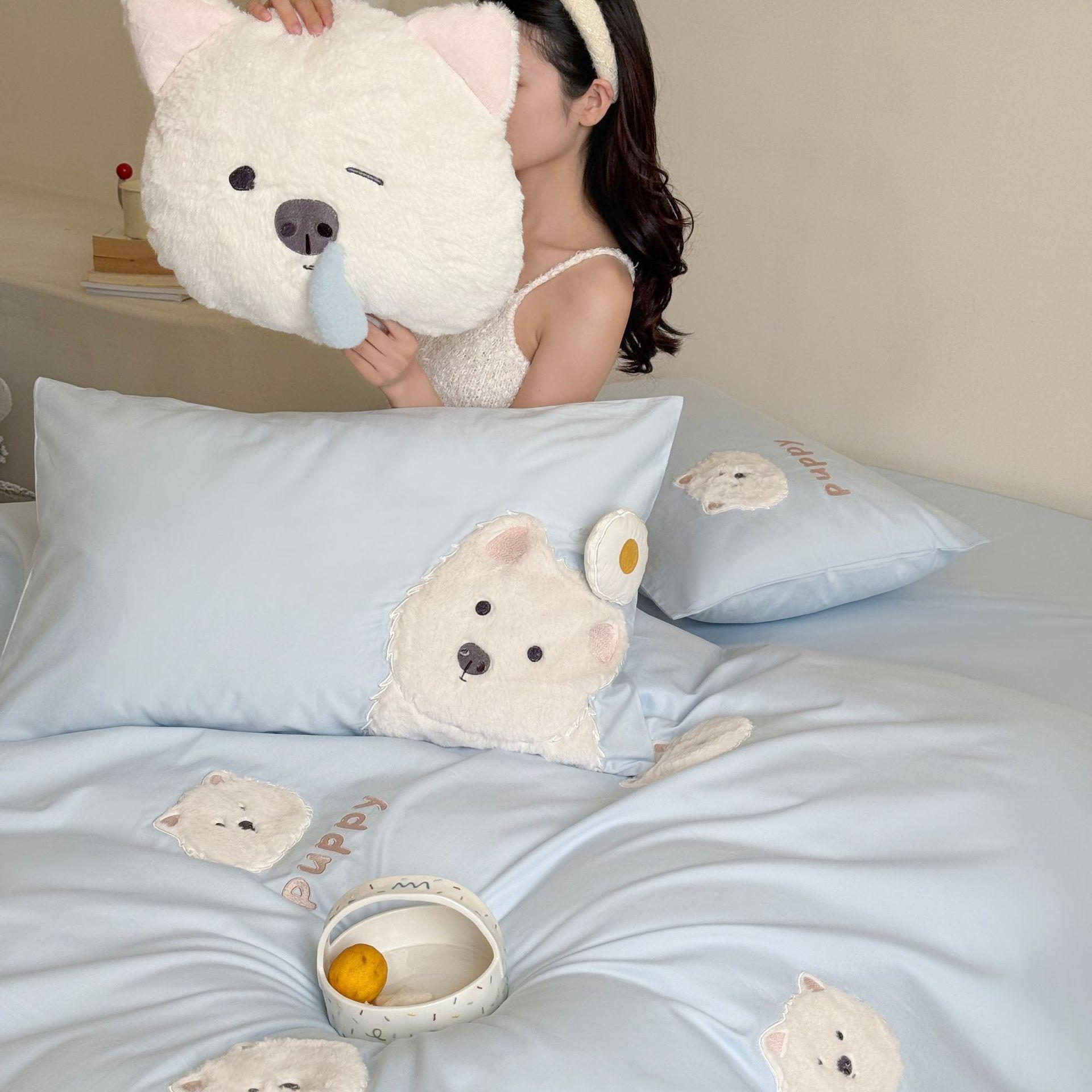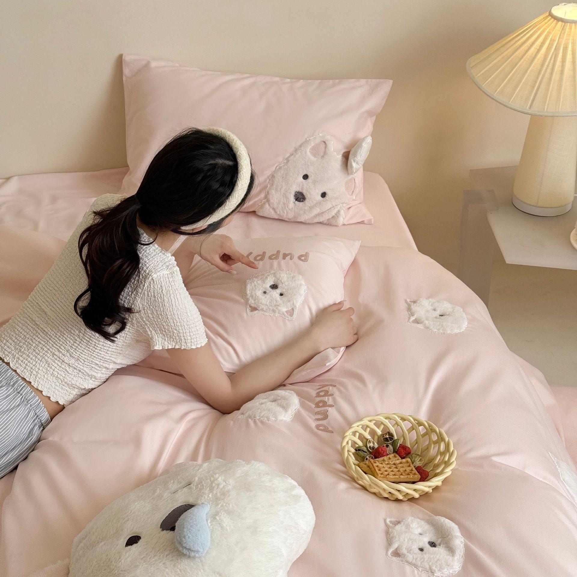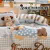 Conjunto de tres o cuatro piezas de algodón puro con felpa para otoño e invierno bordado de cachorro de dibujos animados funda nórdica de algodón puro sábana de cama ropa de cama gruesa para niños