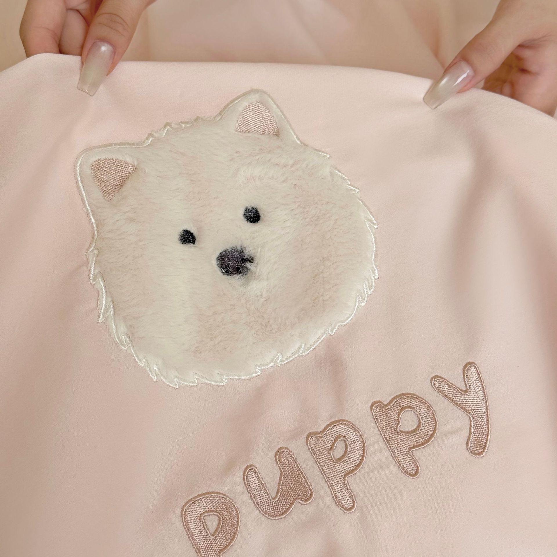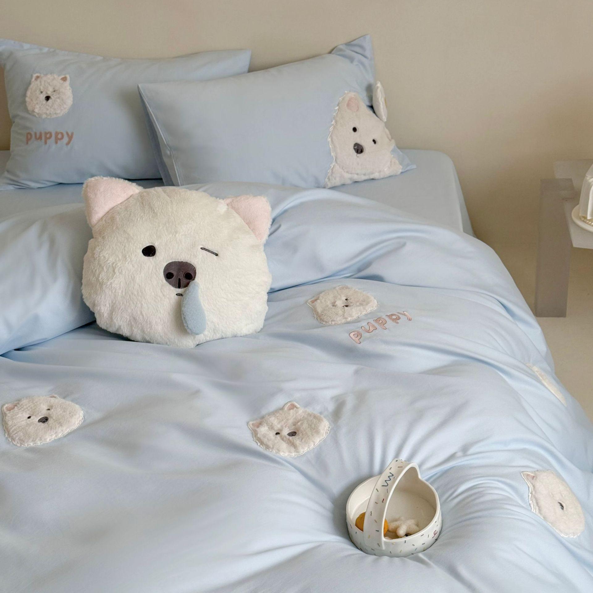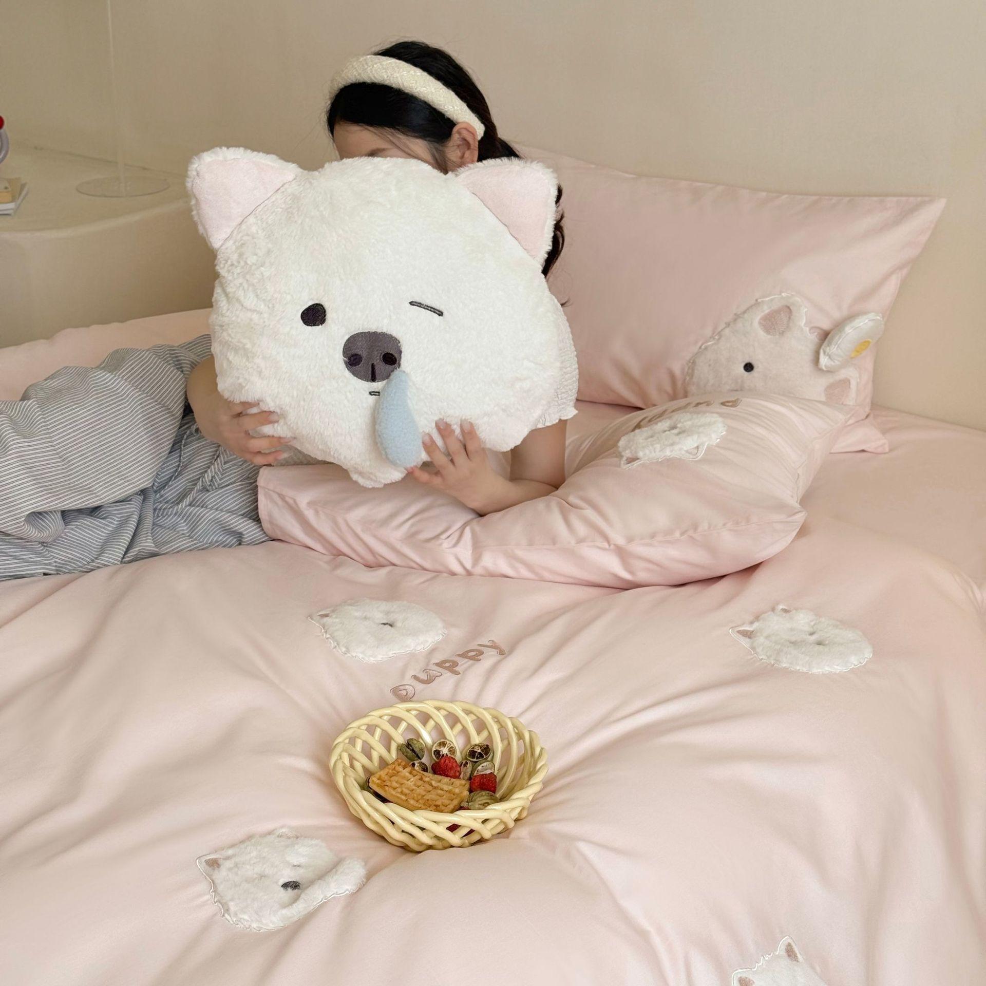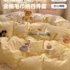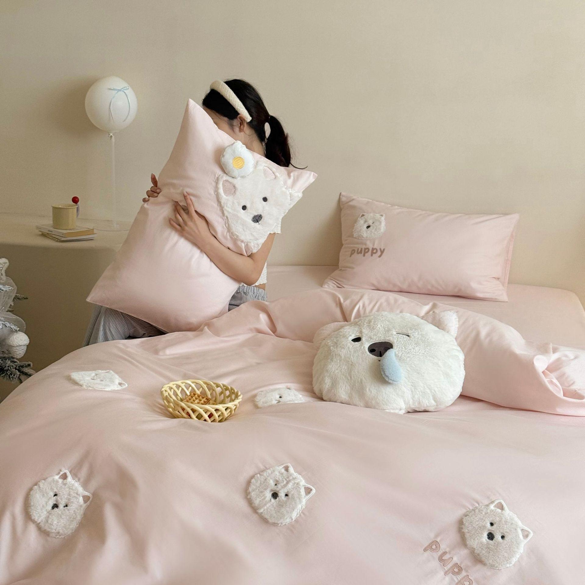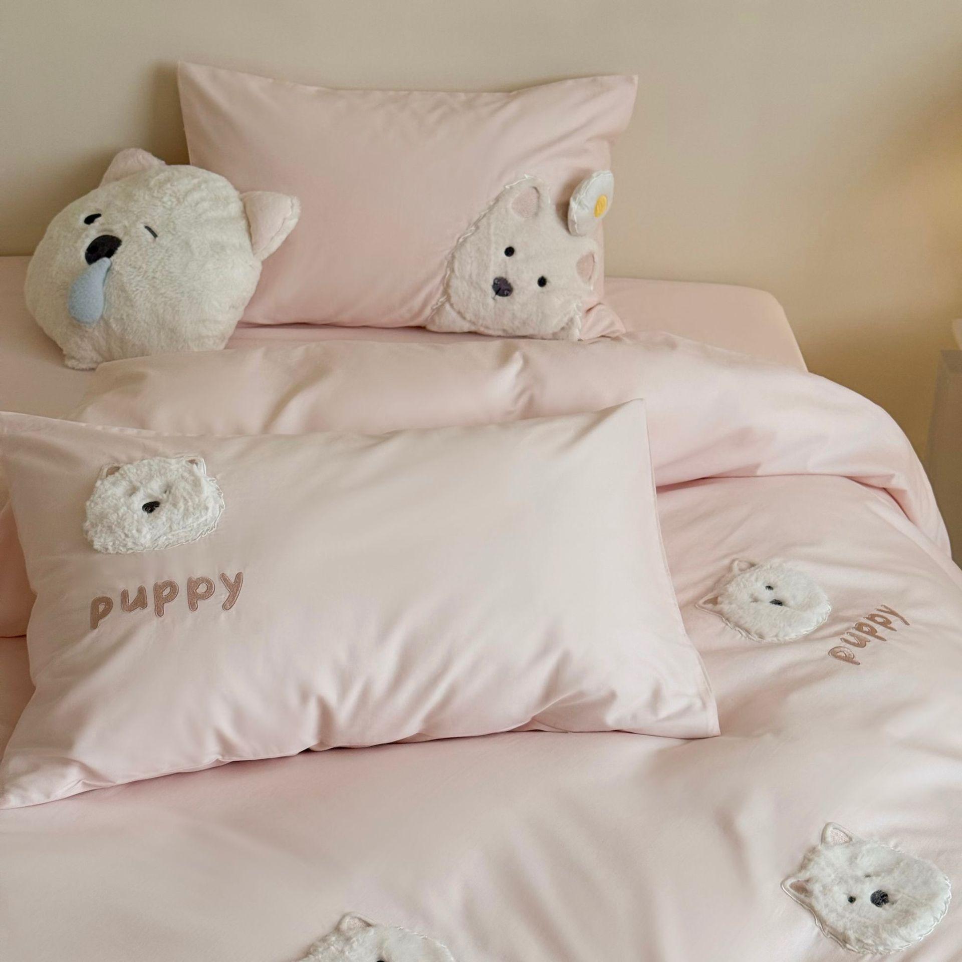 Conjunto de tres o cuatro piezas de algodón puro con felpa para otoño e invierno bordado de cachorro de dibujos animados funda nórdica de algodón puro sábana de cama ropa de cama gruesa para niños