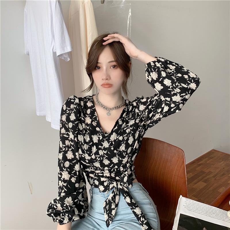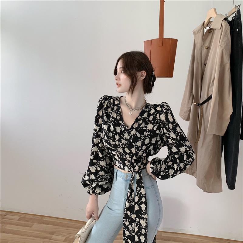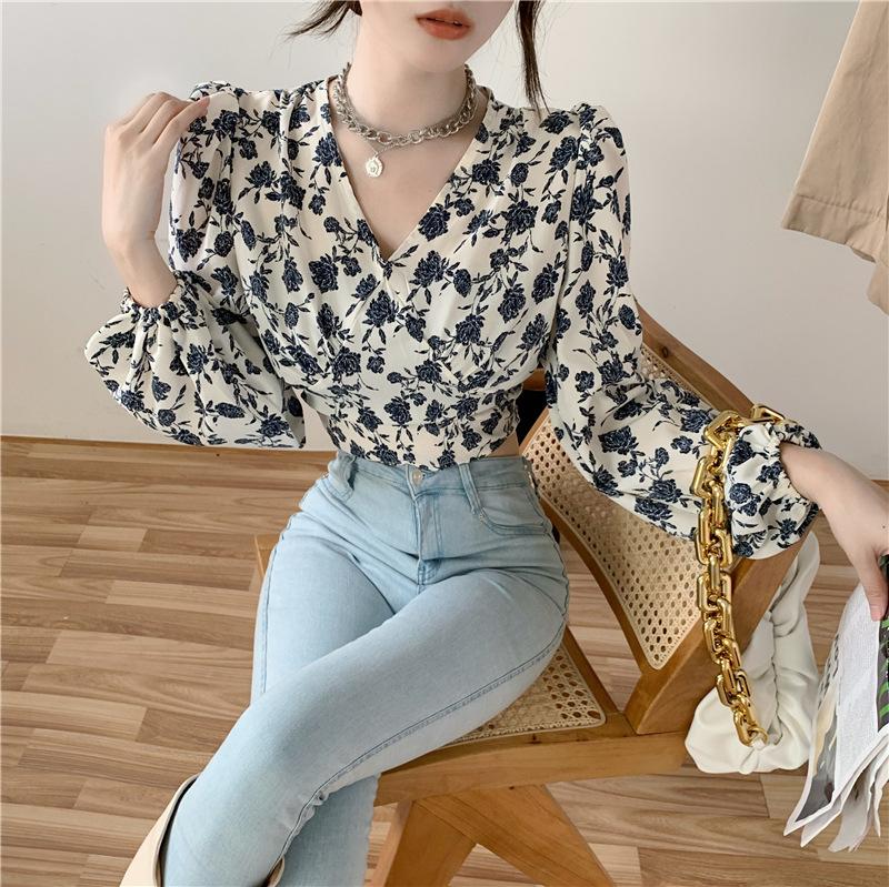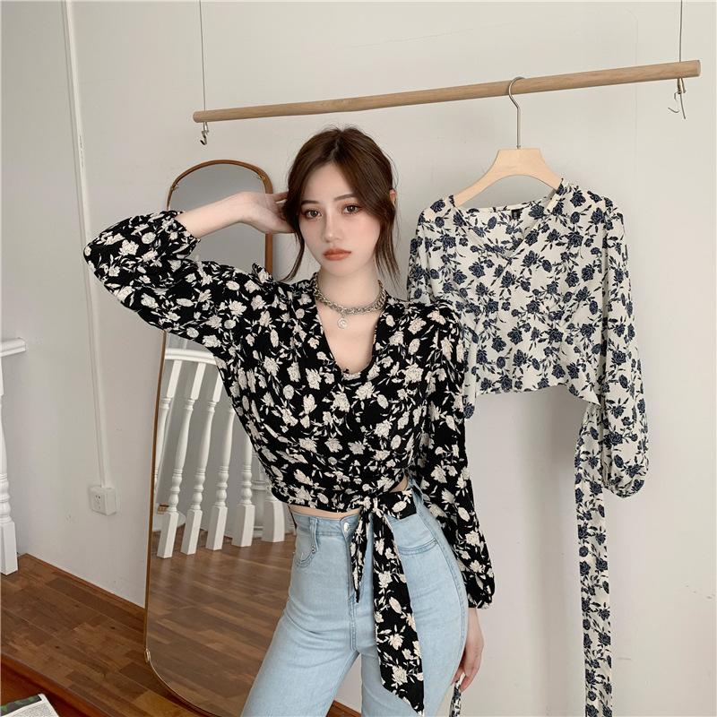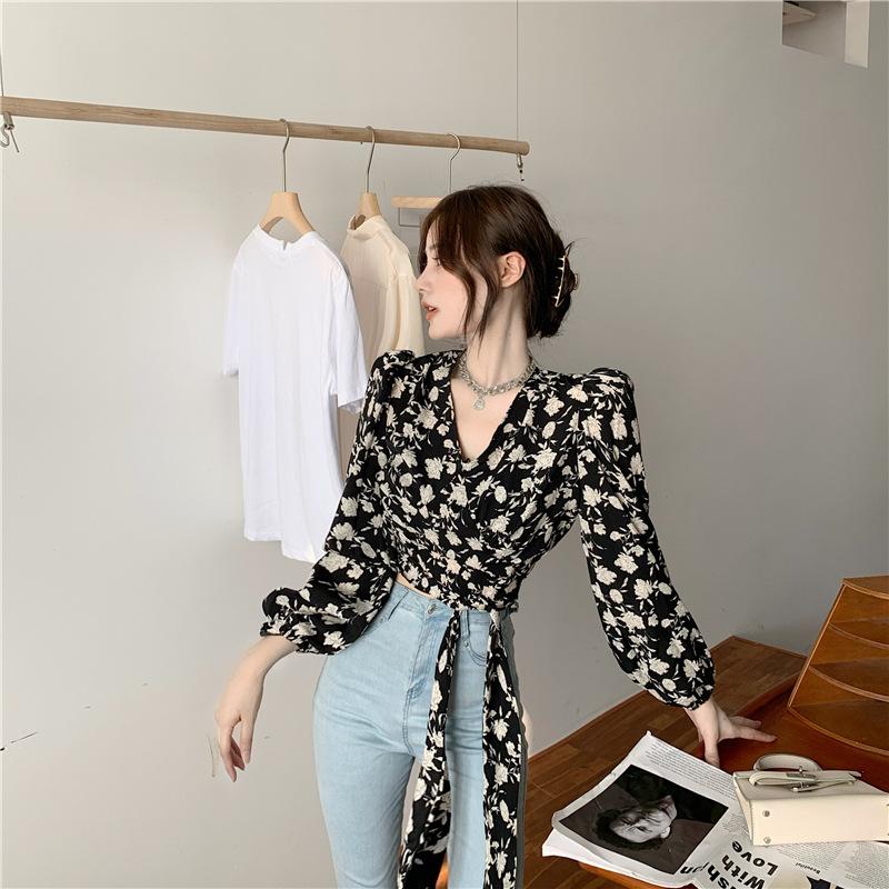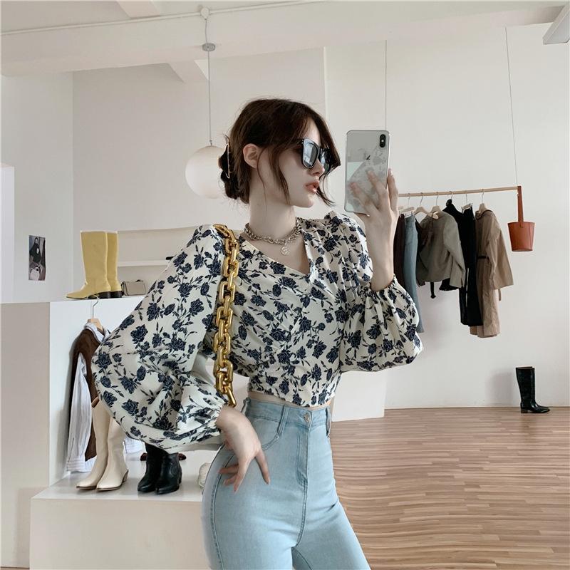 Top Floral para Mujer Verano Estilo Francés Retro Manga Larga Cuello en V Camisa de Tirantes Ajustada Diseño Corto Camisa Nicho