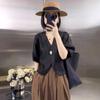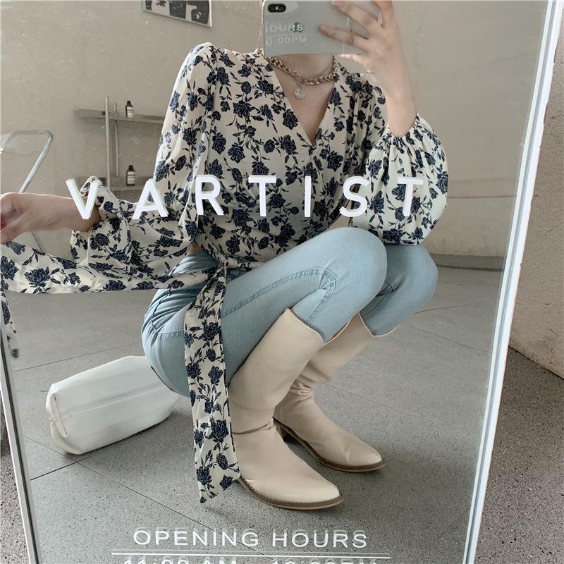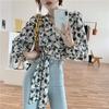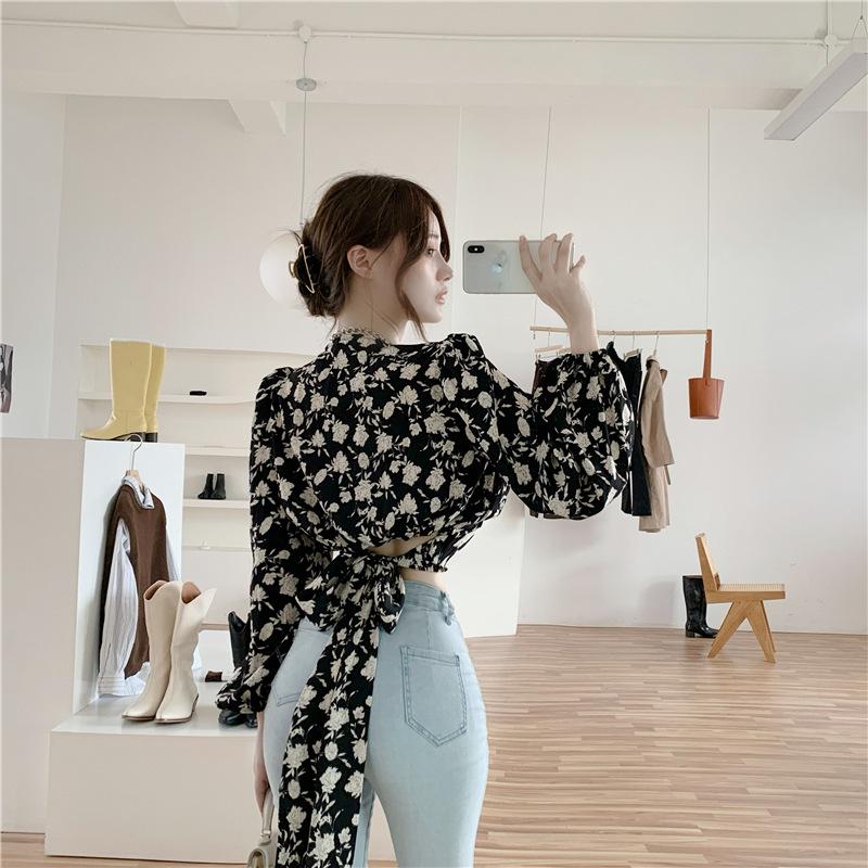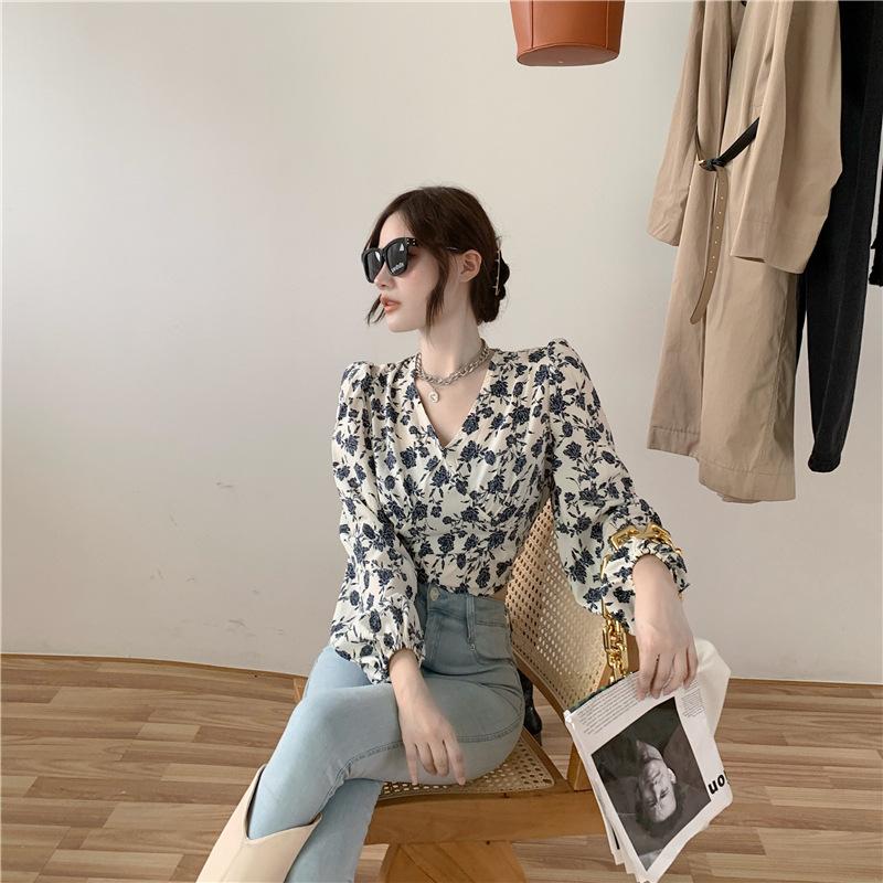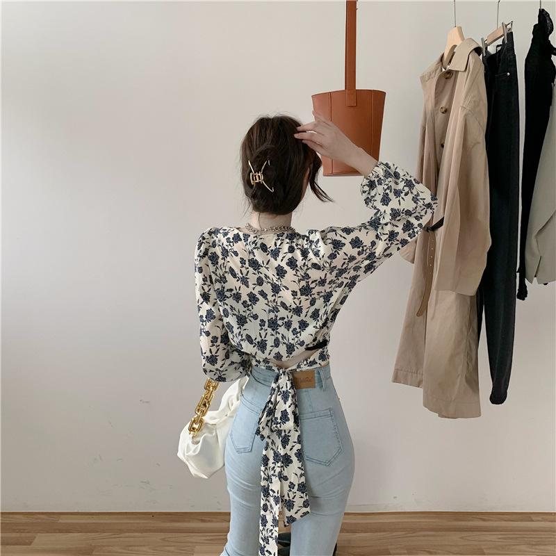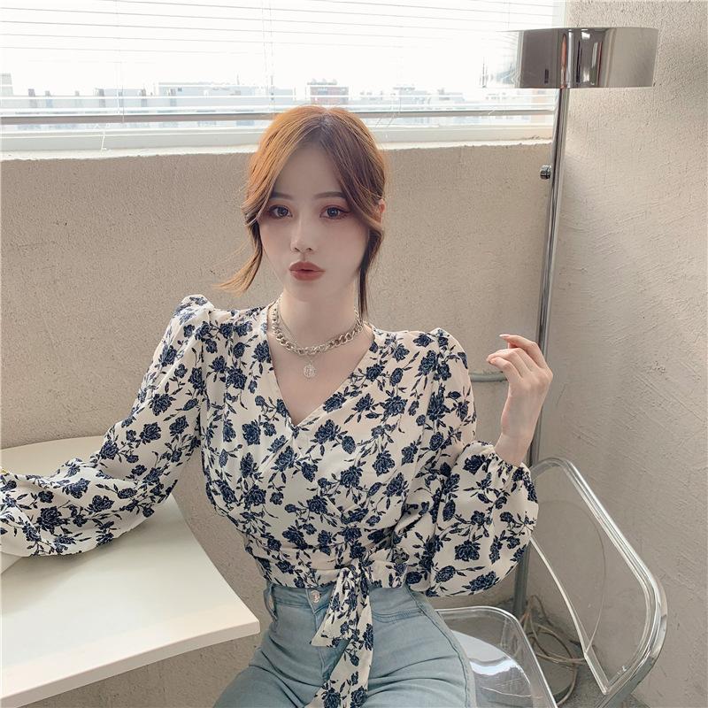 Top Floral para Mujer Verano Estilo Francés Retro Manga Larga Cuello en V Camisa de Tirantes Ajustada Diseño Corto Camisa Nicho