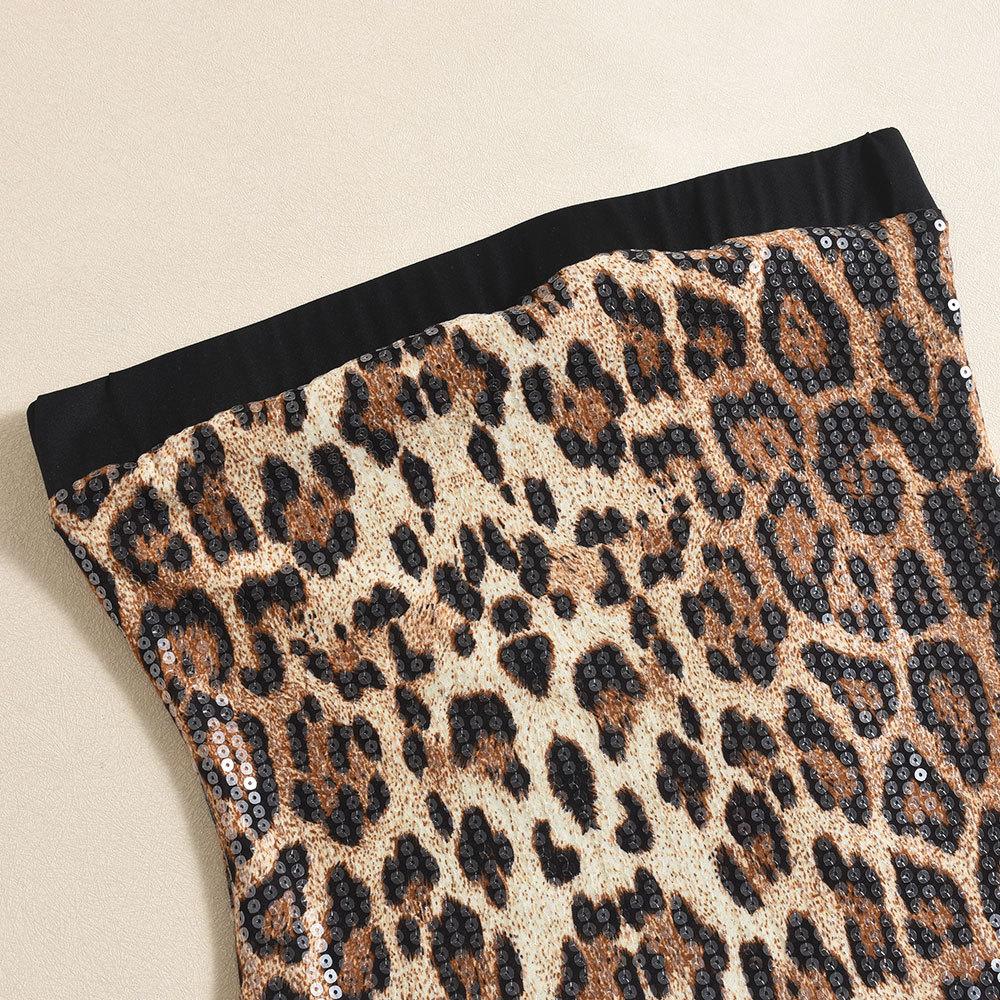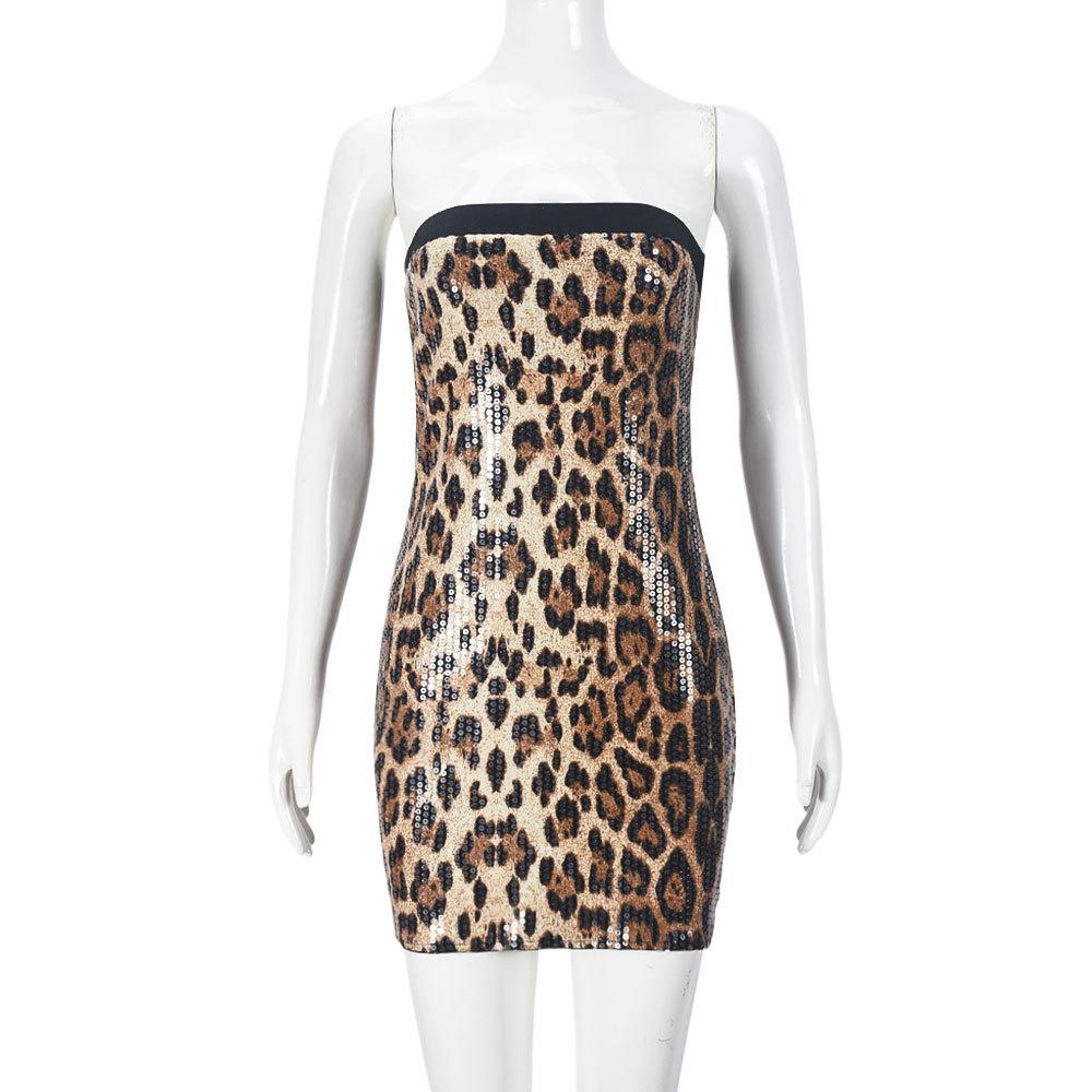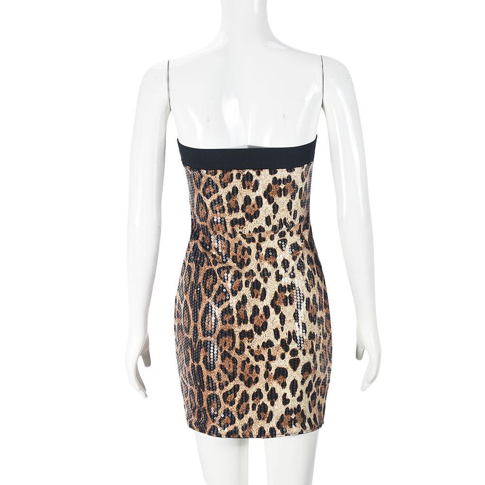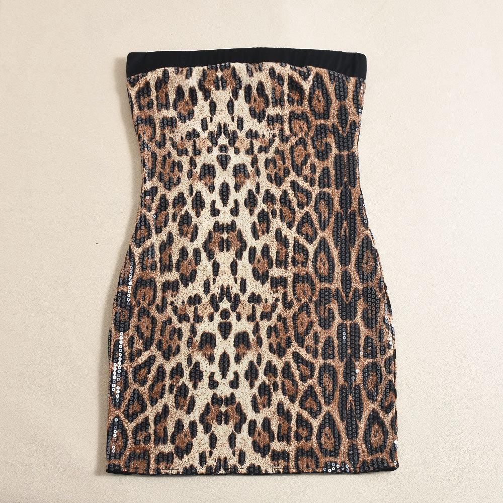Ropa de Mujer Europea y Americana Transfronteriza Primavera Nueva Llegada Lentejuelas Estampado de Leopardo Color en Contraste Cuello de un Solo Hombro Sexy Chica Picante Sin Tirantes Falda de Cadera