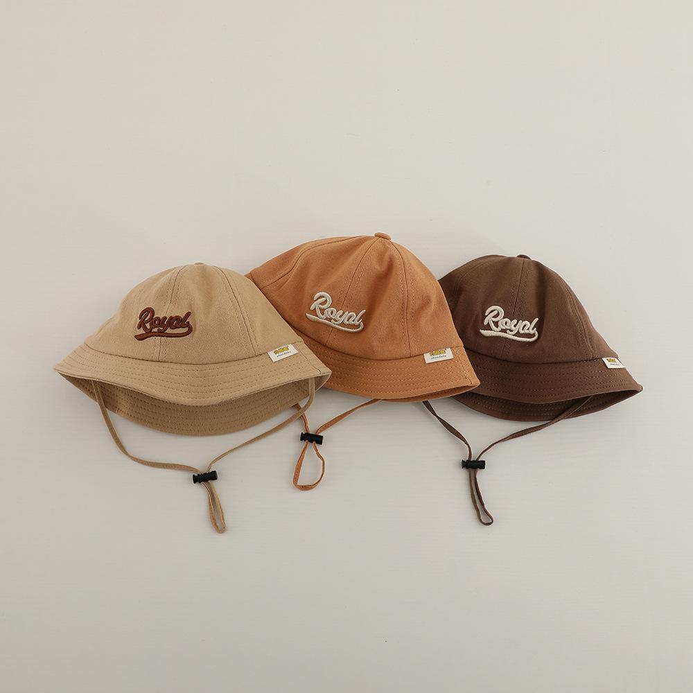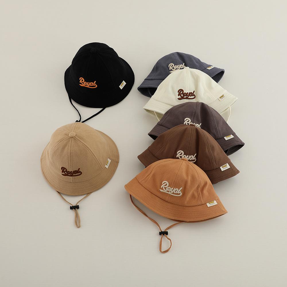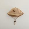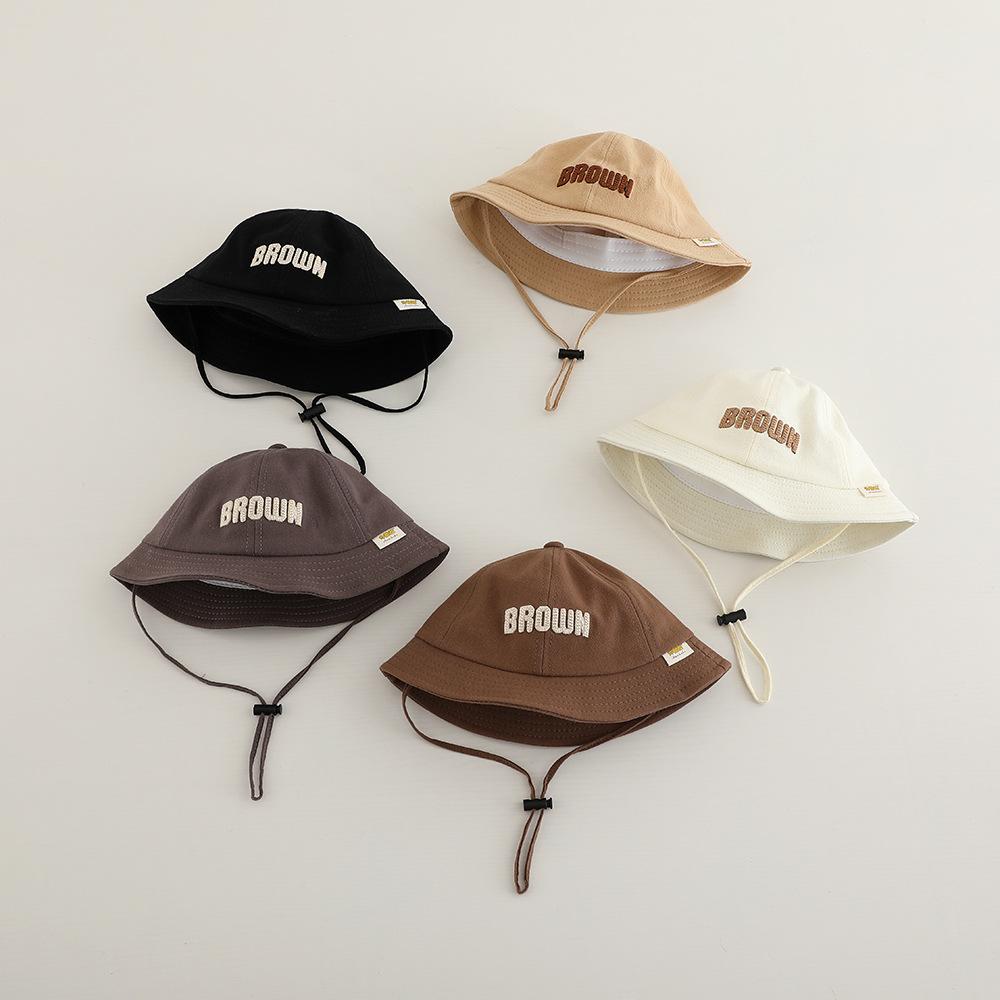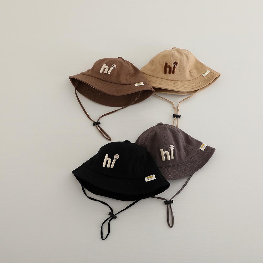 Sombrero de pescador infantil estilo coreano con protección solar y letra bordada, nuevo para primavera y otoño, sombrero para el sol para exteriores, ala ancha, cuerda a prueba de viento, sombrero tipo cubeta